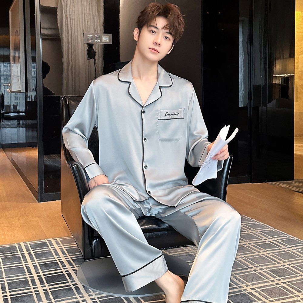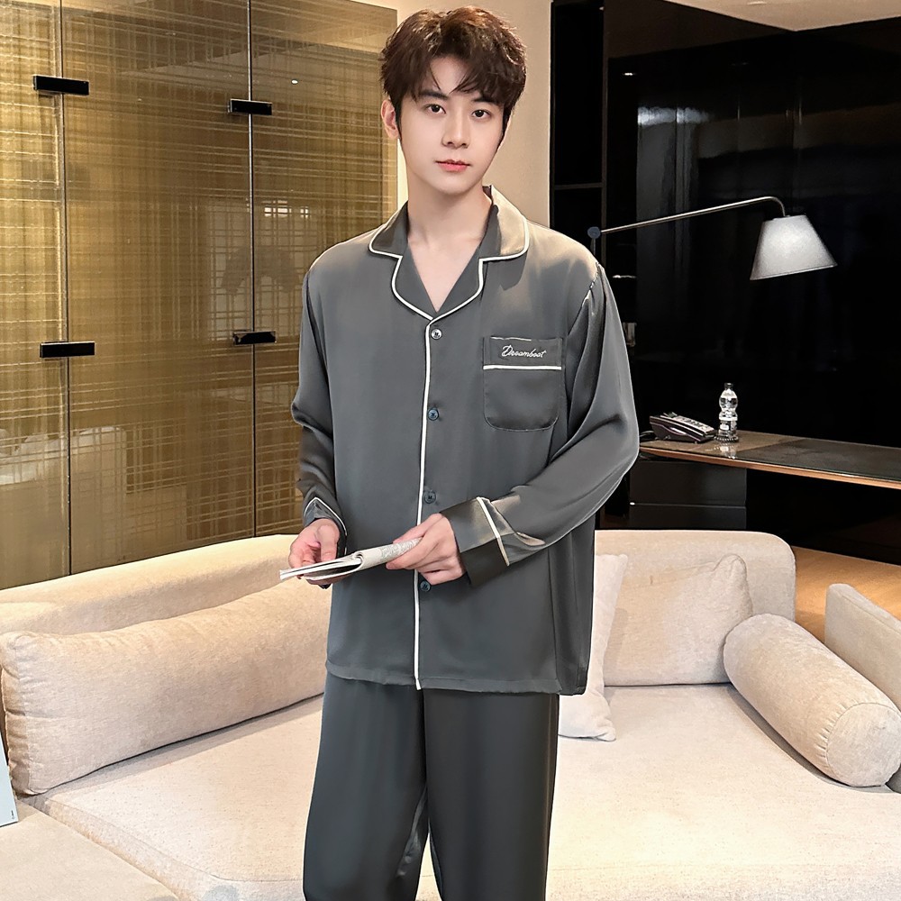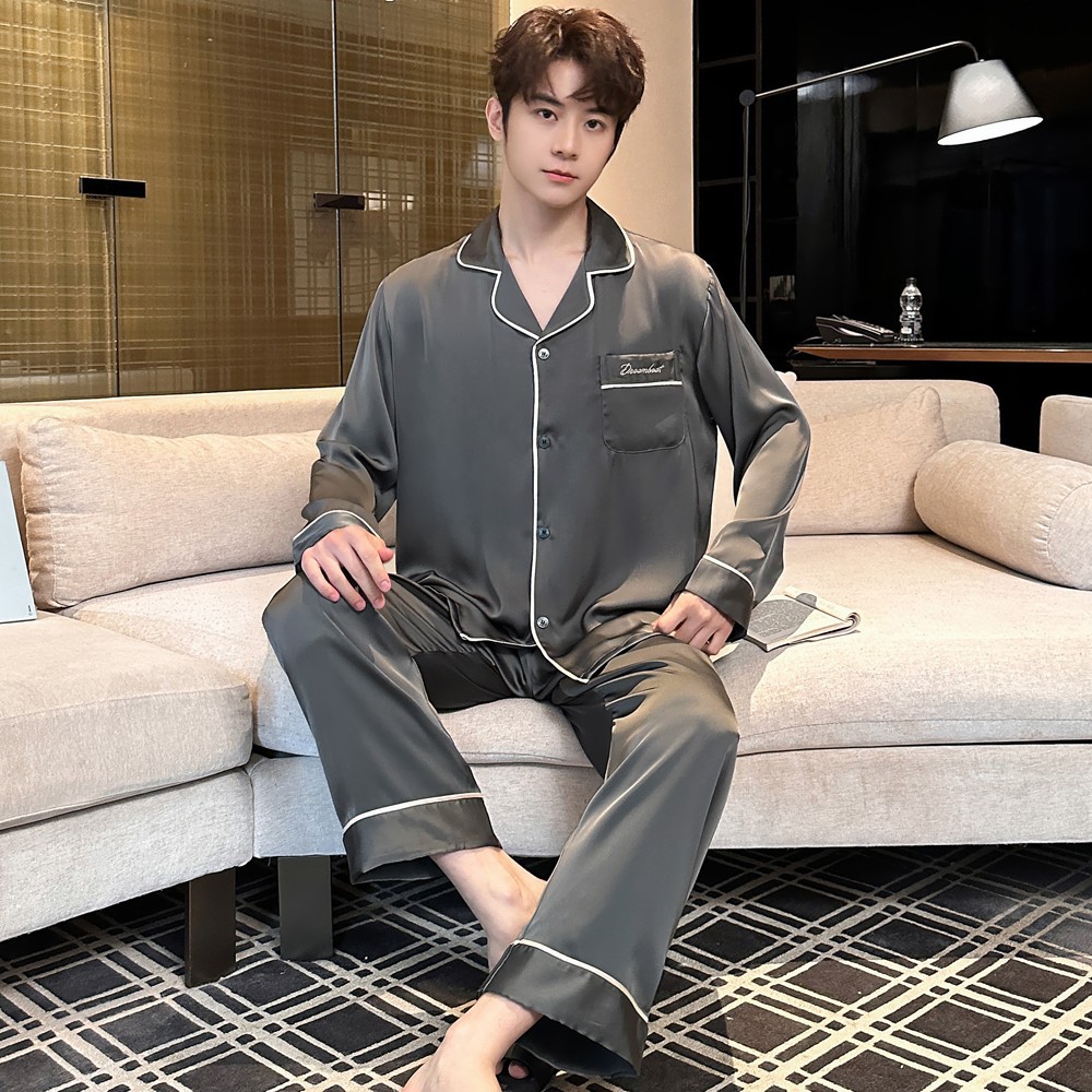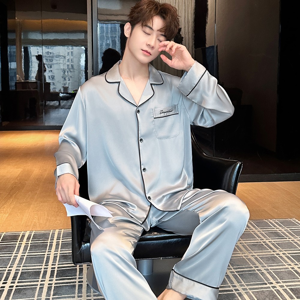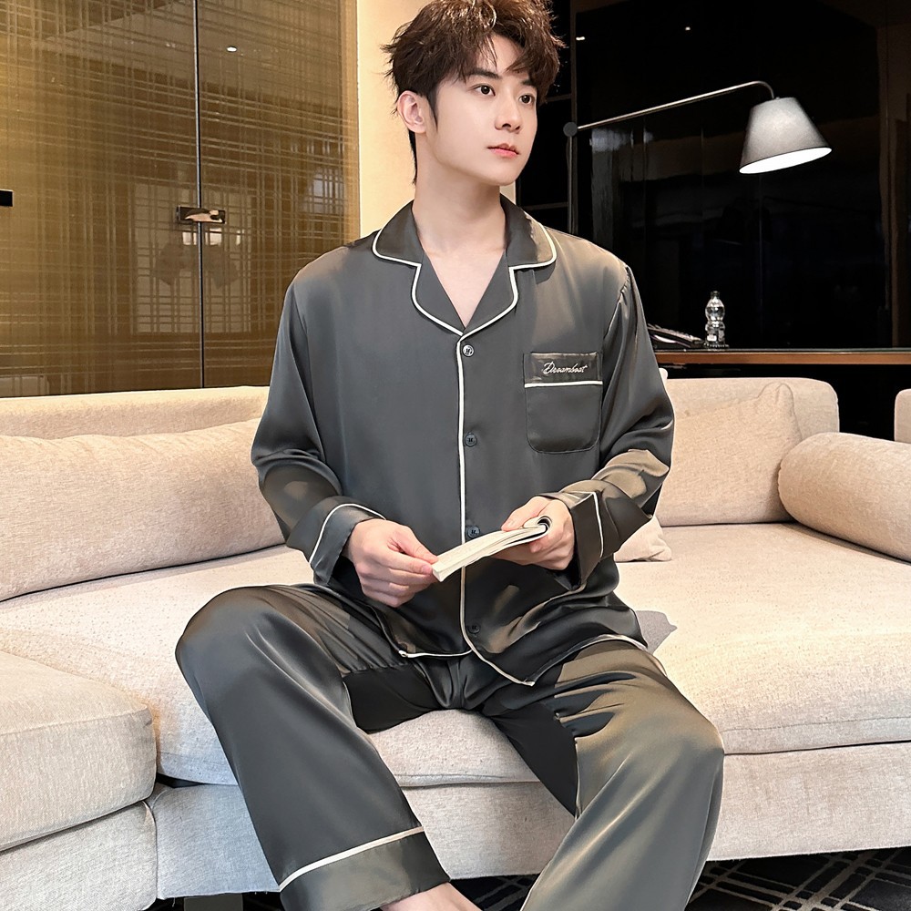 2025 새로운 고급 아세트산 원단 남성 잠옷 간단한 얇은 긴팔 바지 세트