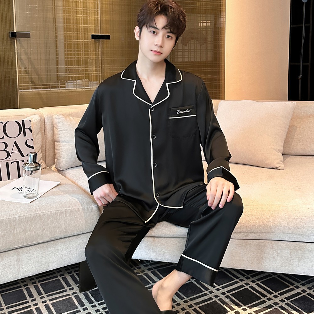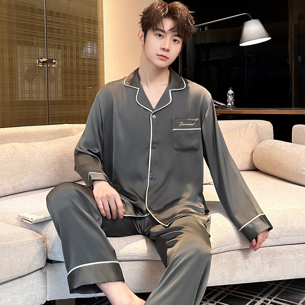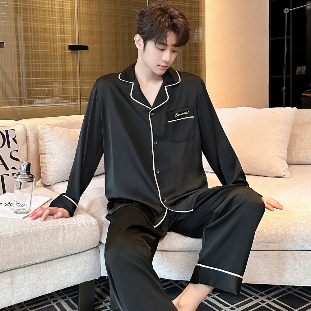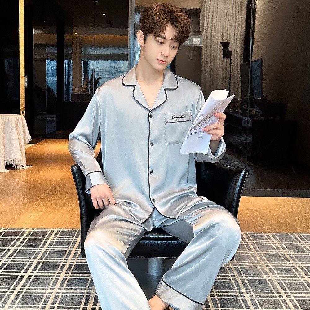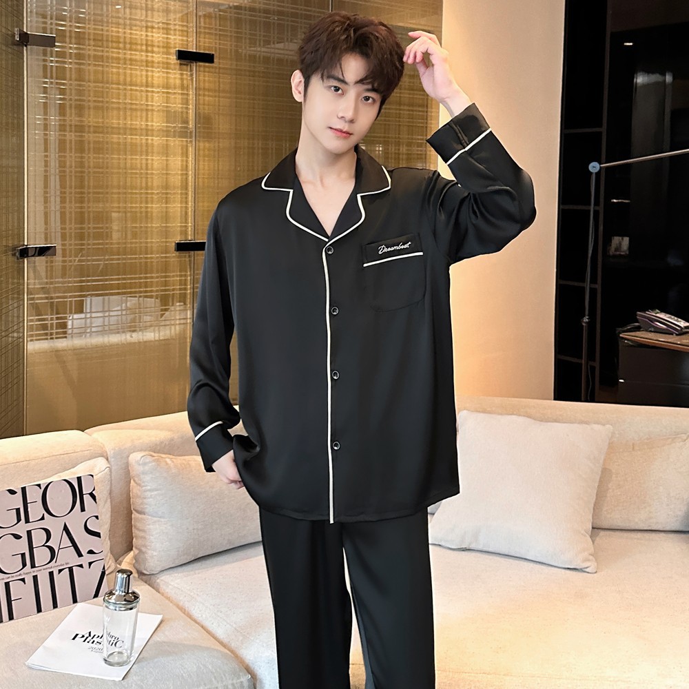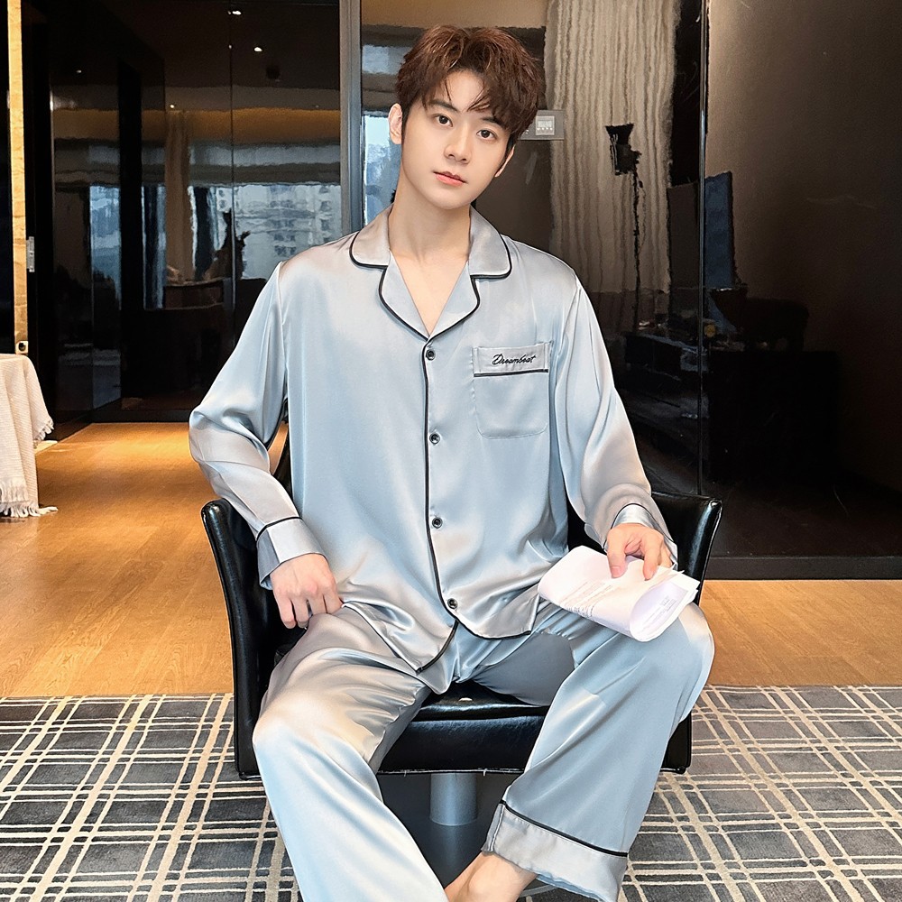 2025 새로운 고급 아세트산 원단 남성 잠옷 간단한 얇은 긴팔 바지 세트