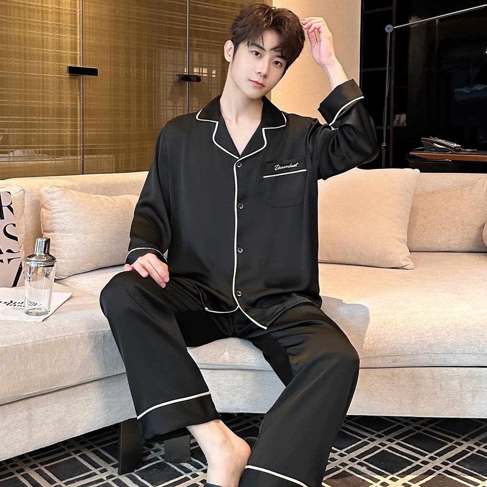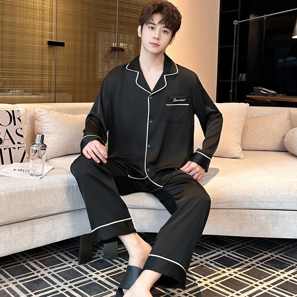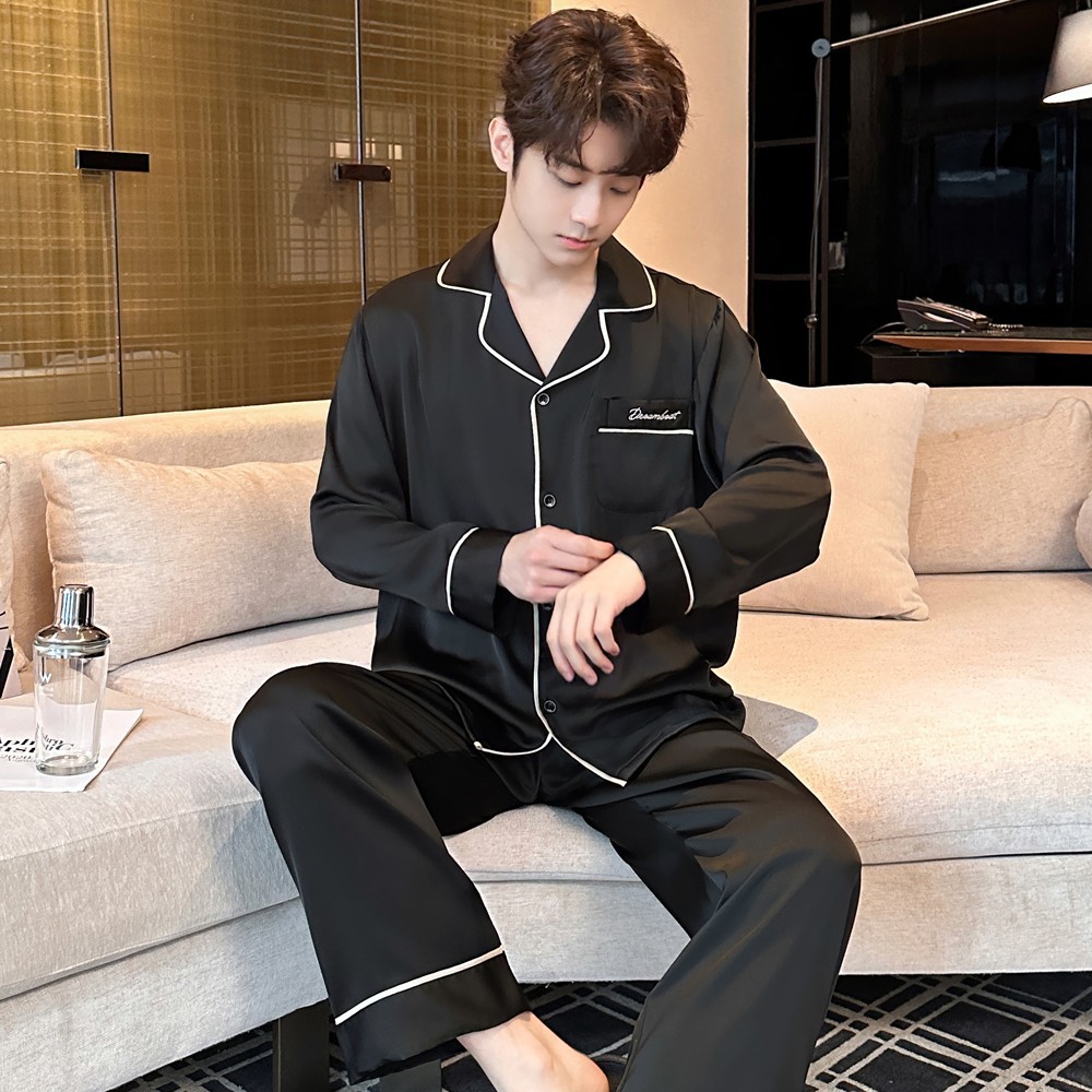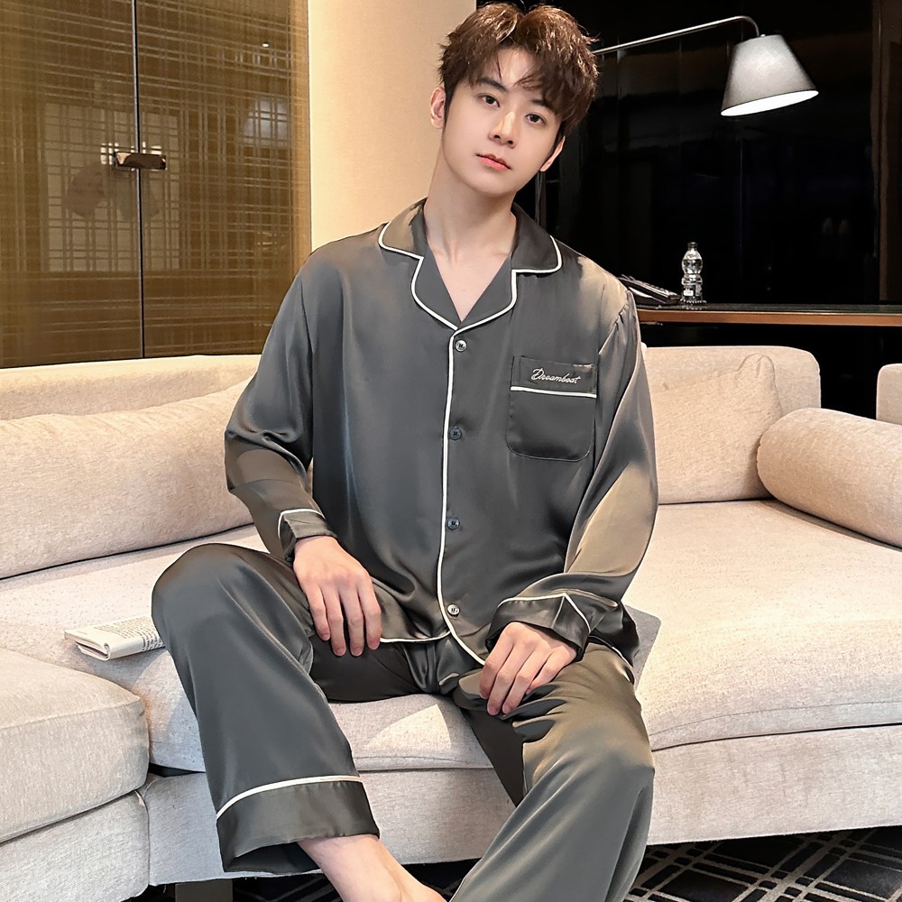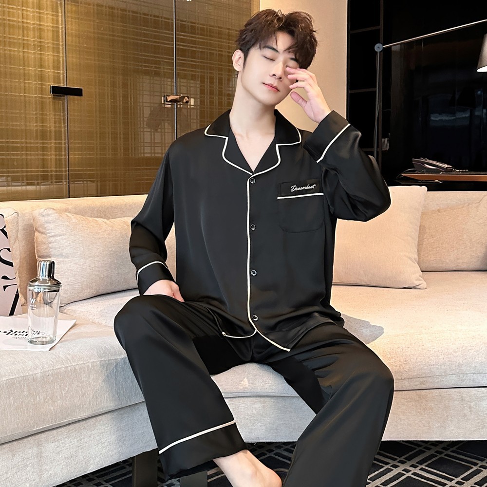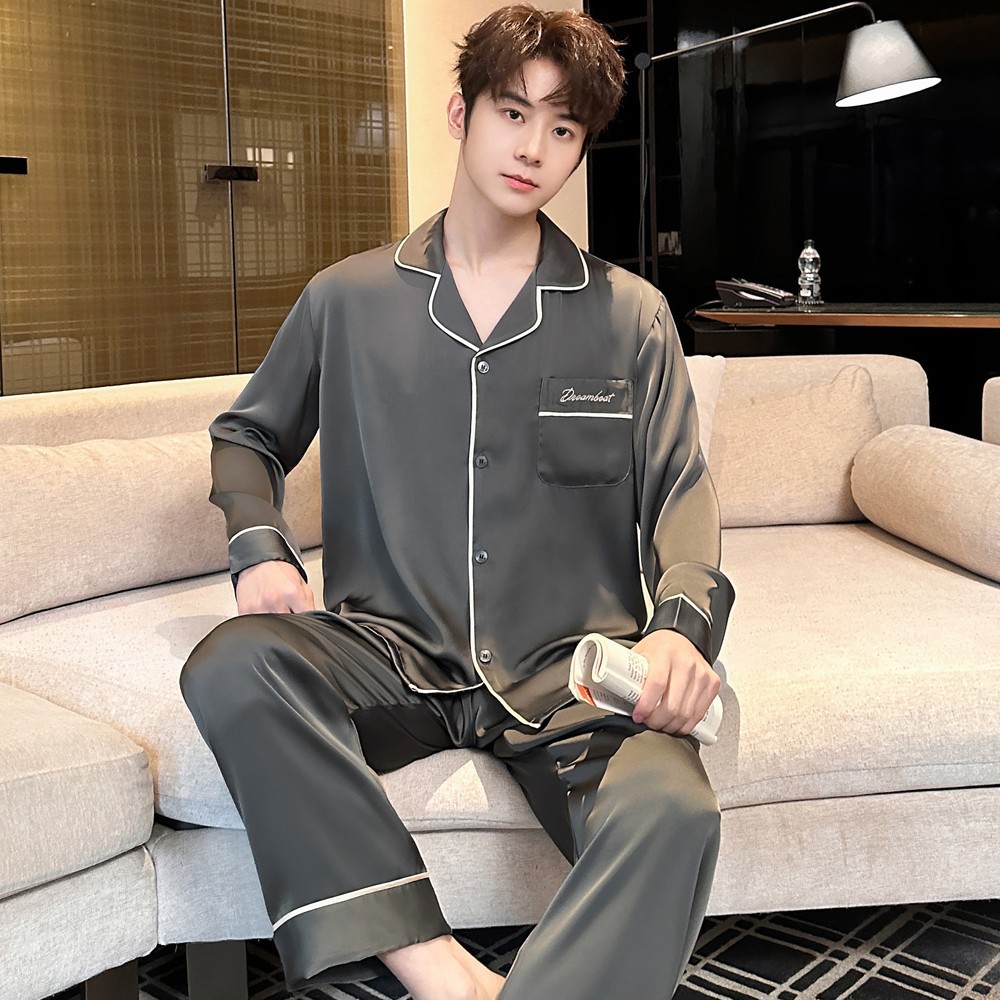 2025 새로운 고급 아세트산 원단 남성 잠옷 간단한 얇은 긴팔 바지 세트