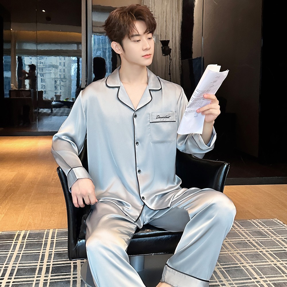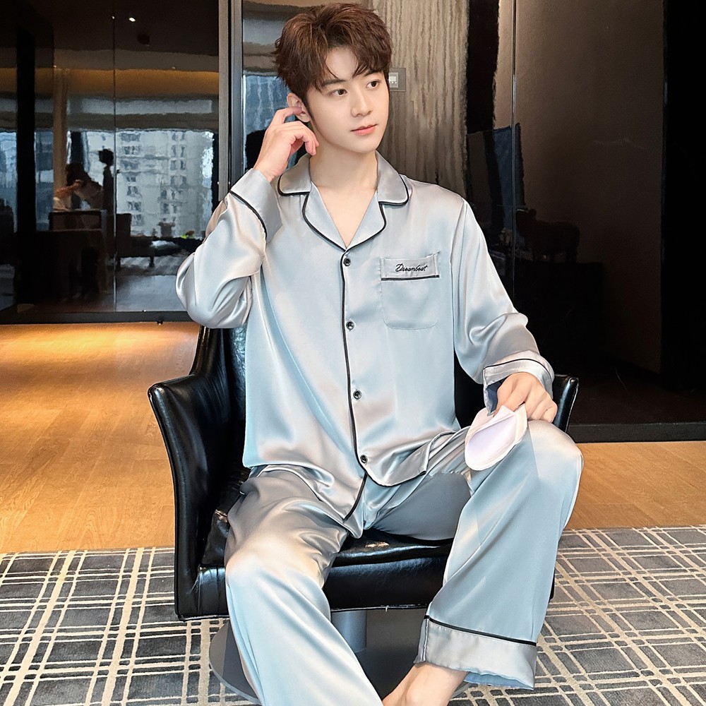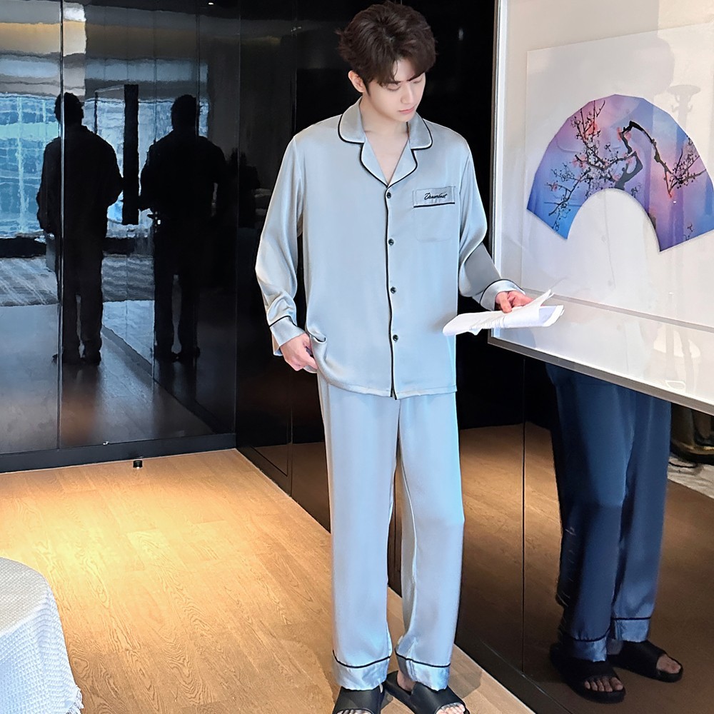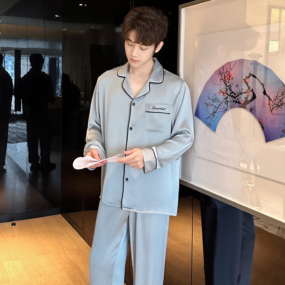 2025 새로운 고급 아세트산 원단 남성 잠옷 간단한 얇은 긴팔 바지 세트스토어 가기