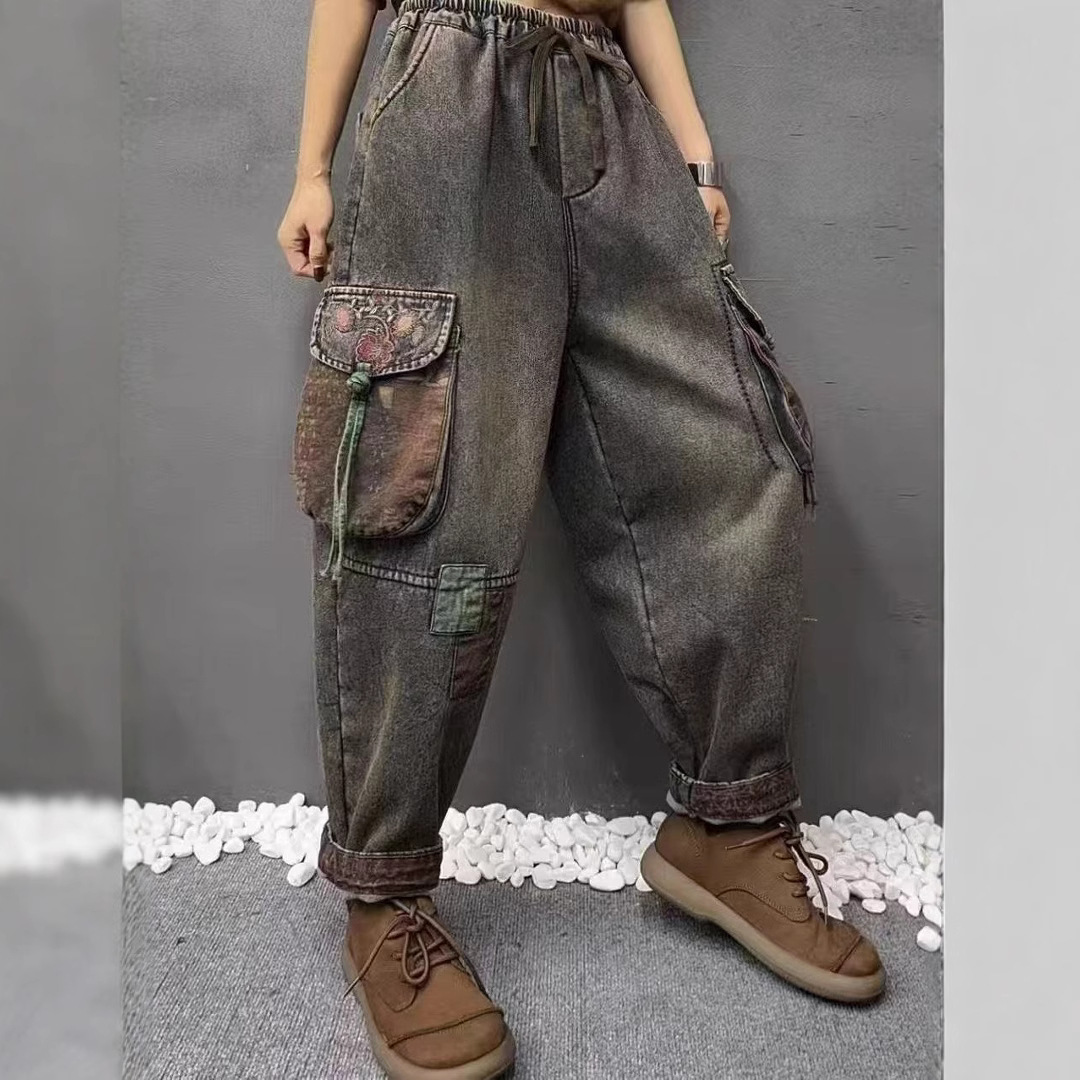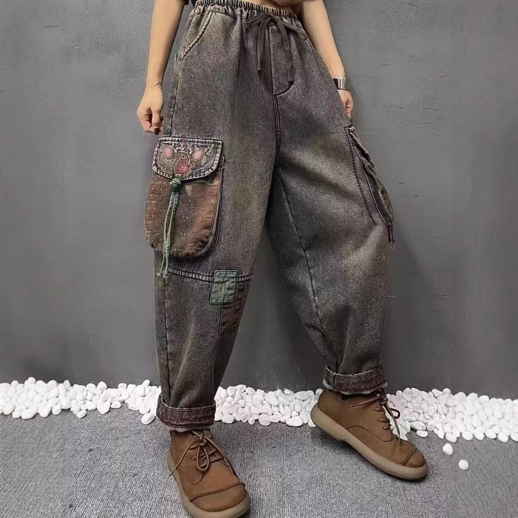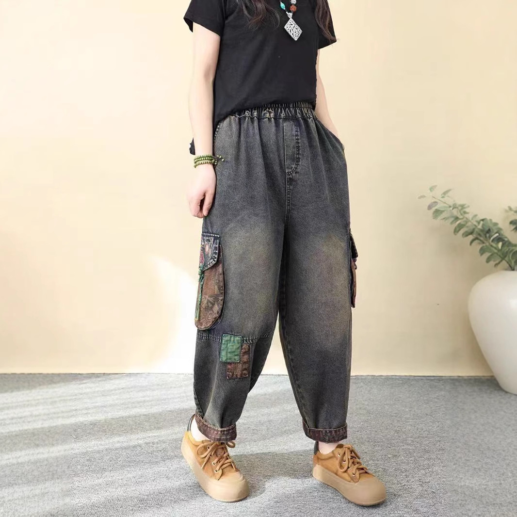 2025 봄 청바지 여성의 새로운 빈티지 오래된 느슨한 캐주얼 자수 꽃 청바지 느슨한 허리 바지스토어 가기