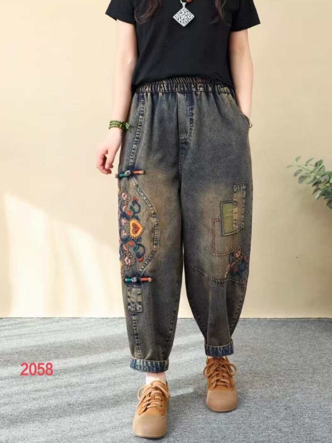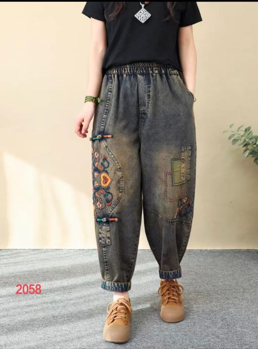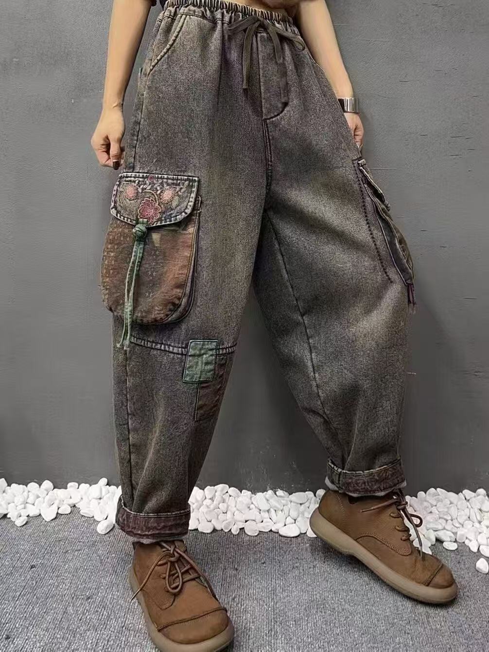 2025 봄 청바지 여성의 새로운 빈티지 오래된 느슨한 캐주얼 자수 꽃 청바지 느슨한 허리 바지스토어 가기