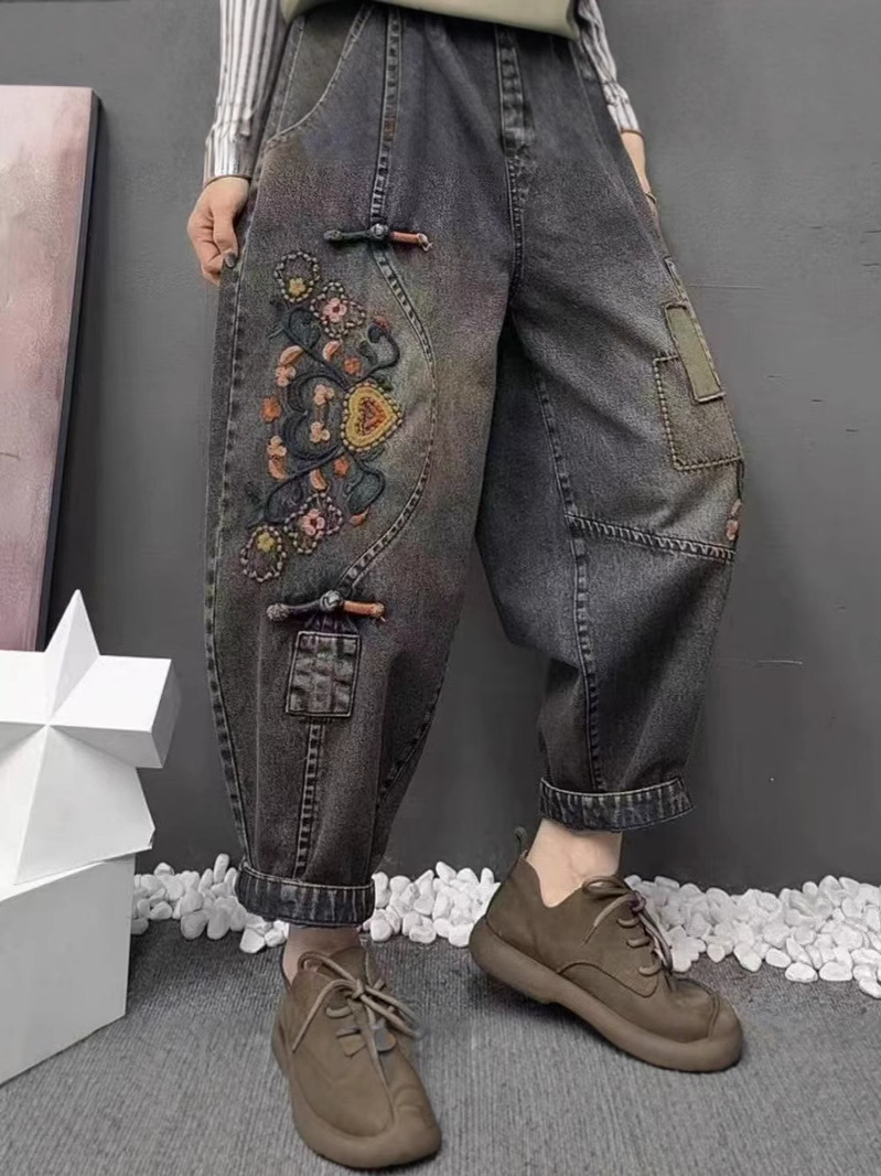 2025 봄 청바지 여성의 새로운 빈티지 오래된 느슨한 캐주얼 자수 꽃 청바지 느슨한 허리 바지
