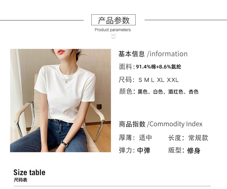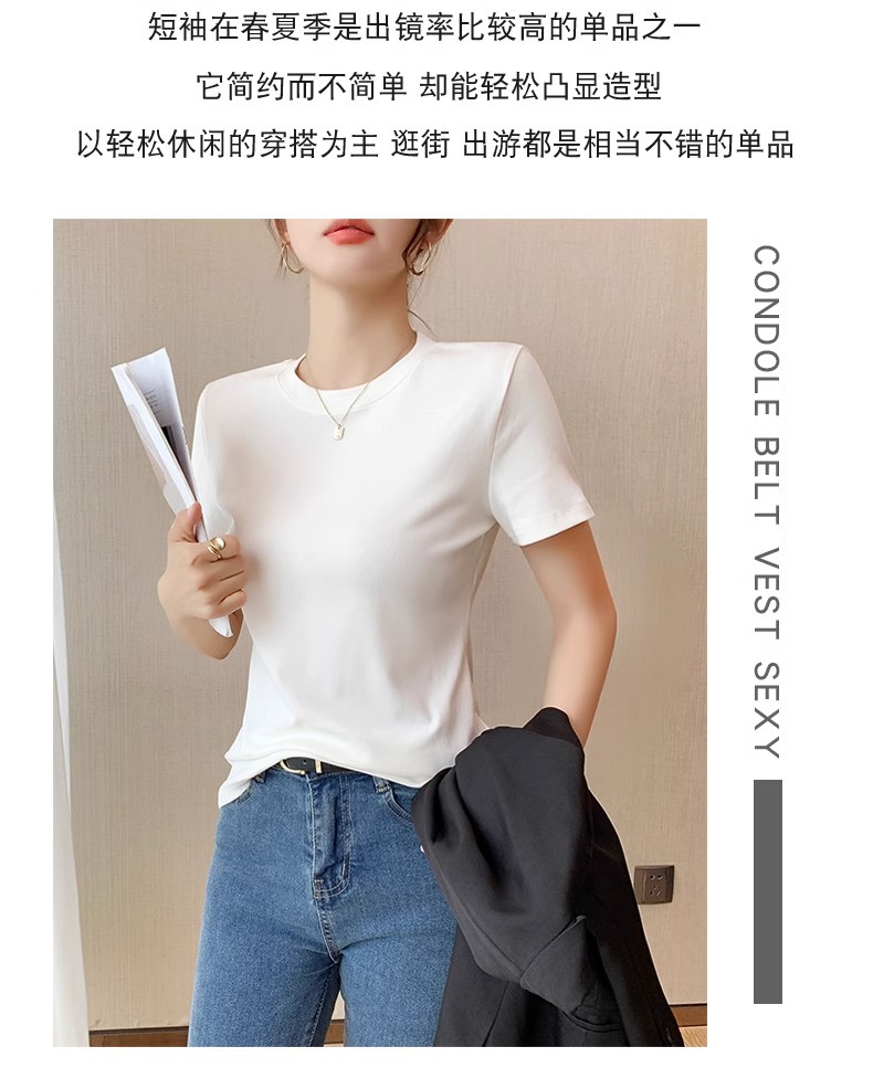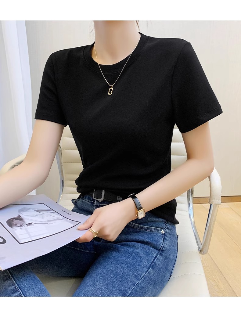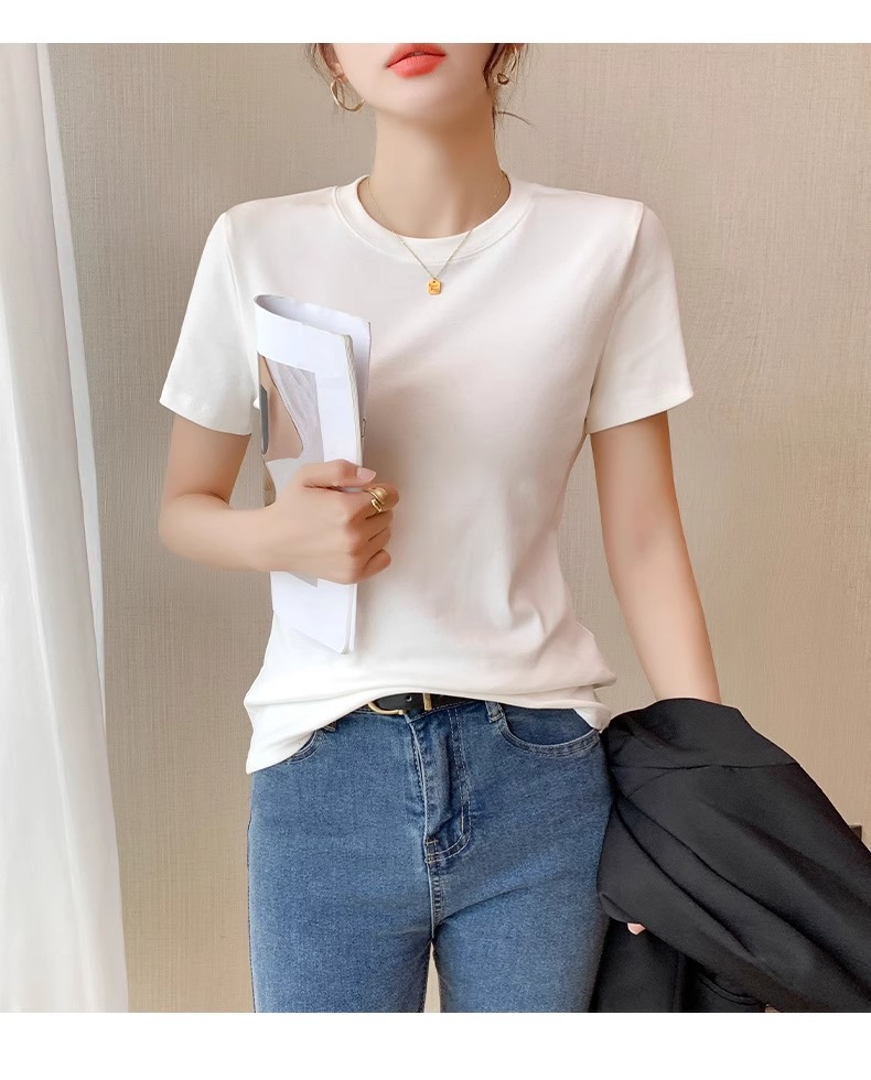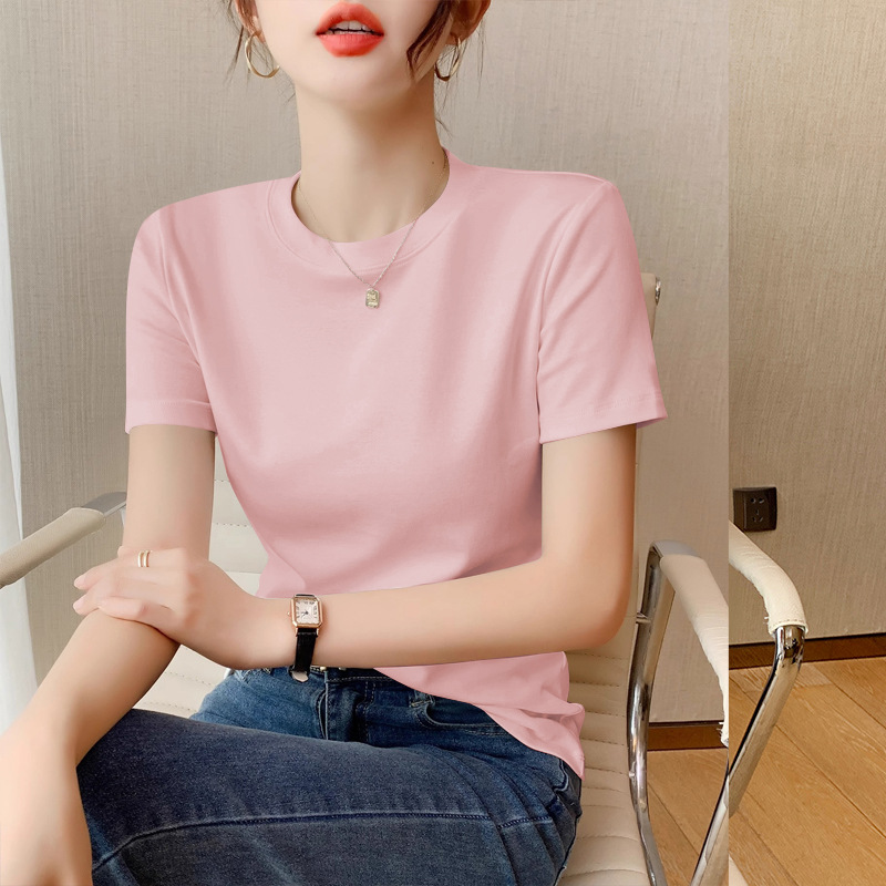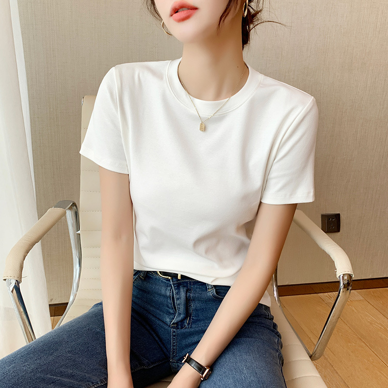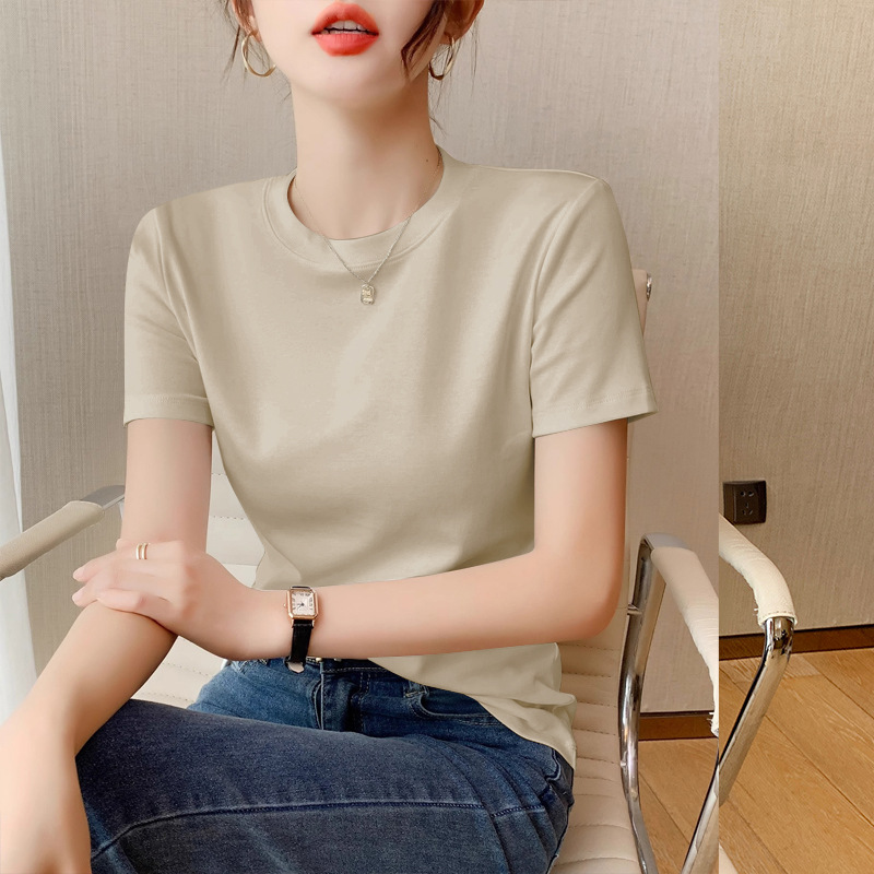 코튼 반팔 티셔츠 여성용 2025 년 여름 새 어깨 슬림핏 슬리밍 티셔츠 반소매 라운드 넥 베이스 탑