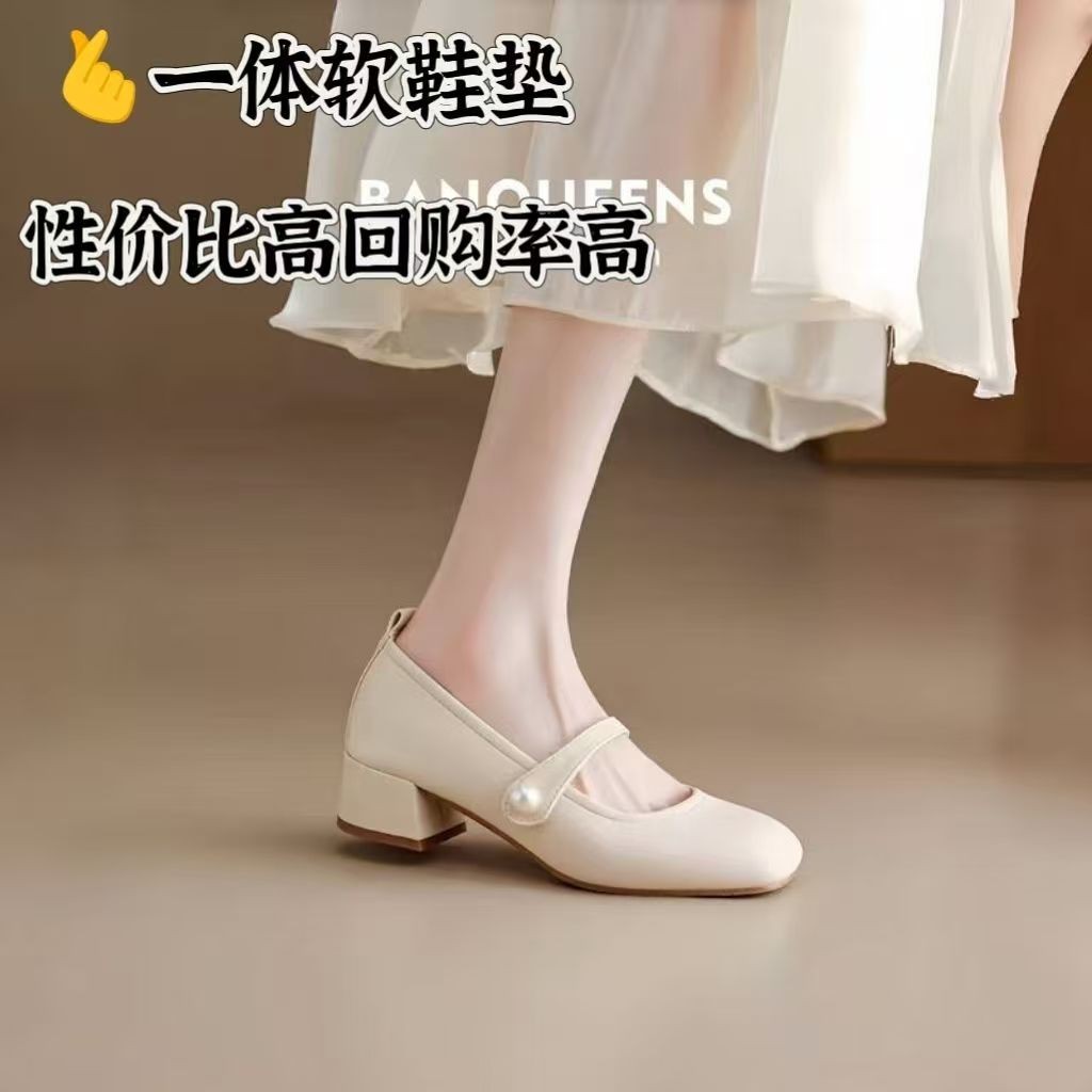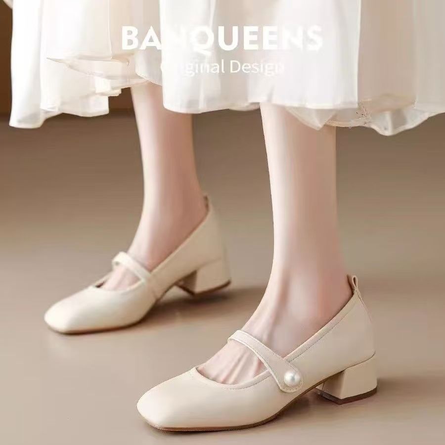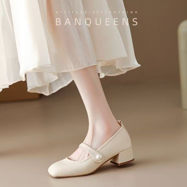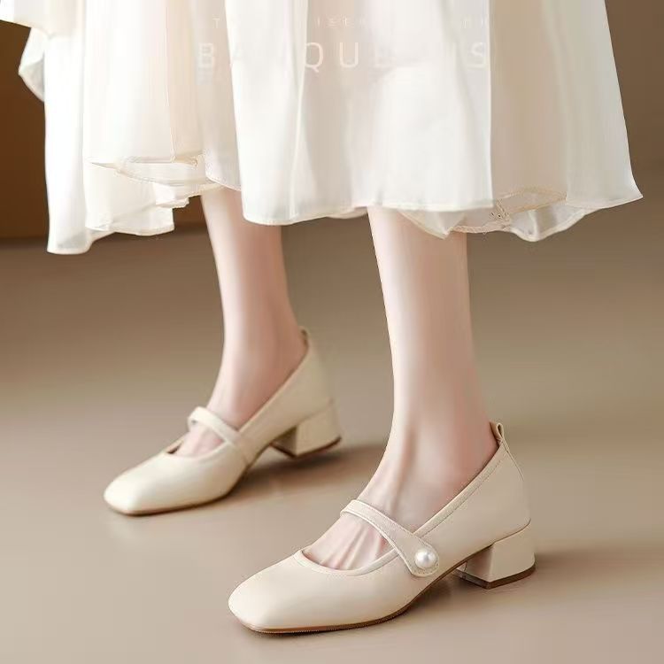 진주 광장 발가락 프랑스 메리 제인 신발 부드러운 가죽 두꺼운 뒤꿈치 치마 기질 싱글 레이어 신발 소프트 솔 미드 힐 페어리 신발 젠틀