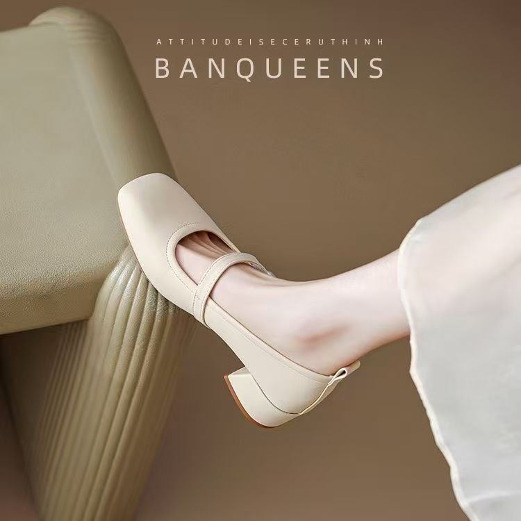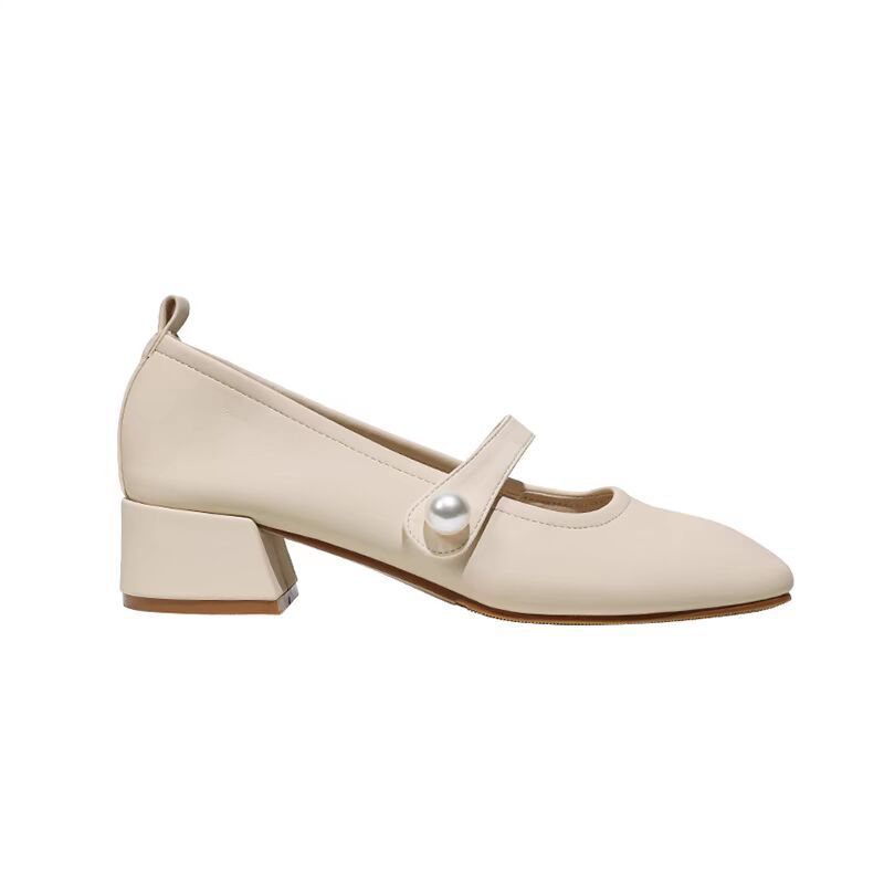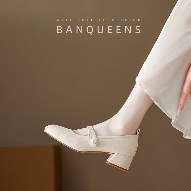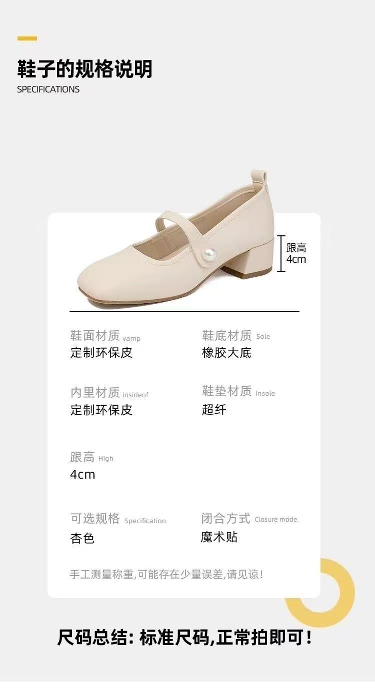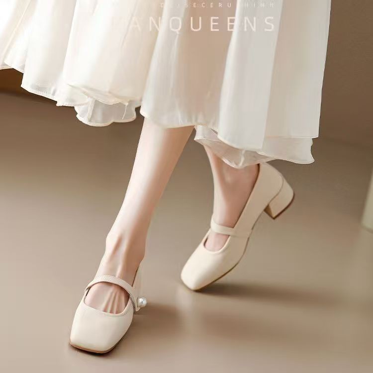 진주 광장 발가락 프랑스 메리 제인 신발 부드러운 가죽 두꺼운 뒤꿈치 치마 기질 싱글 레이어 신발 소프트 솔 미드 힐 페어리 신발 젠틀