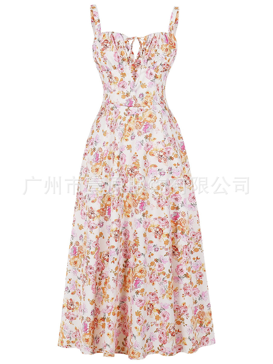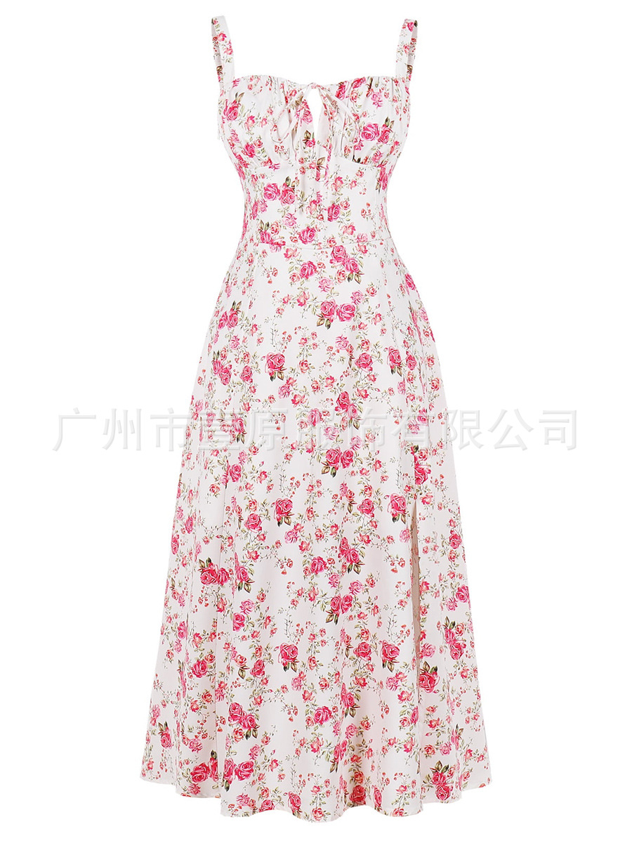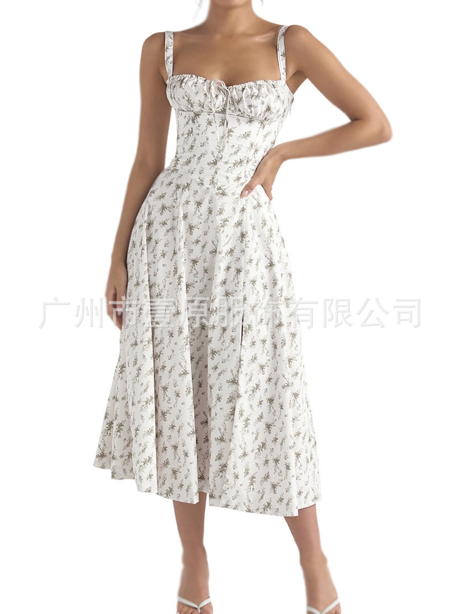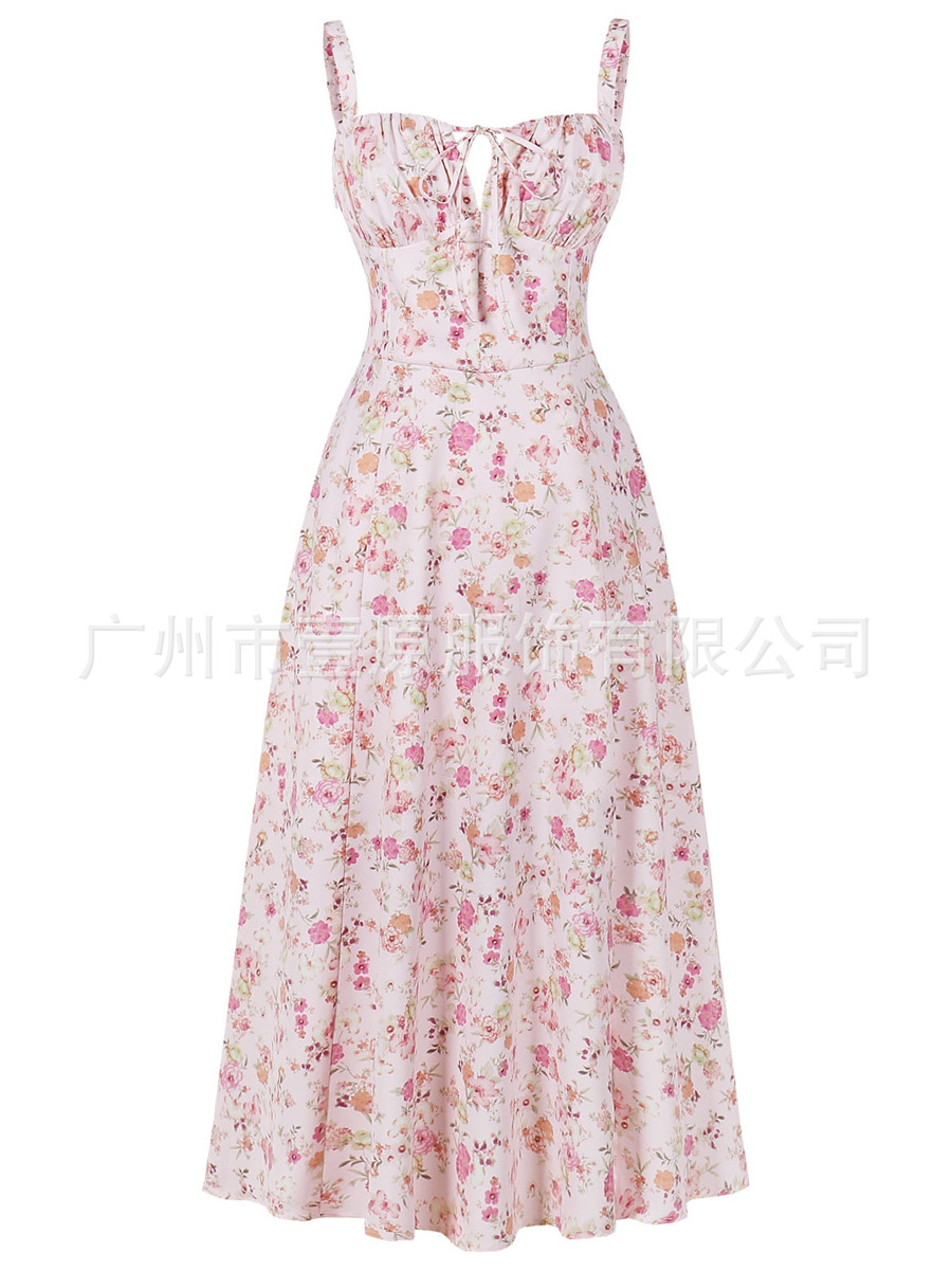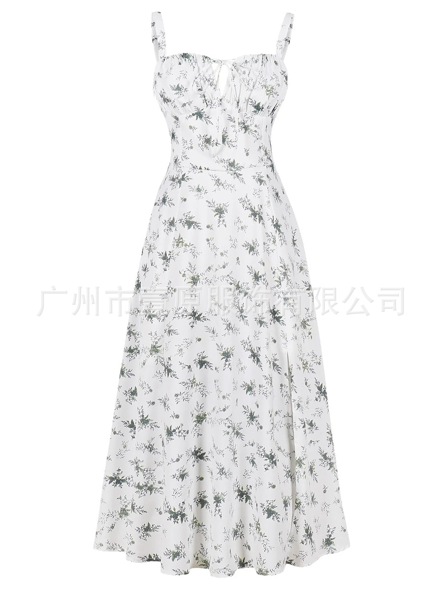 국경 간 유럽과 미국 2025 아마존 여름 새로운 인쇄 레이스 업 슬링 원피스 백 스트랩 허리 긴 원피스