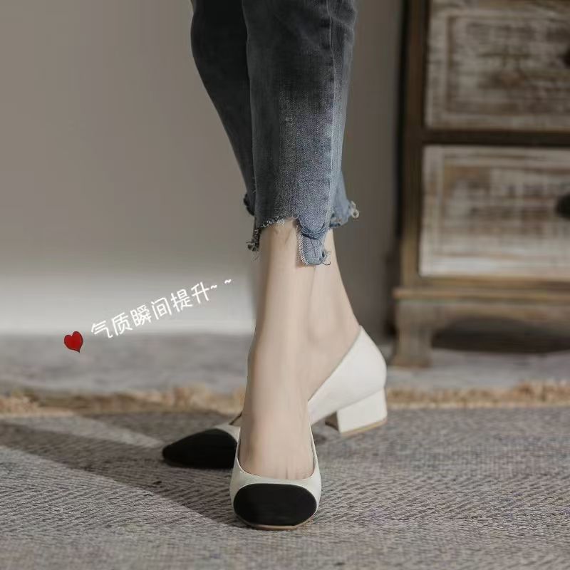 여성을 위한 대외 무역 인기 컬러 블록 스타일의 두꺼운 굽 싱글 슈즈, 봄 신상 중간 굽의 편안한 펌프스 슈즈, 프렌치 하이힐스토어 가기