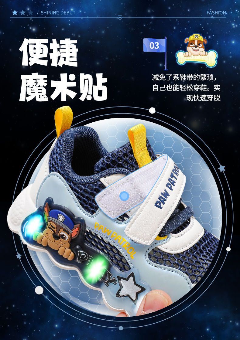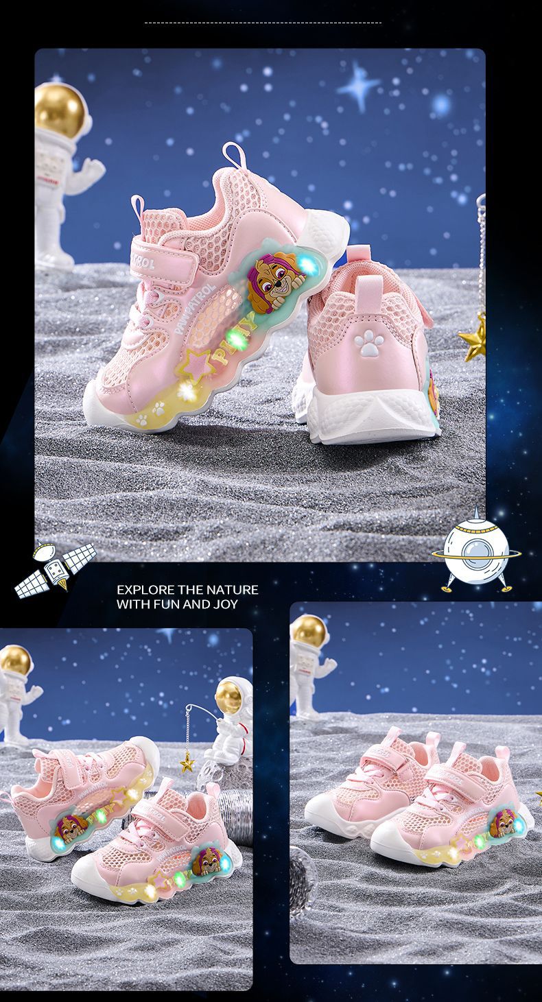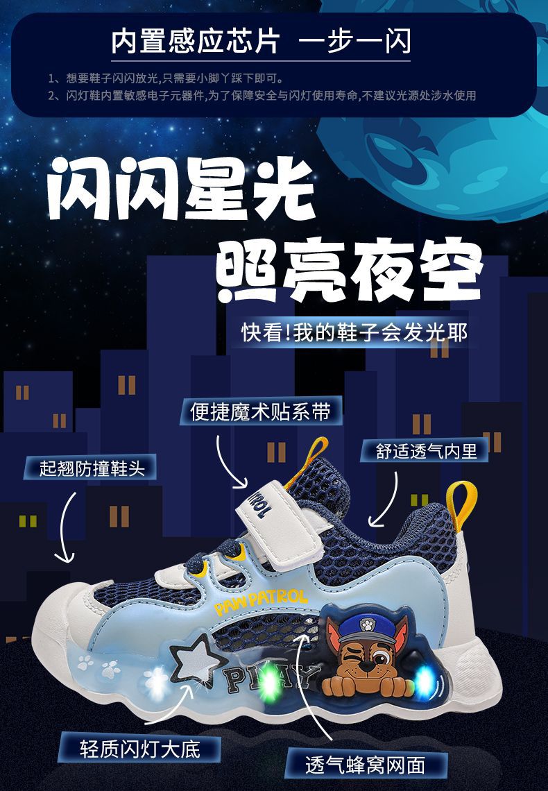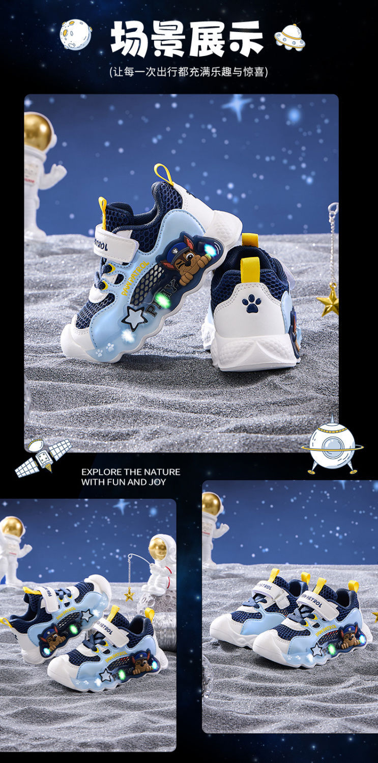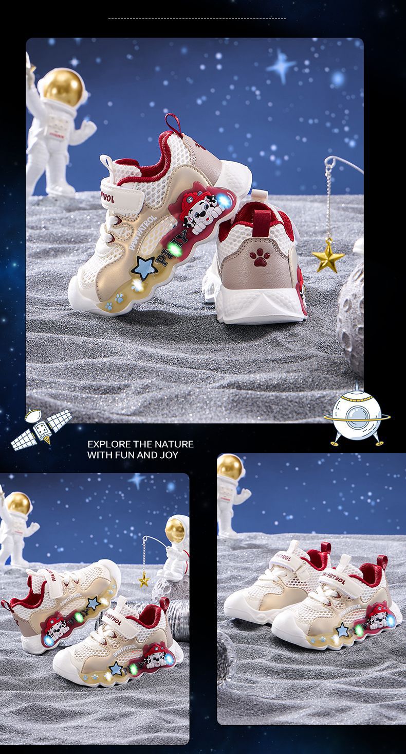 2025 Wang Wang 팀 봄 새로운 통기성 메쉬 아기 소년과 소녀는 어린이 안티 킥 부드러운 바닥을 운동화 번쩍이는 불빛을 나갑니다.스토어 가기
