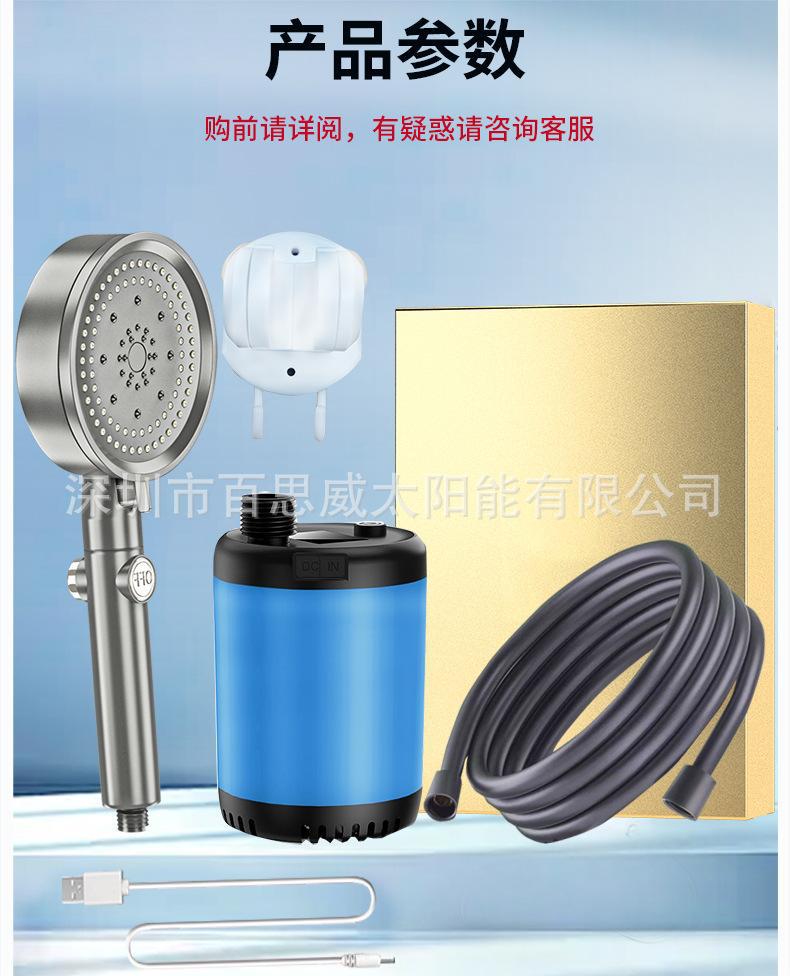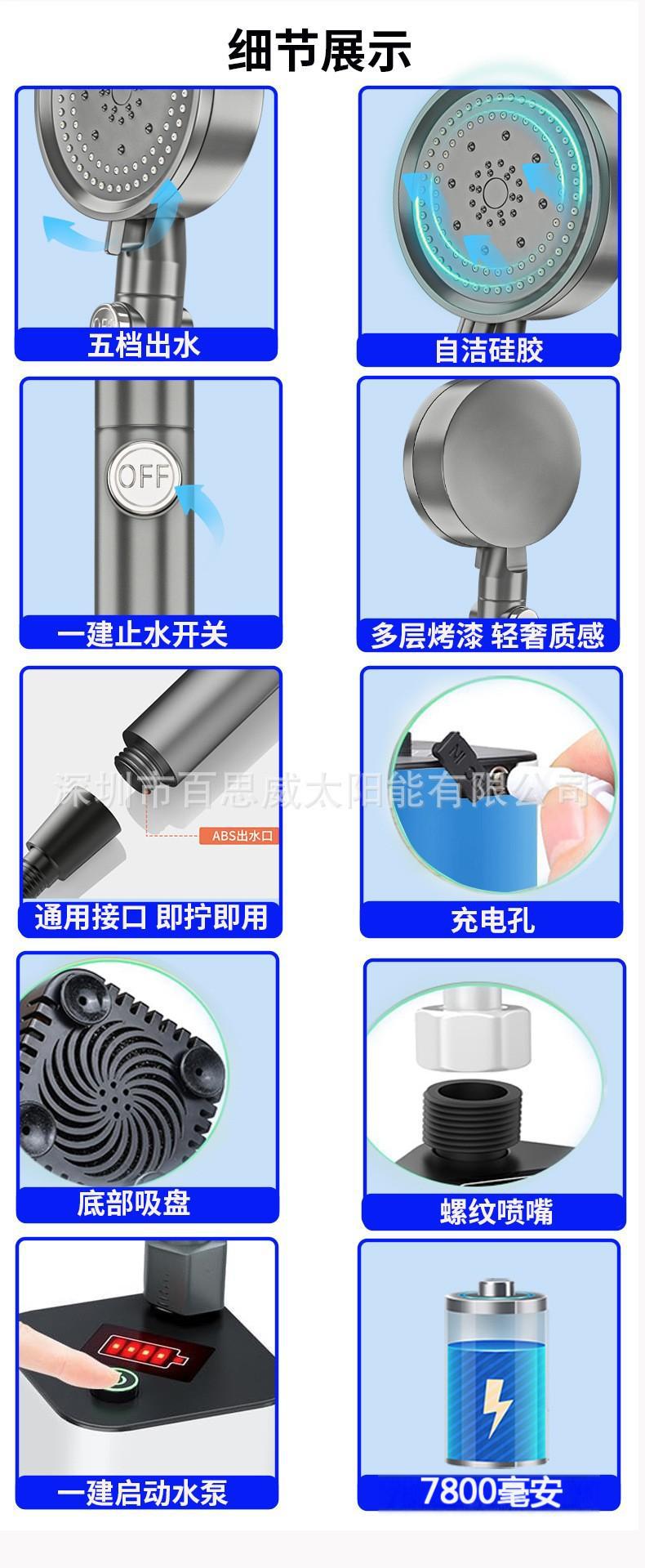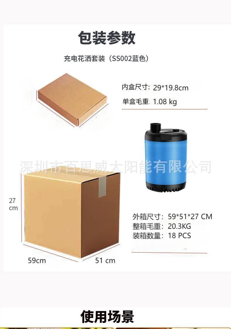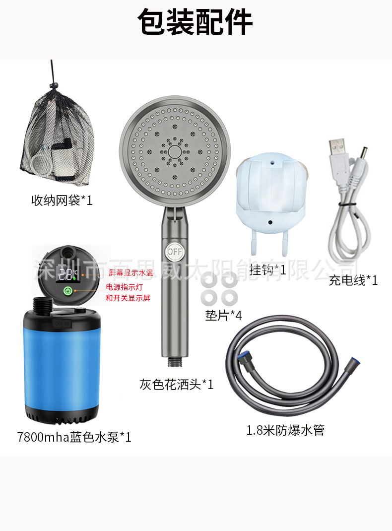 注意:淋浴器套装为纸盒装,单水泵+充电线无包装盒及说明书