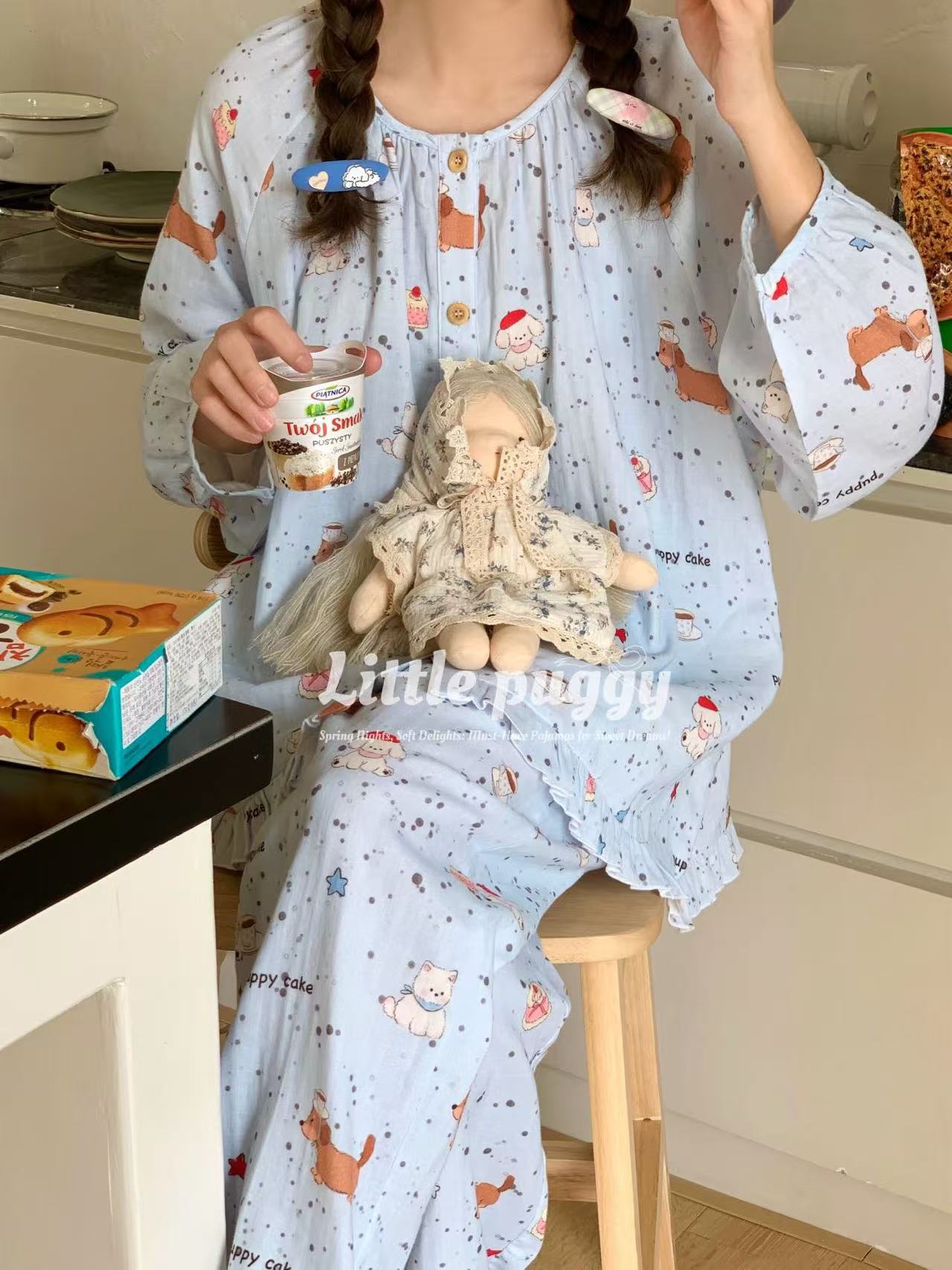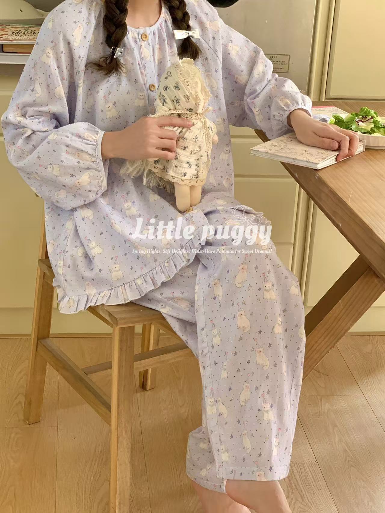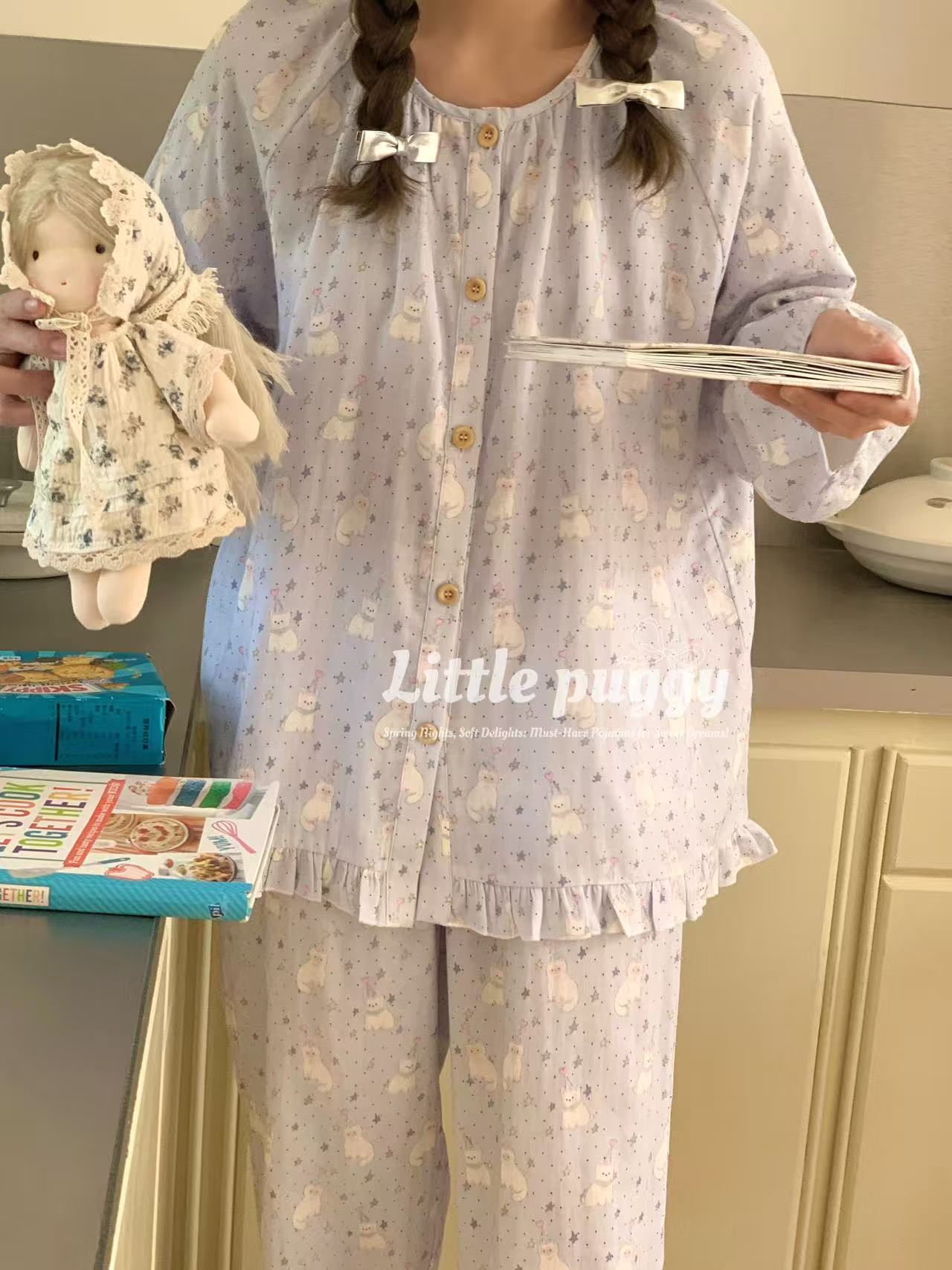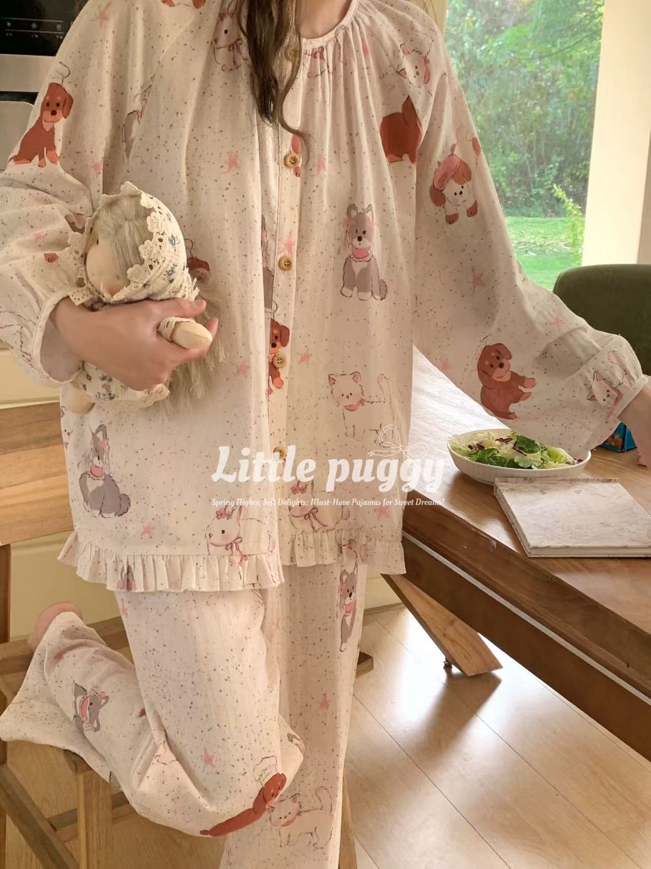 작은 puggy25 봄/여름 한국 스타일 더블 거즈 부드러운 고양이 잠옷