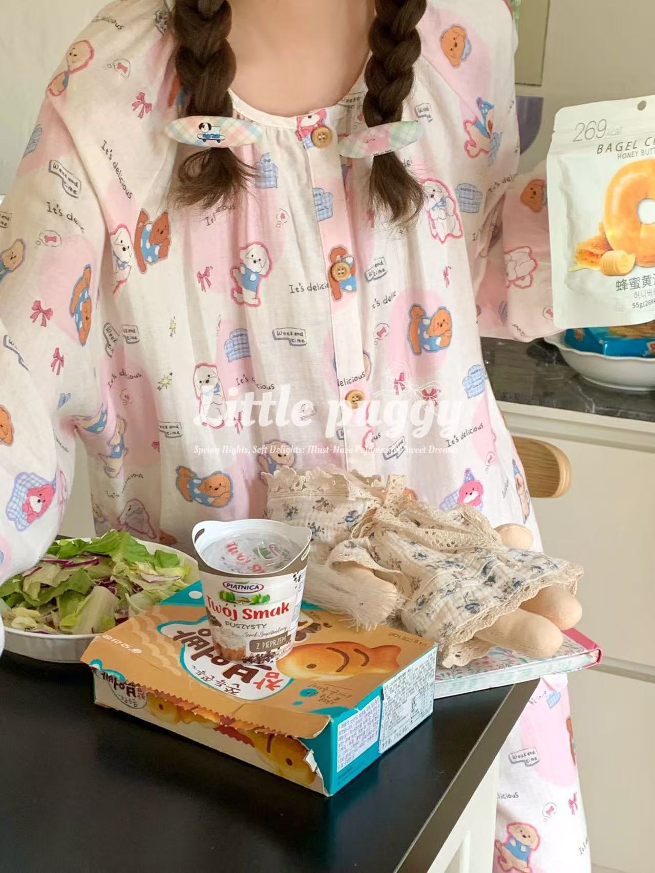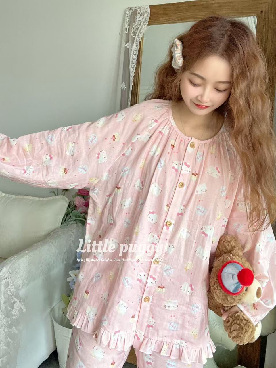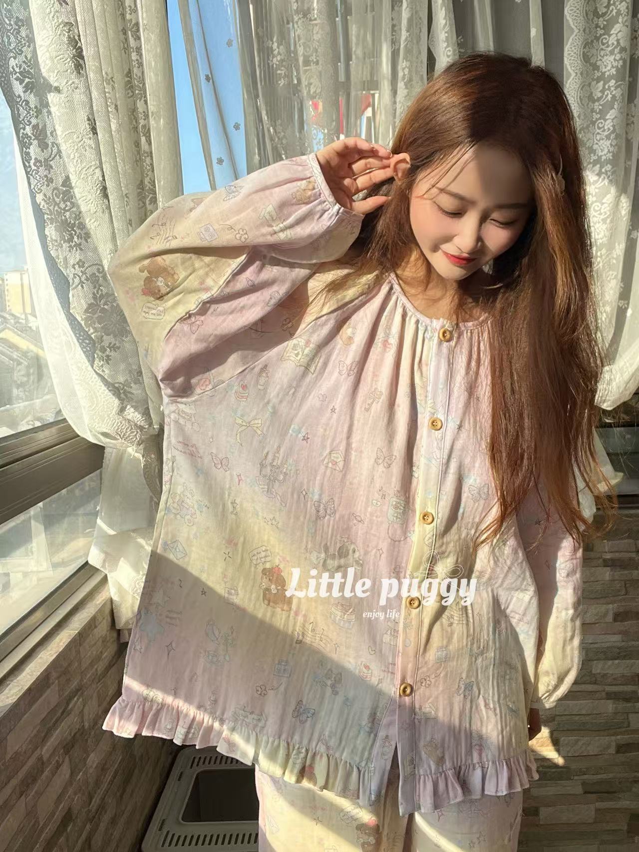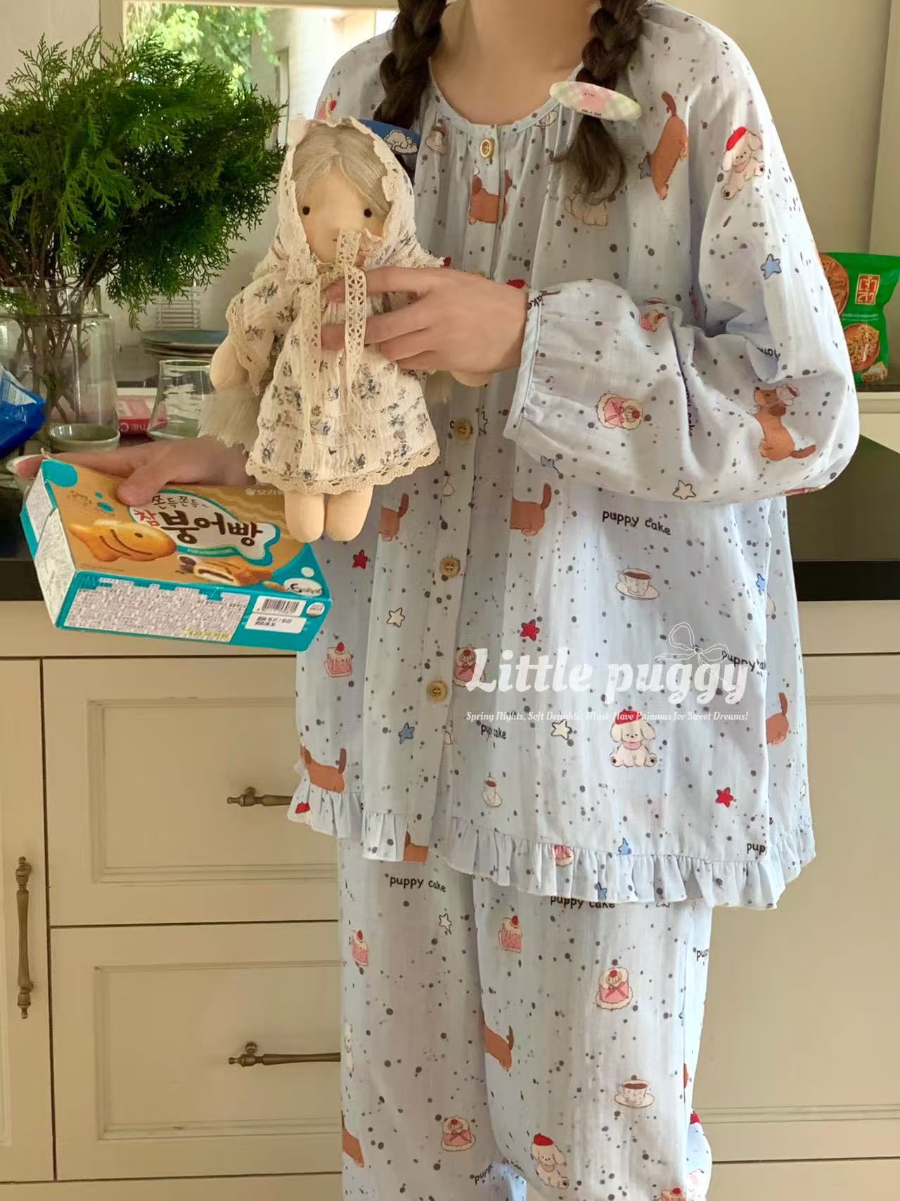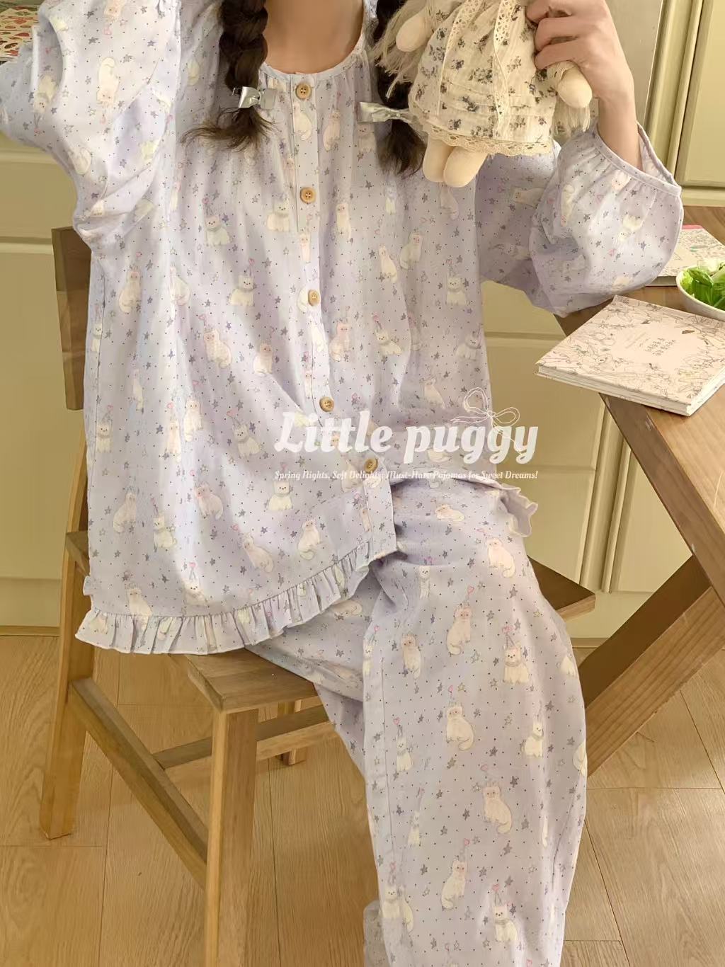작은 puggy25 봄/여름 한국 스타일 더블 거즈 부드러운 고양이 잠옷