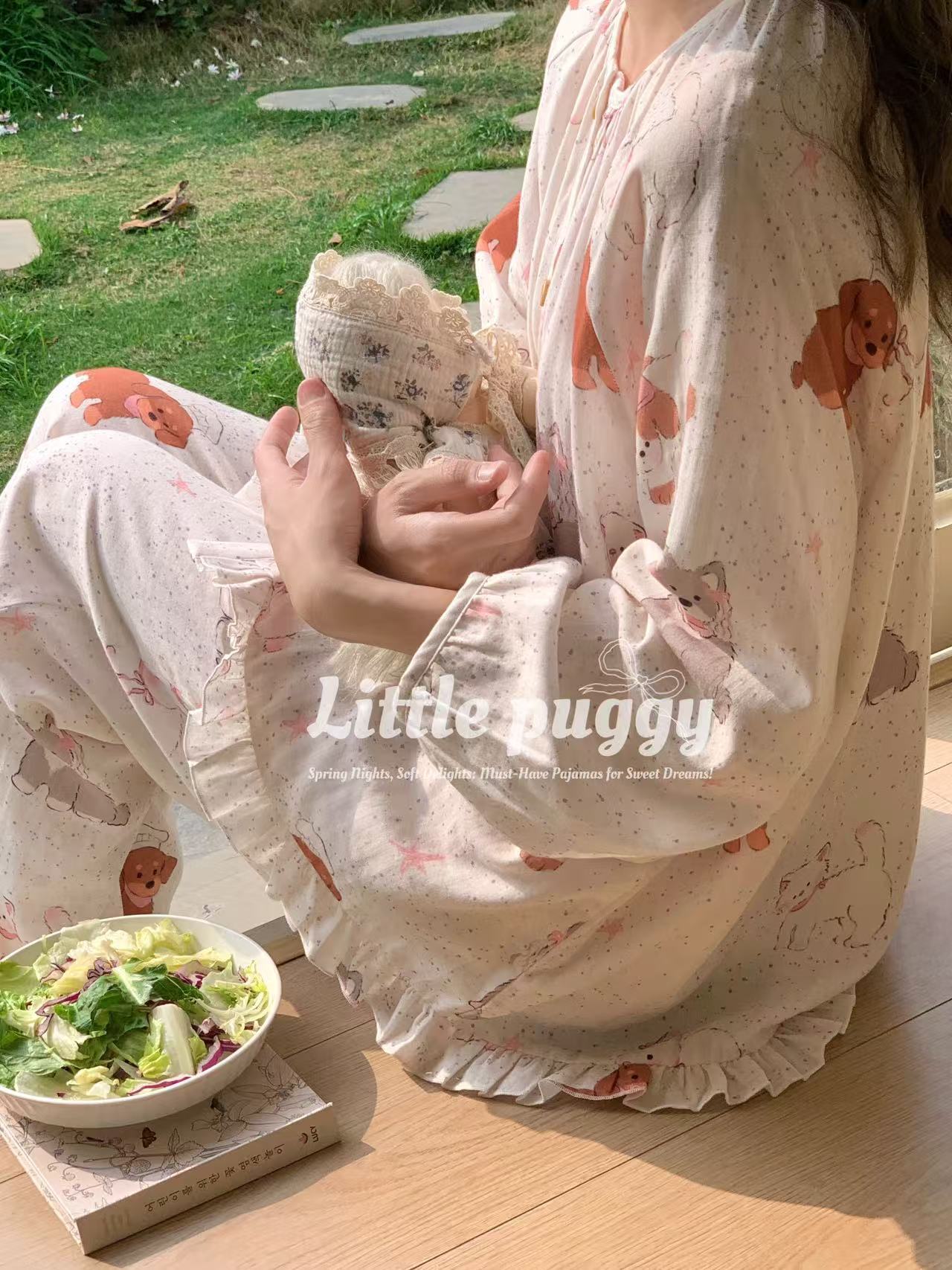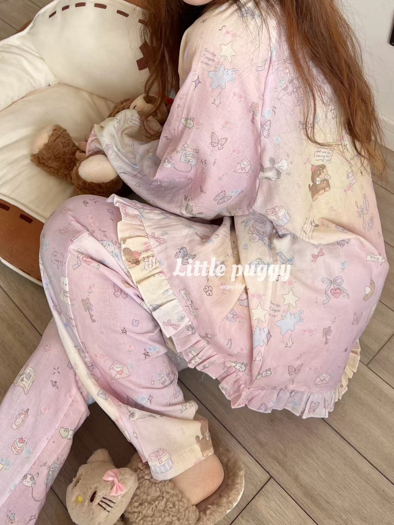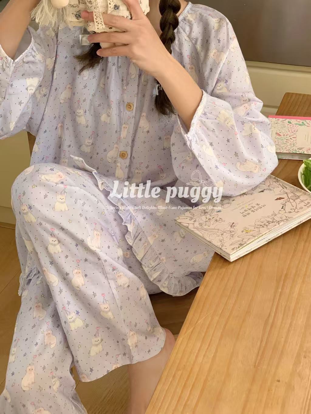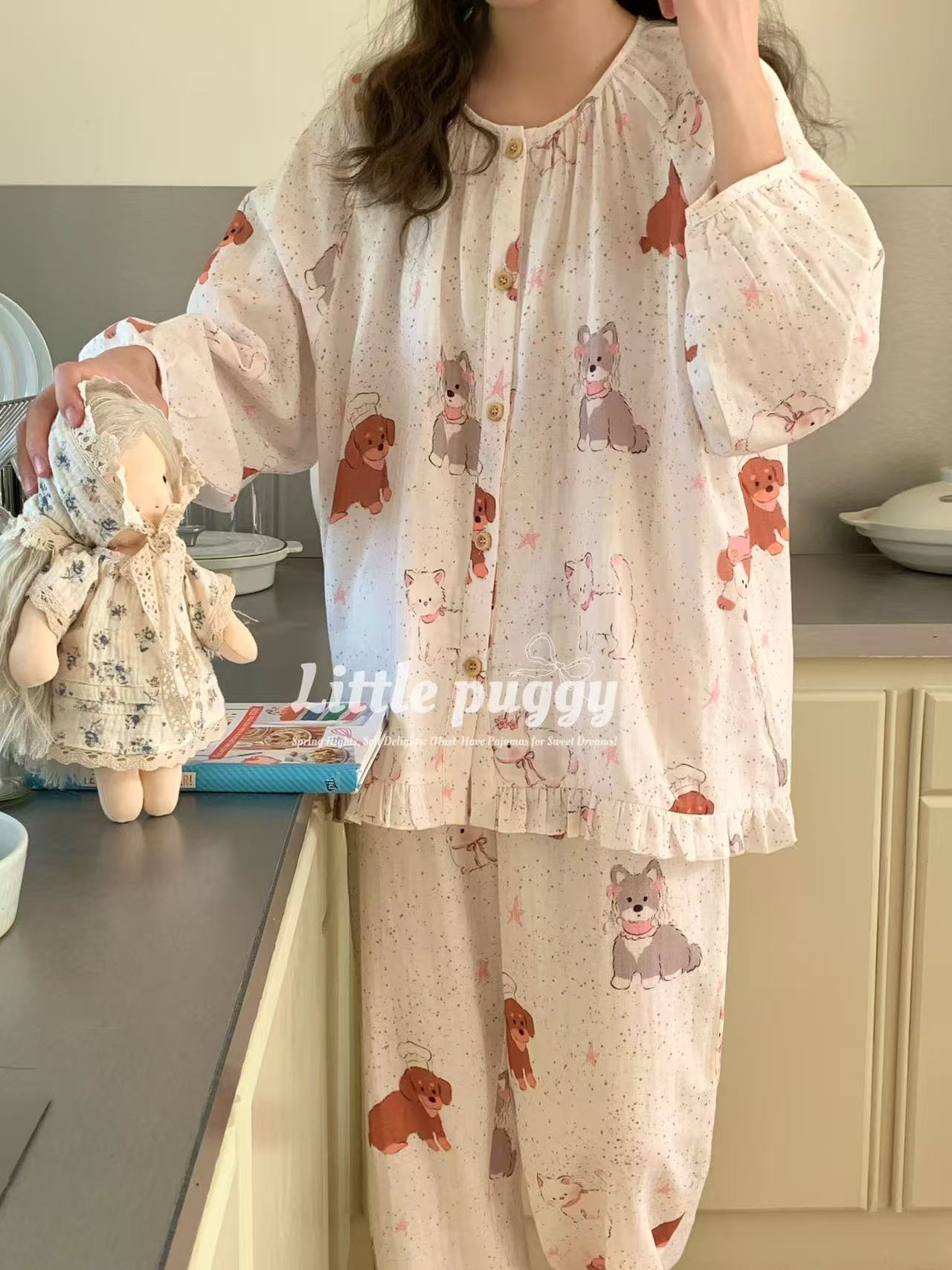 작은 puggy25 봄/여름 한국 스타일 더블 거즈 부드러운 고양이 잠옷