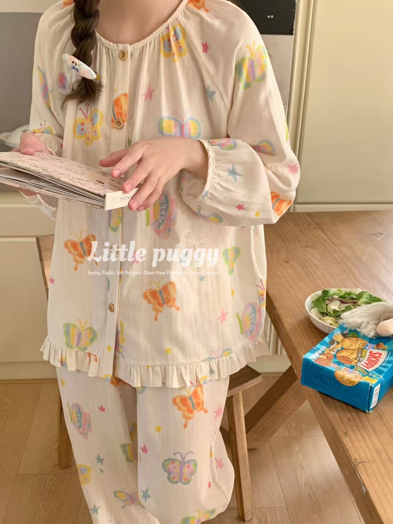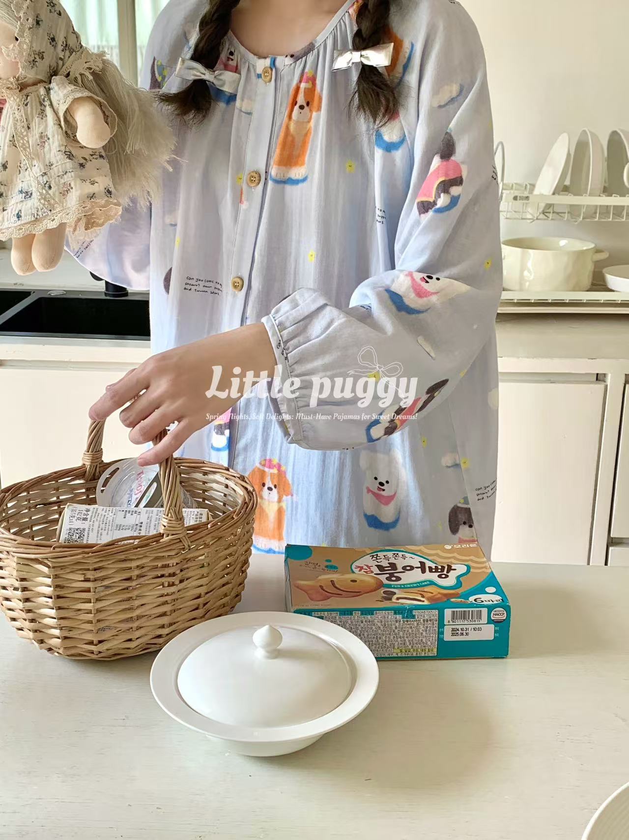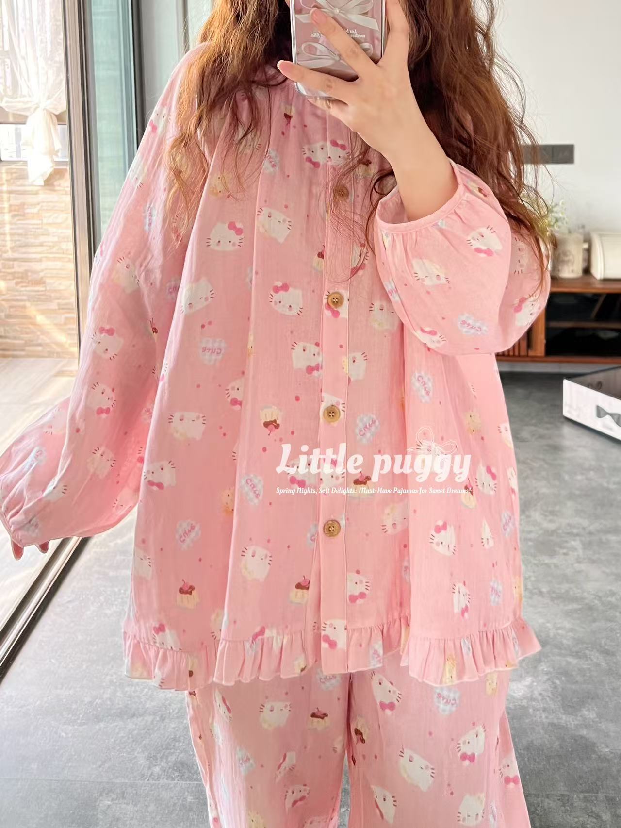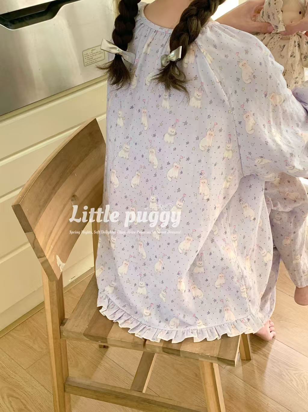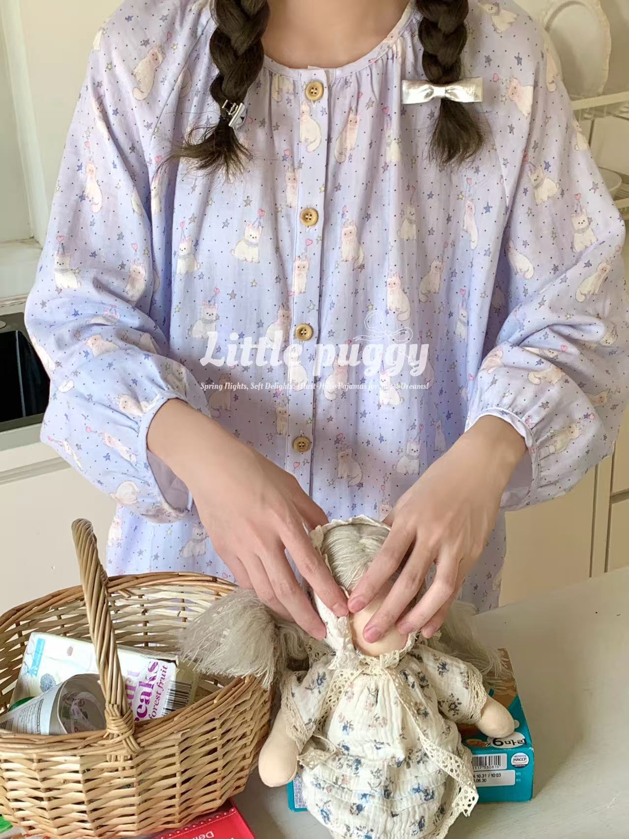 작은 puggy25 봄/여름 한국 스타일 더블 거즈 부드러운 고양이 잠옷스토어 가기