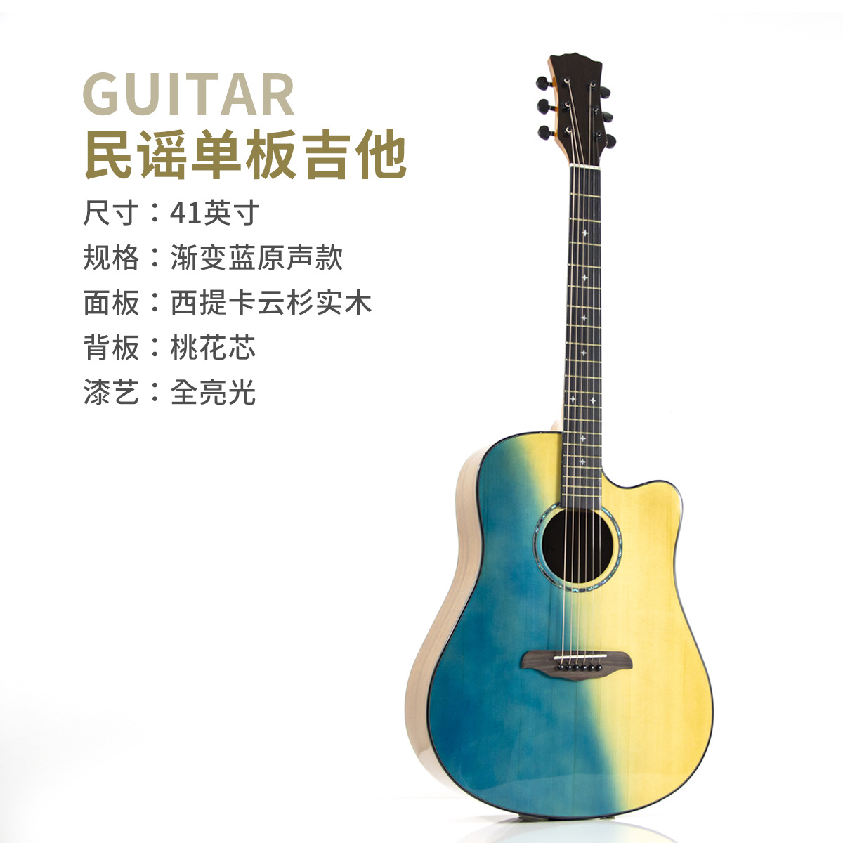 41 인치 포크 기타 베니어 솔리드 우드 그라디언트 블루 하이 컬러 가치 우드 기타 엔트리 레벨 고급 기타