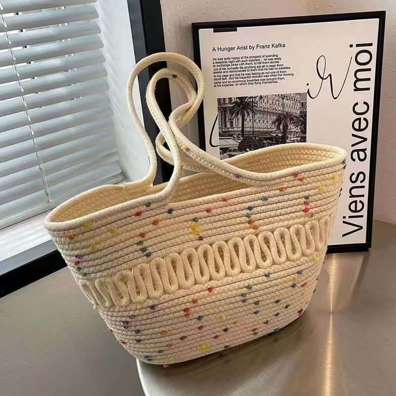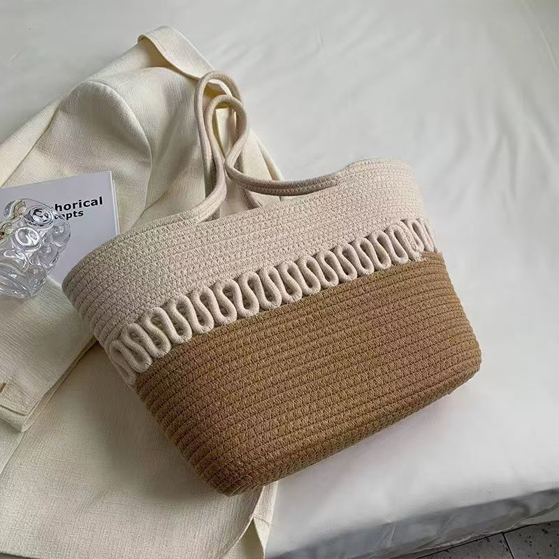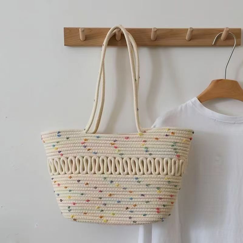 대용량 로프 버킷 가방 여성의 2025 예술적 신선한 컬러 중공 손 밀짚 가방 어깨 비치 백스토어 가기