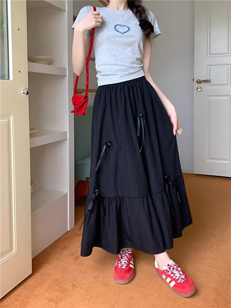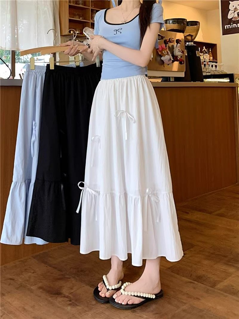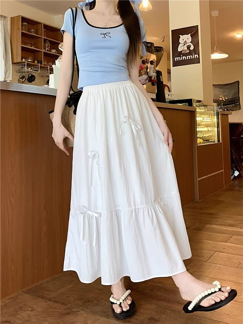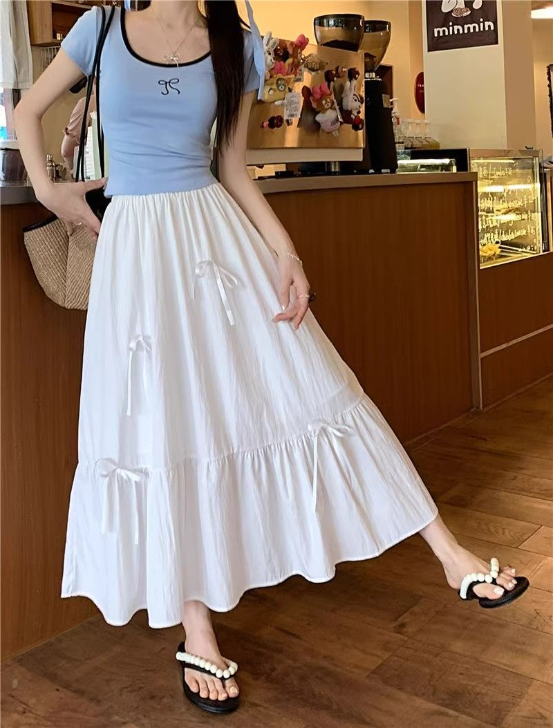 2024 새로운 여름 부드러운 스타일 활 바느질 달콤한 흰색 치마 작은 케이크 미디 스커트스토어 가기