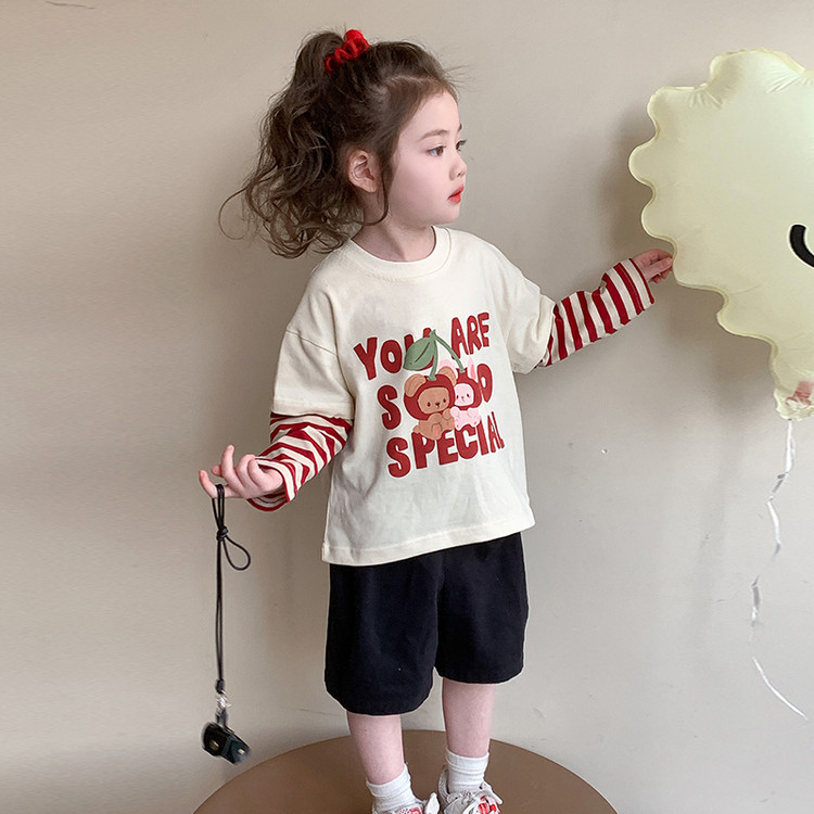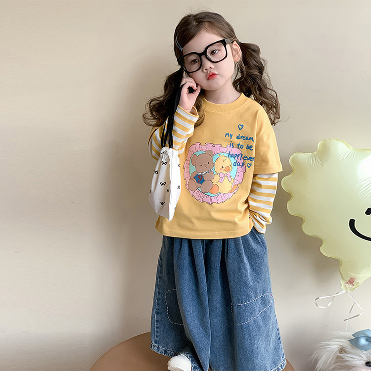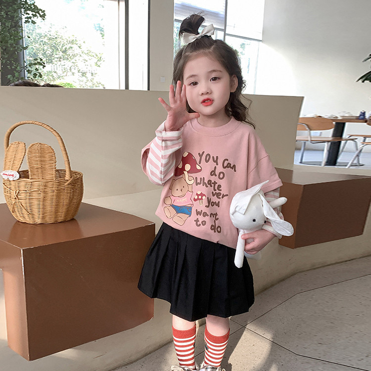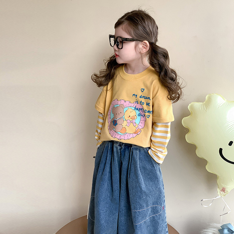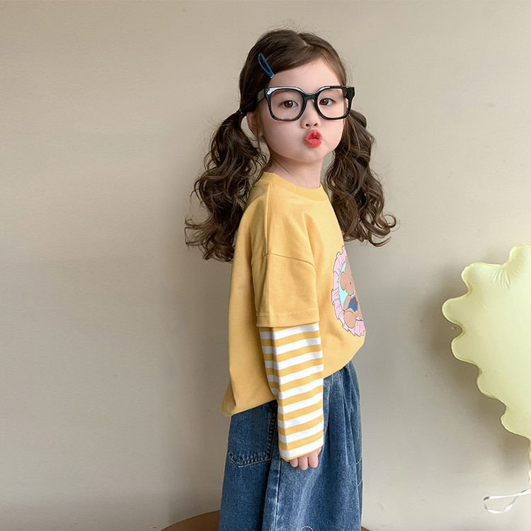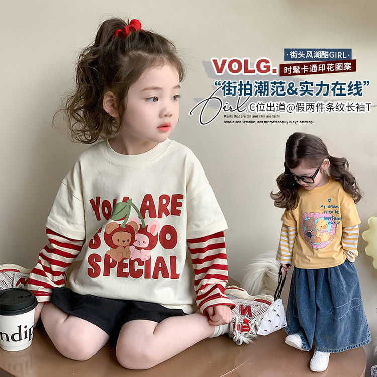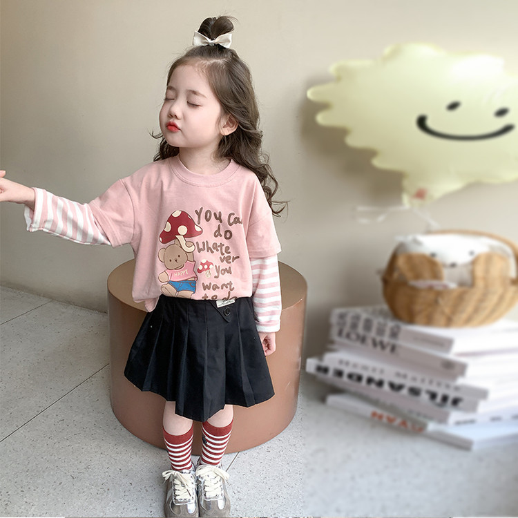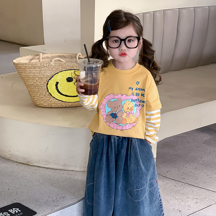 소녀 긴팔 티셔츠 봄과 가을 2025 새로운 어린이 만화 탑 봄 소녀의 가짜 투피스베이스 셔츠스토어 가기