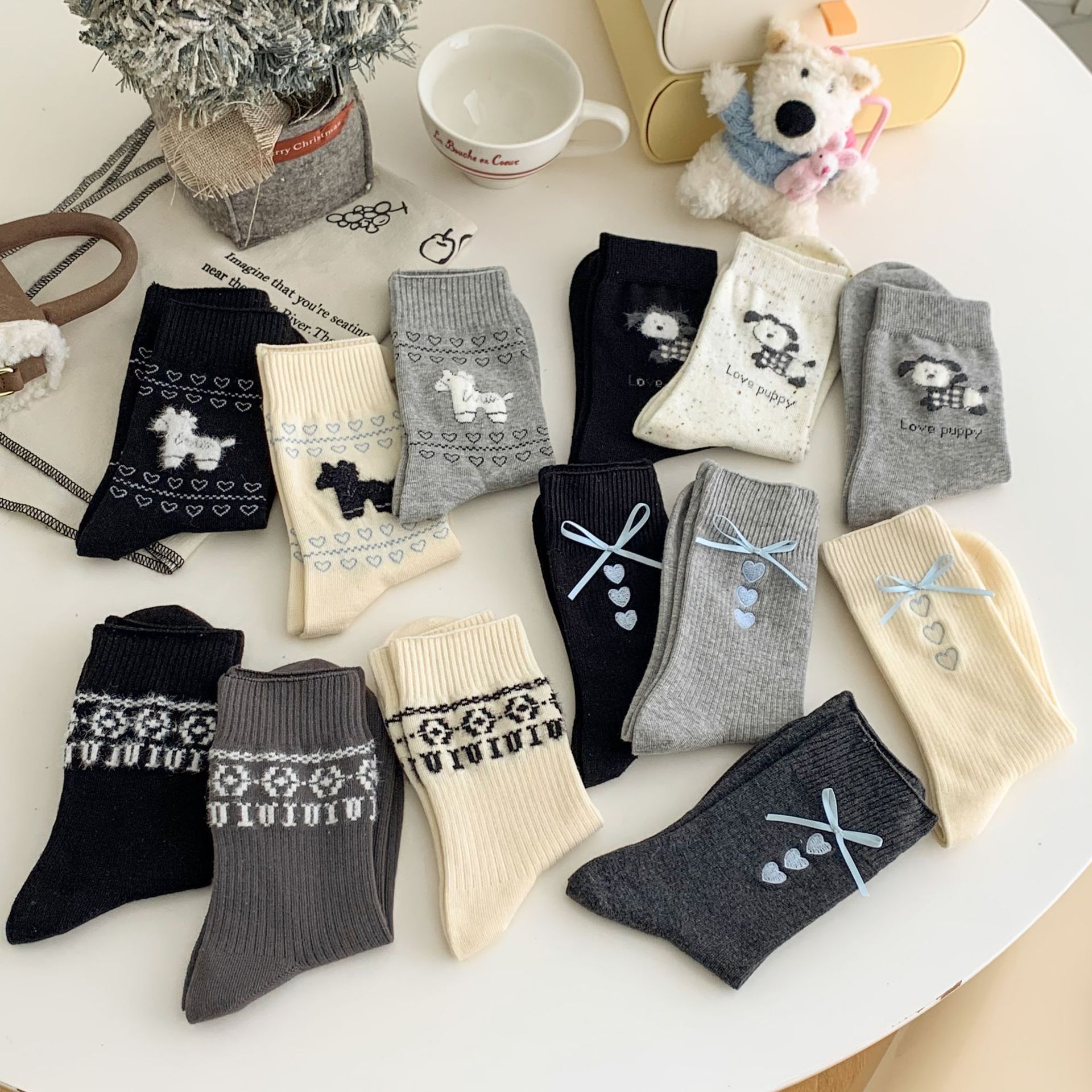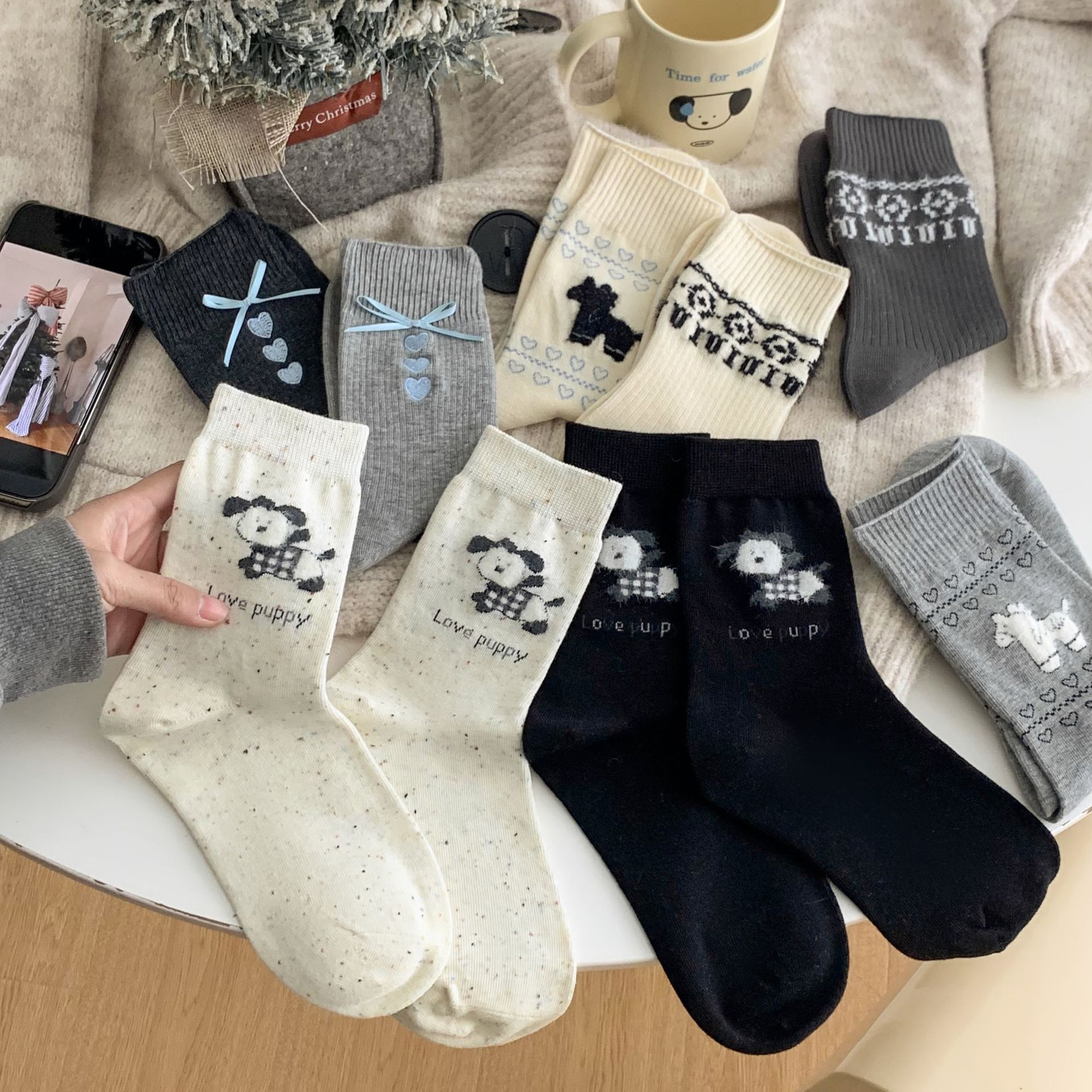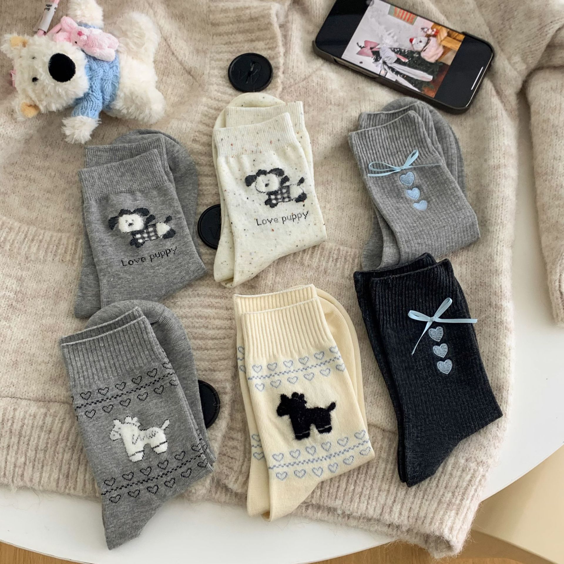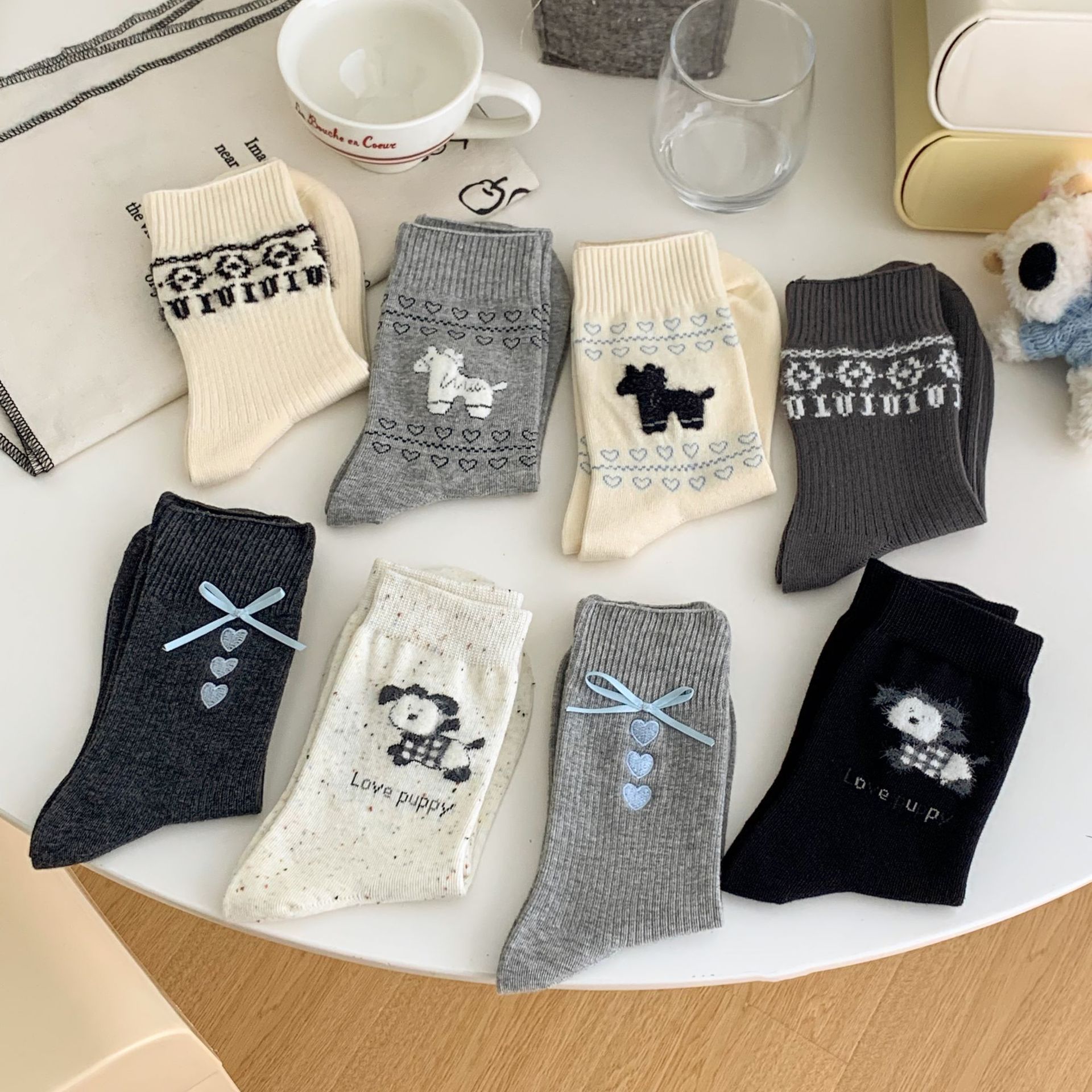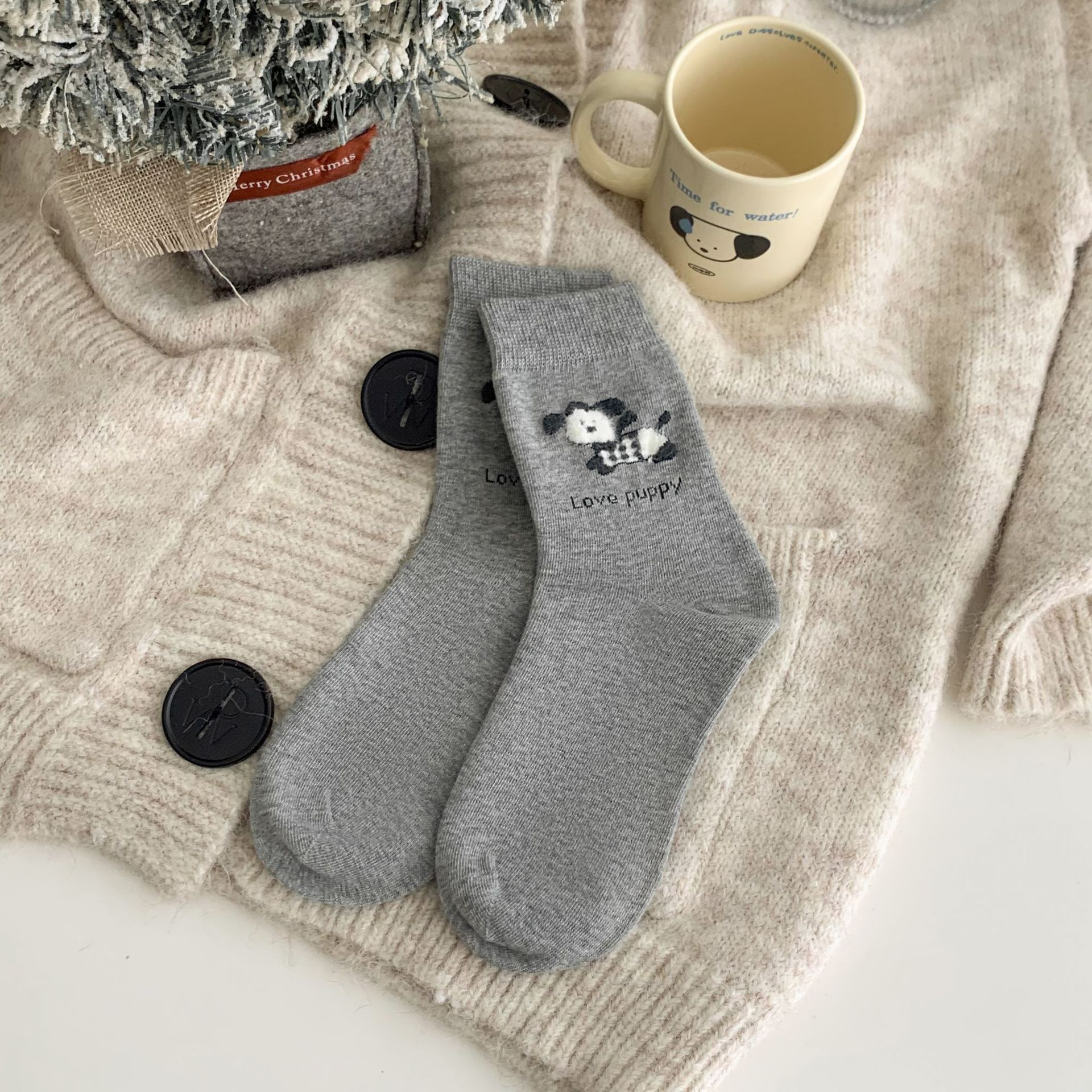 회색 양말 여성의 중간 튜브 양말 봄과 가을 귀여운 만화 사랑 활 민족 스타일 페어 아일랜드 강아지 양말