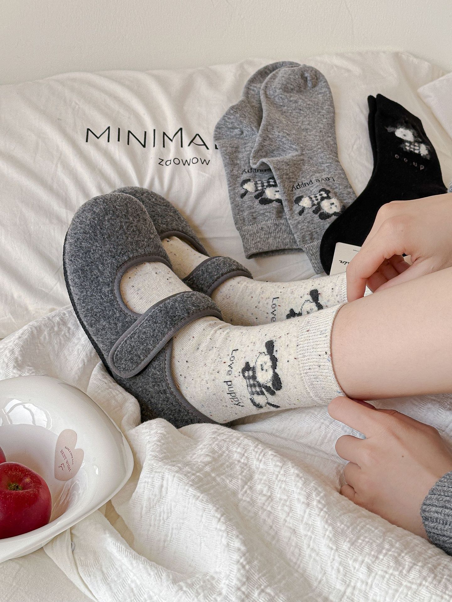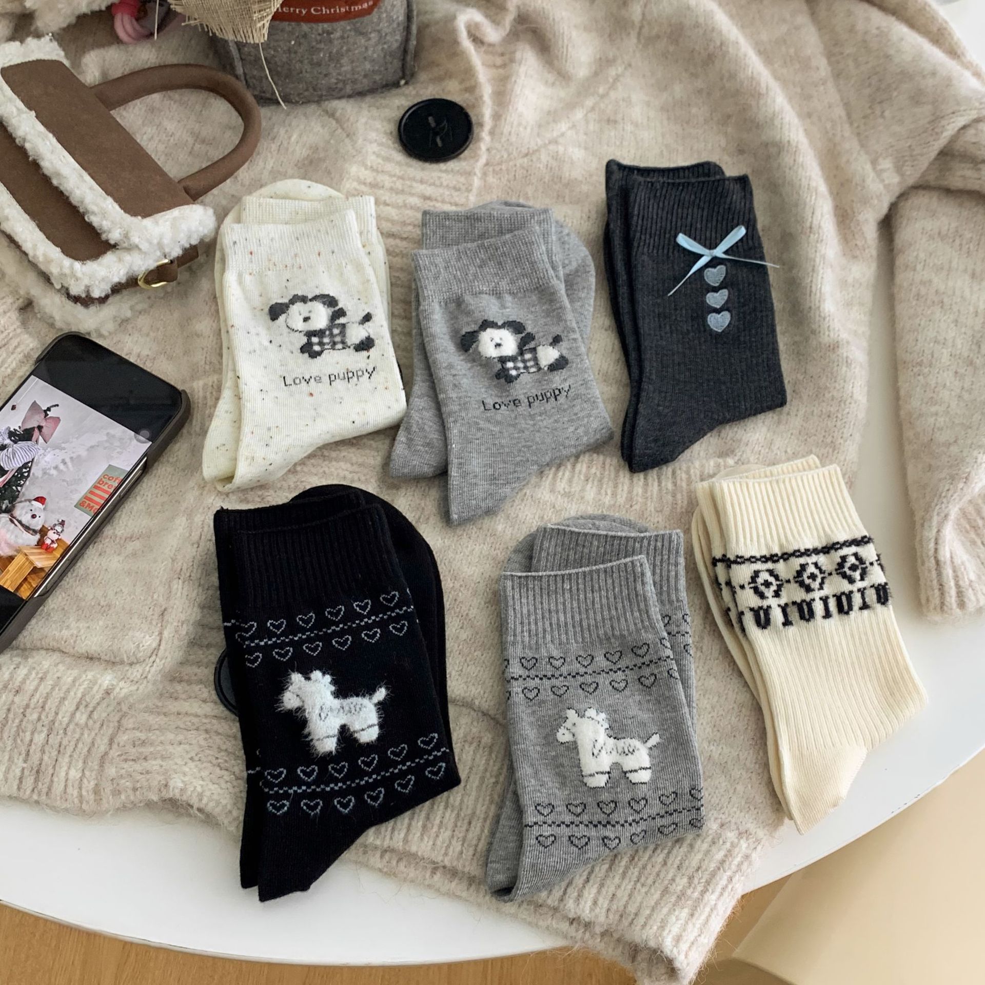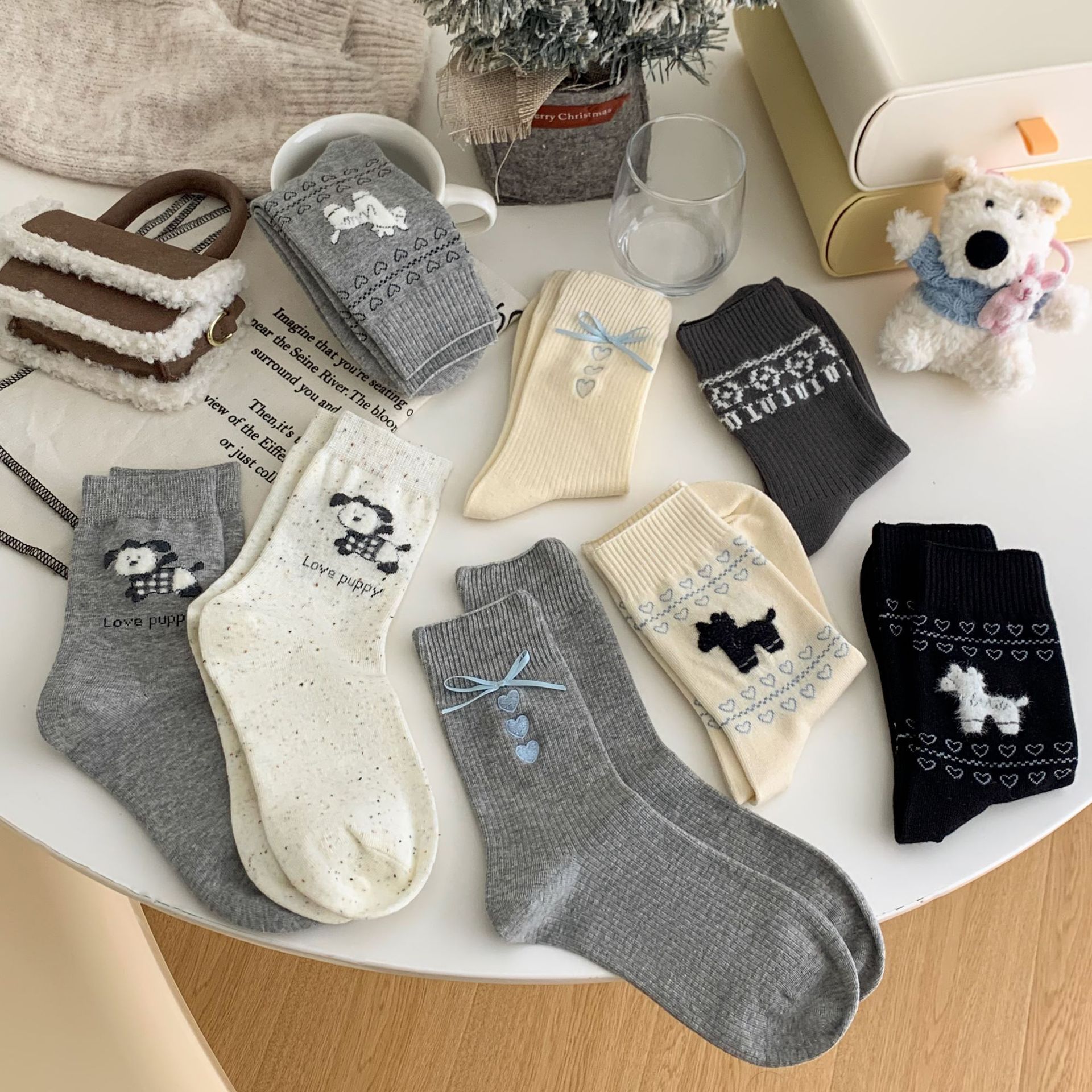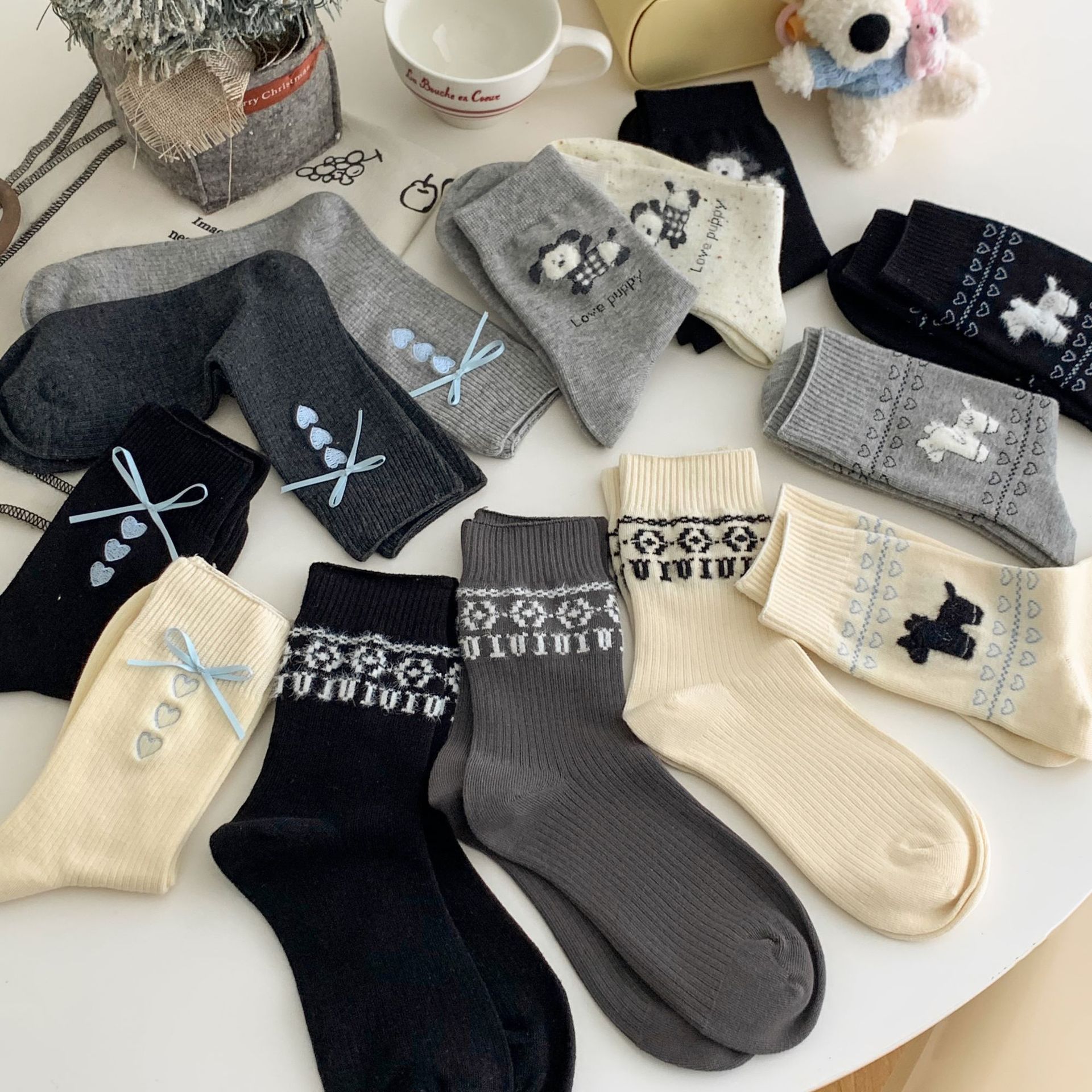 회색 양말 여성의 중간 튜브 양말 봄과 가을 귀여운 만화 사랑 활 민족 스타일 페어 아일랜드 강아지 양말