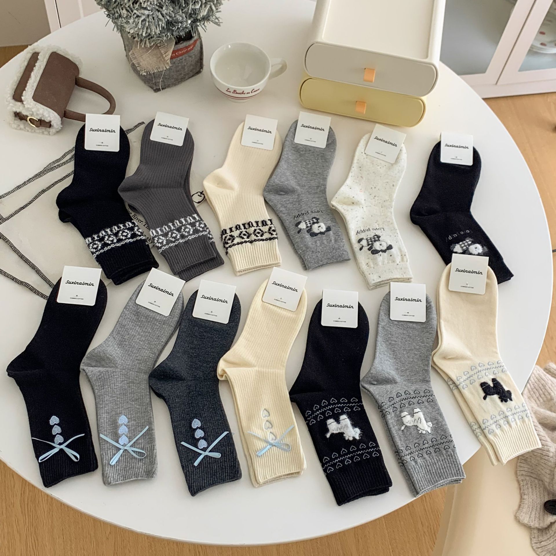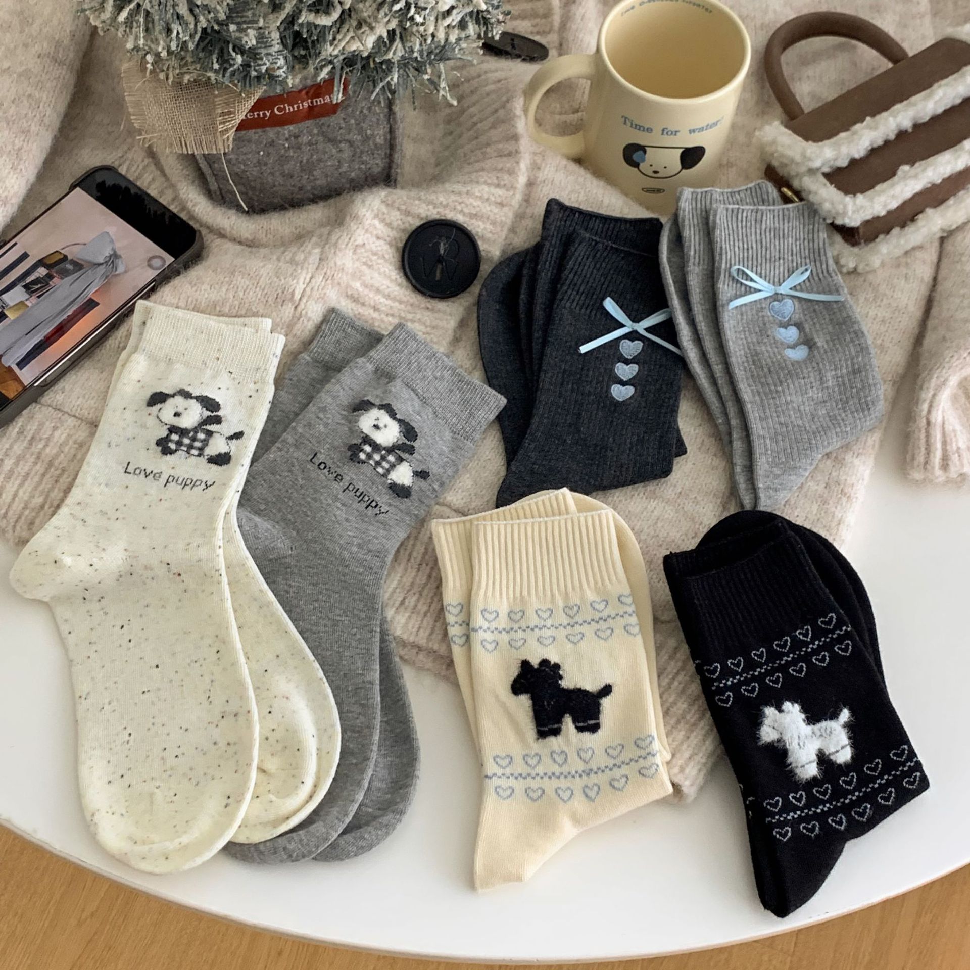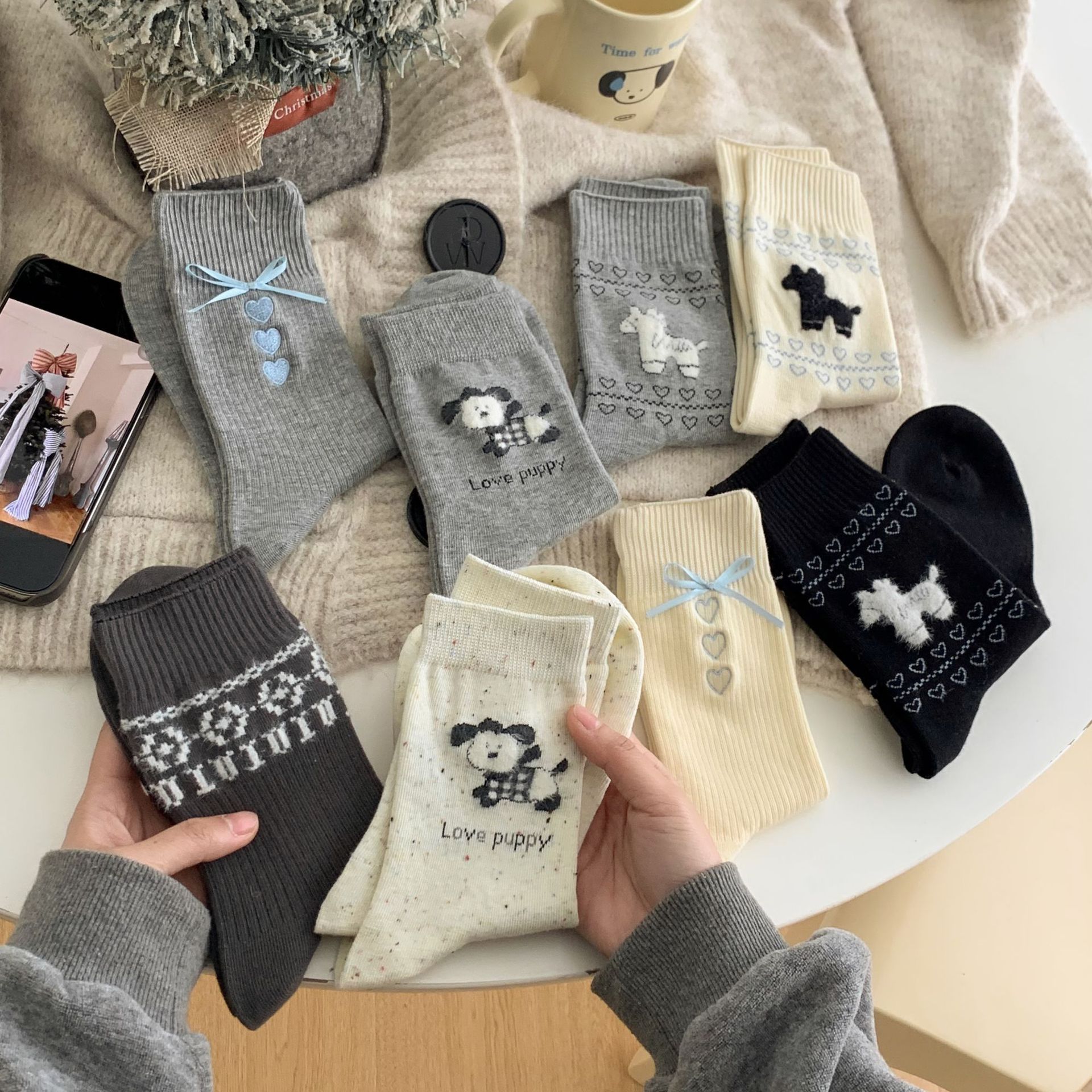 회색 양말 여성의 중간 튜브 양말 봄과 가을 귀여운 만화 사랑 활 민족 스타일 페어 아일랜드 강아지 양말스토어 가기