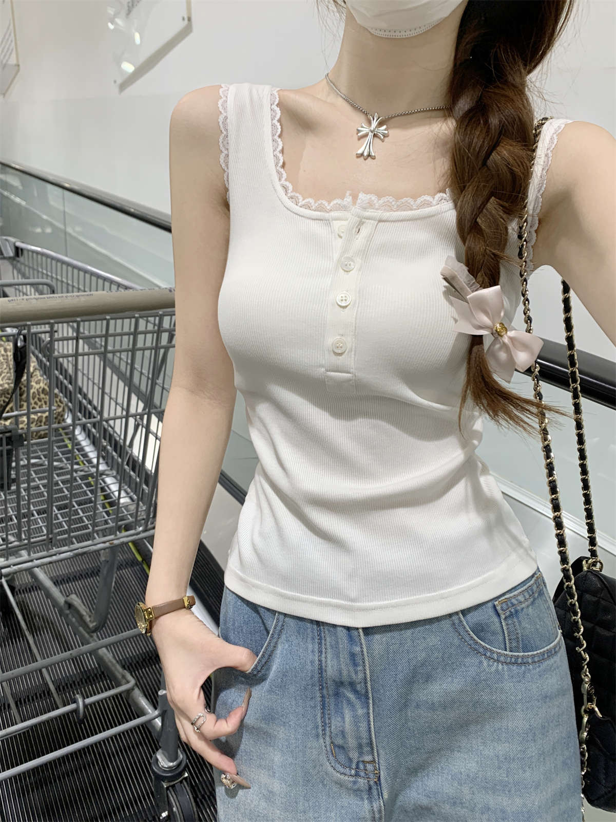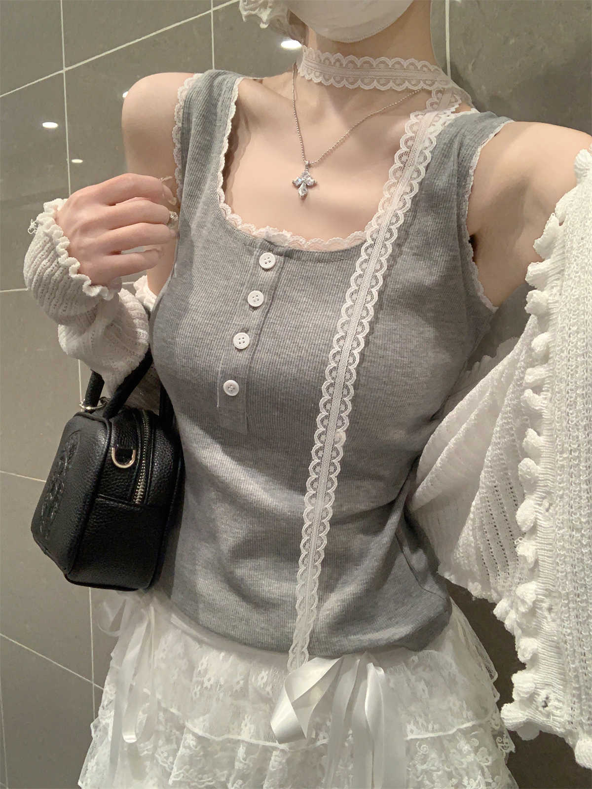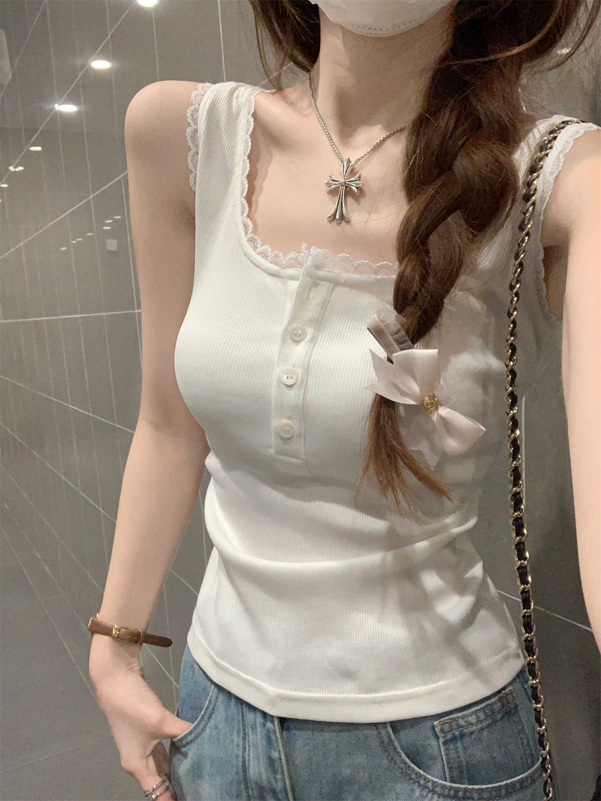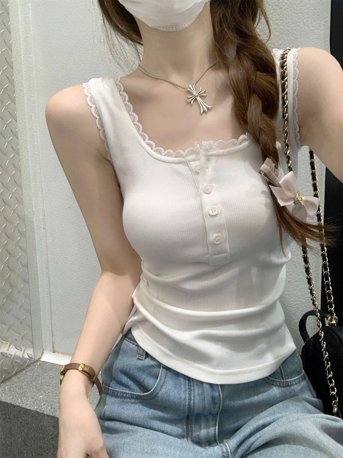 한국식 스퀘어 칼라 레이스 트리밍 슬링 여성용 아우터웨어 봄과 여름 슬림핏 내베이스 탑, 유방 커버 버튼 조끼스토어 가기