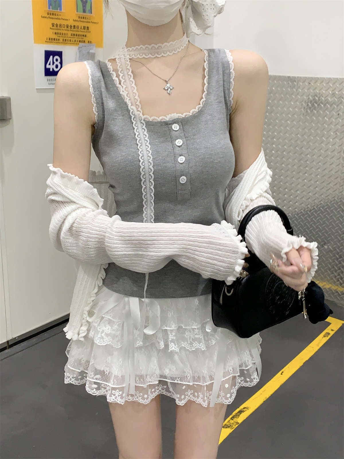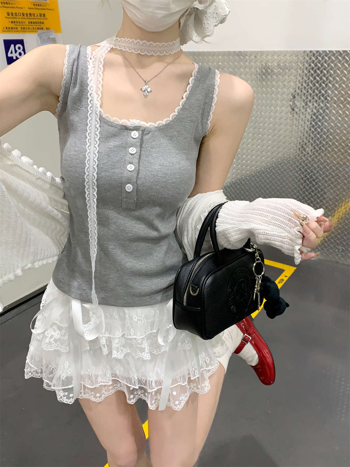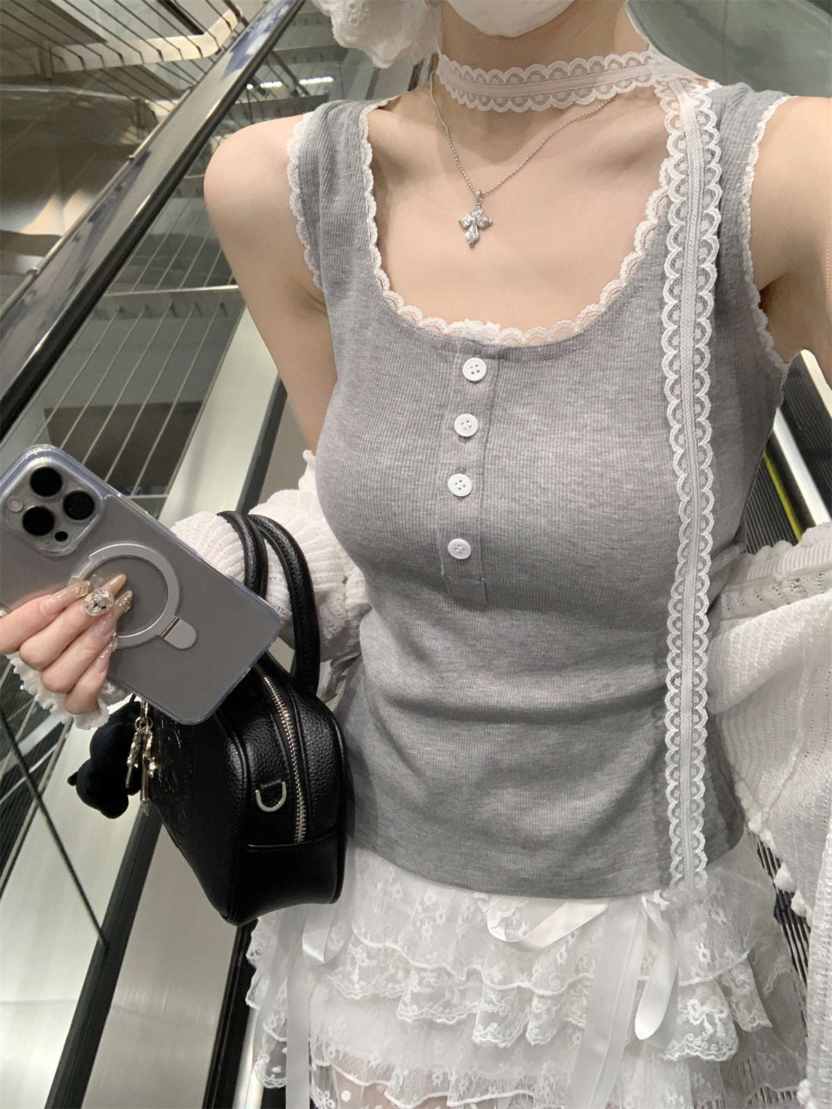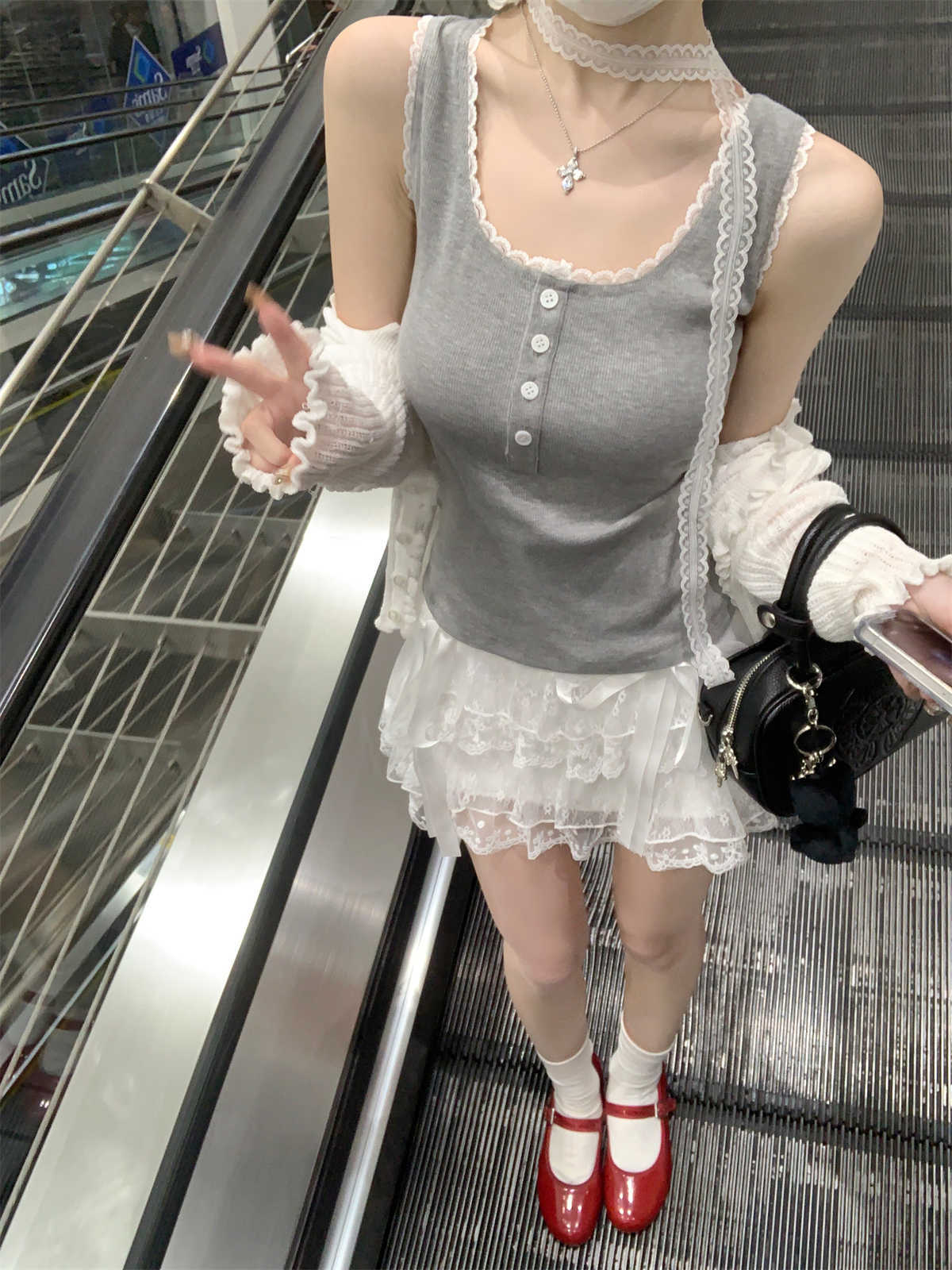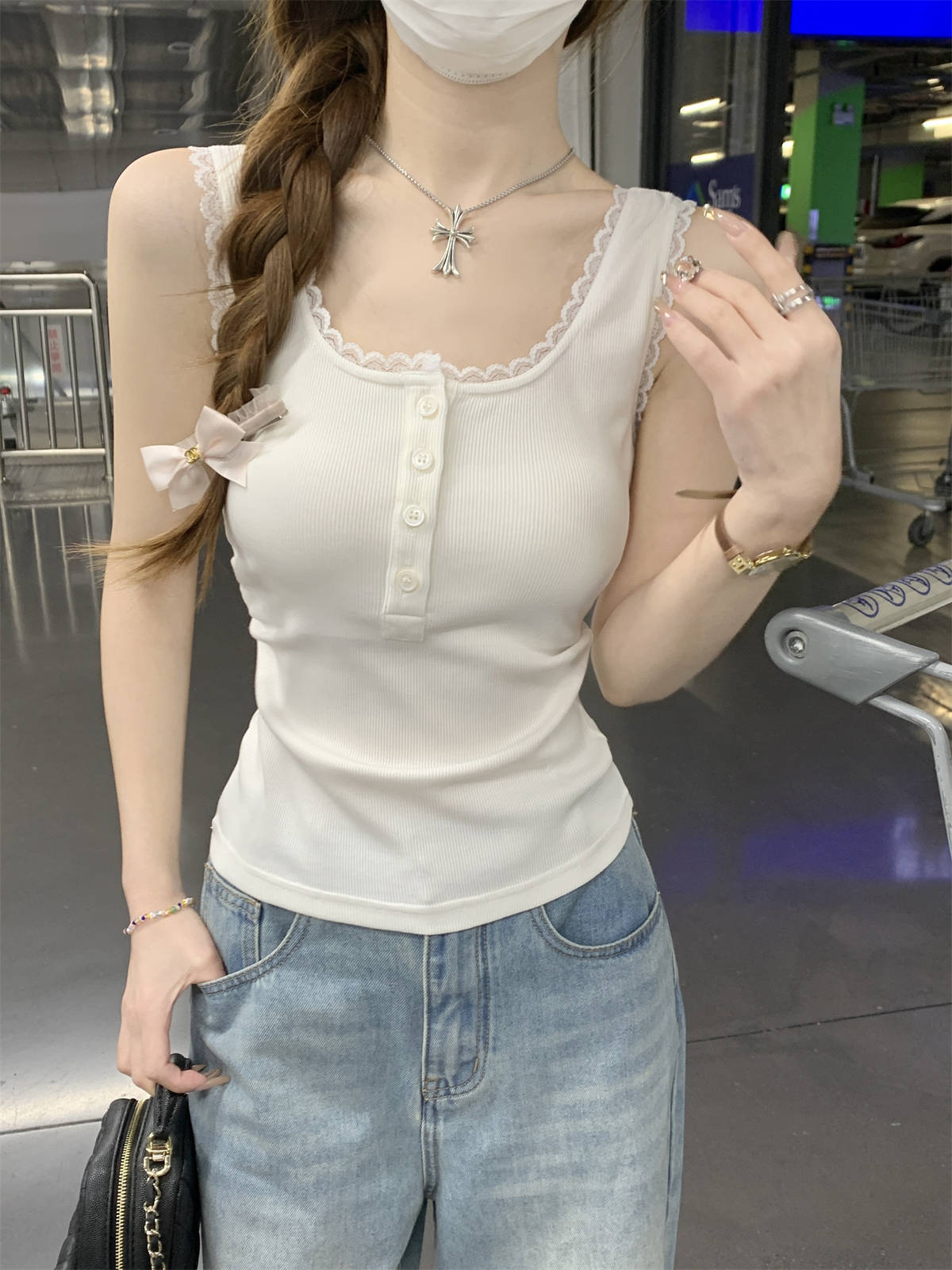 한국식 스퀘어 칼라 레이스 트리밍 슬링 여성용 아우터웨어 봄과 여름 슬림핏 내베이스 탑, 유방 커버 버튼 조끼스토어 가기