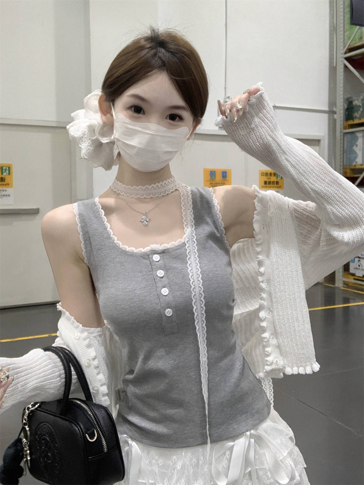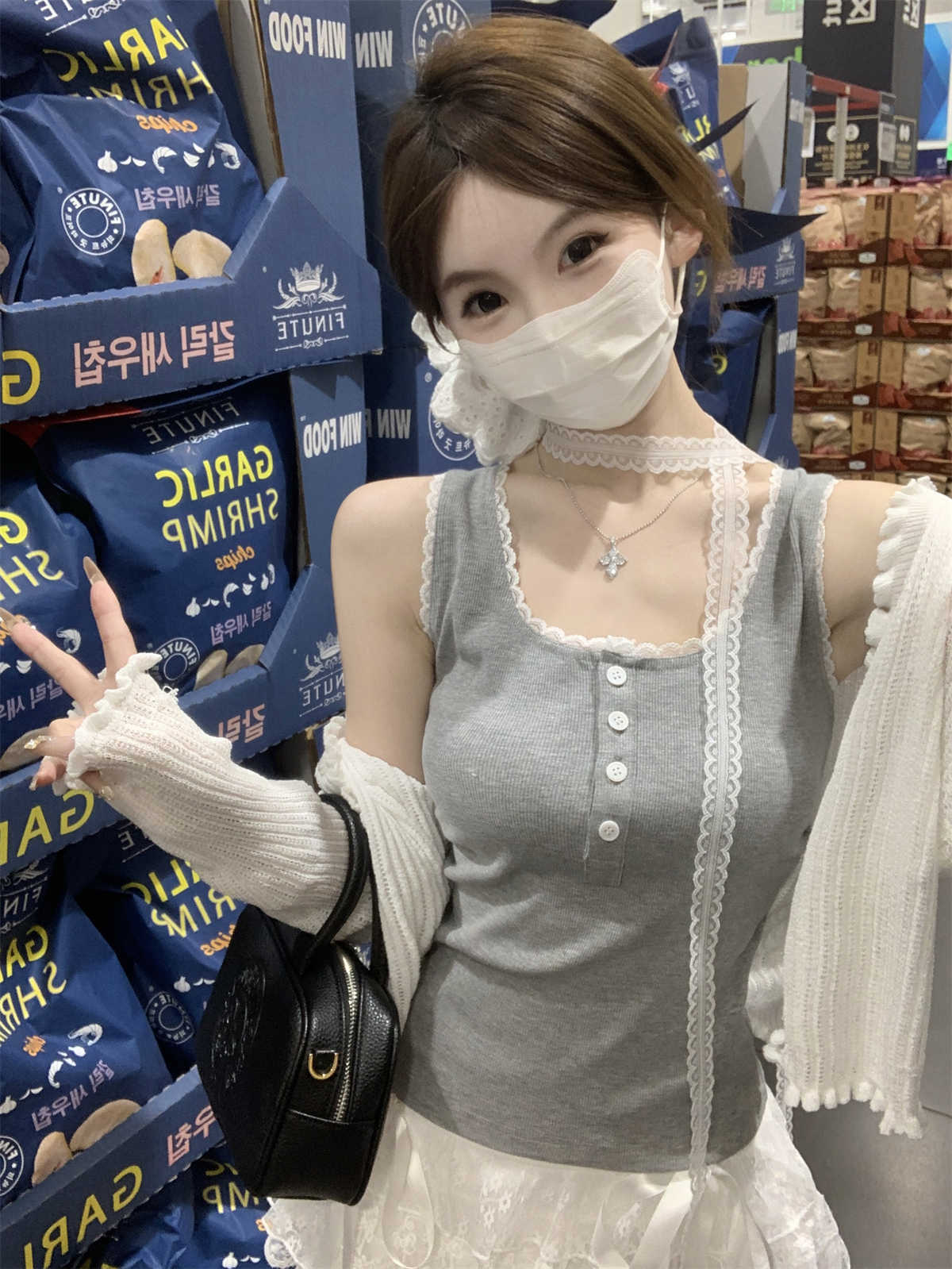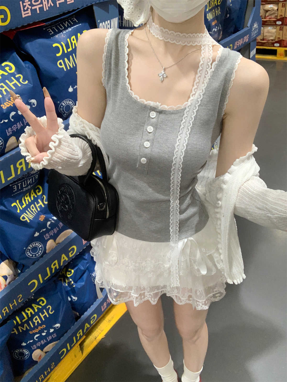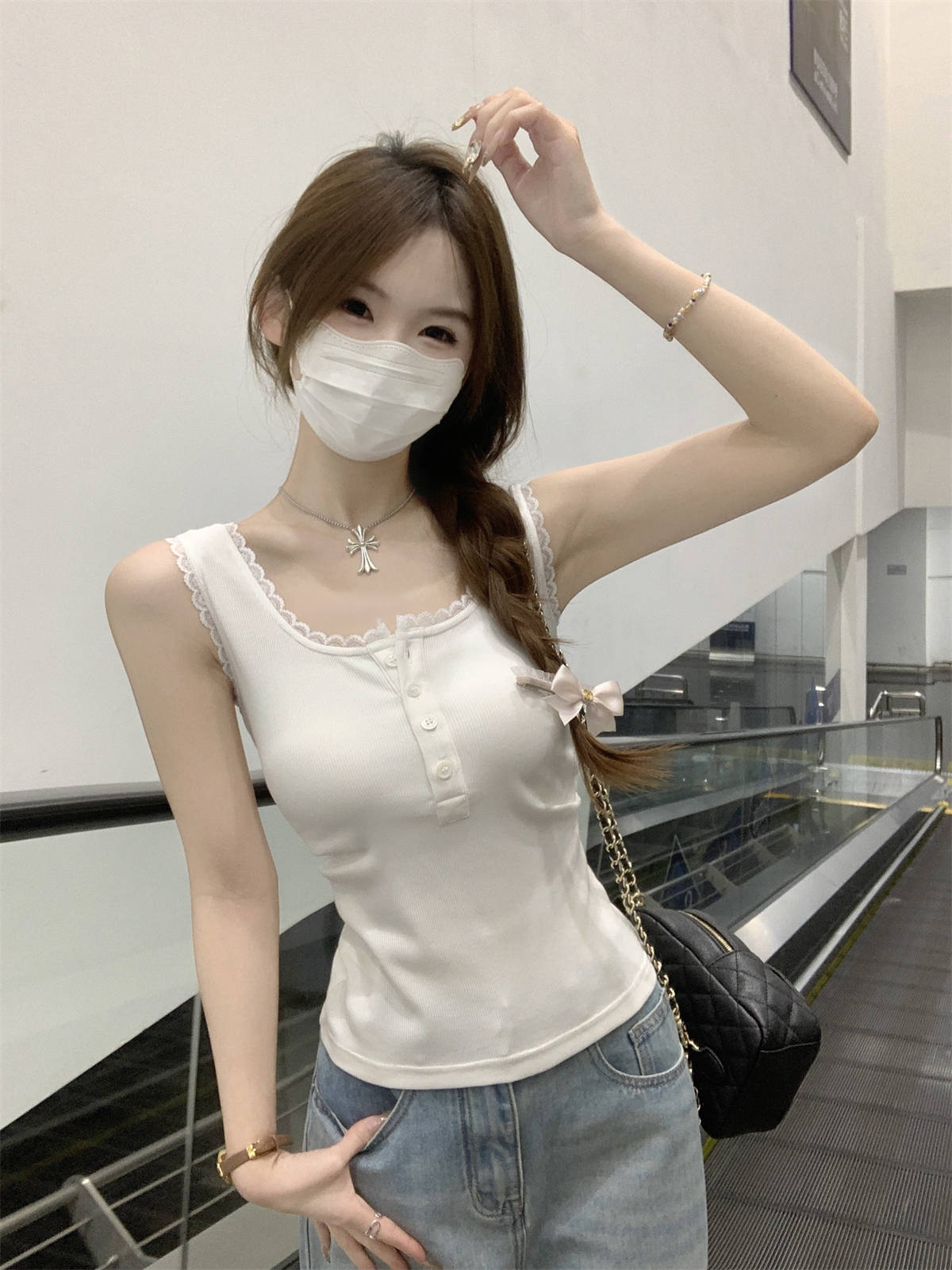 한국식 스퀘어 칼라 레이스 트리밍 슬링 여성용 아우터웨어 봄과 여름 슬림핏 내베이스 탑, 유방 커버 버튼 조끼스토어 가기