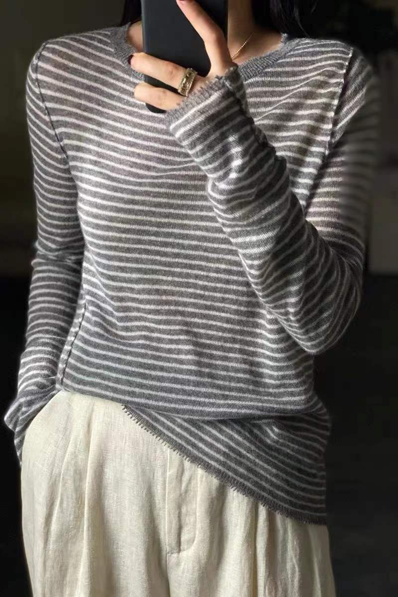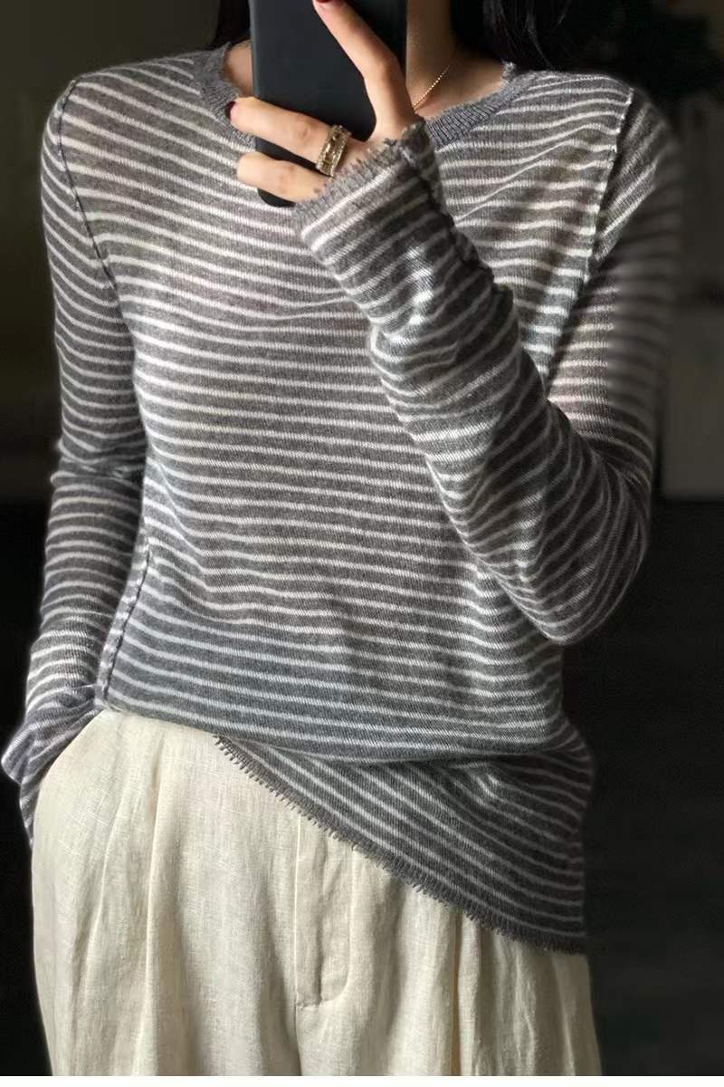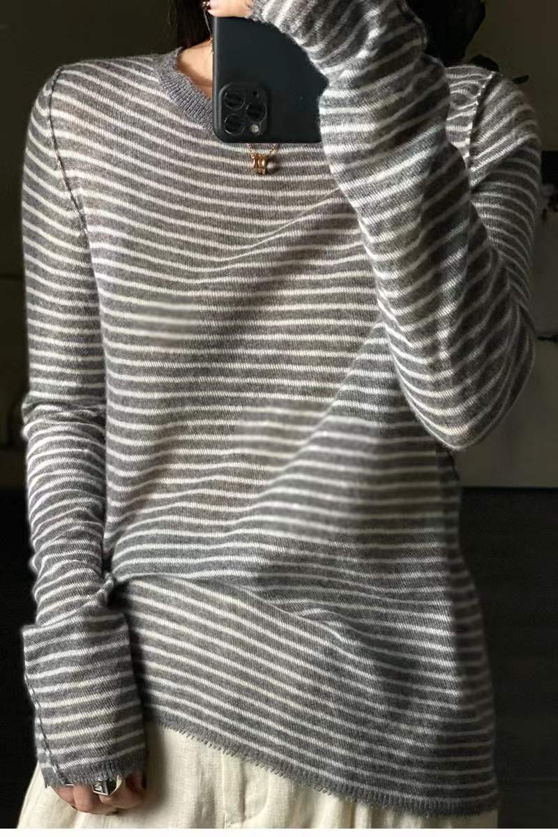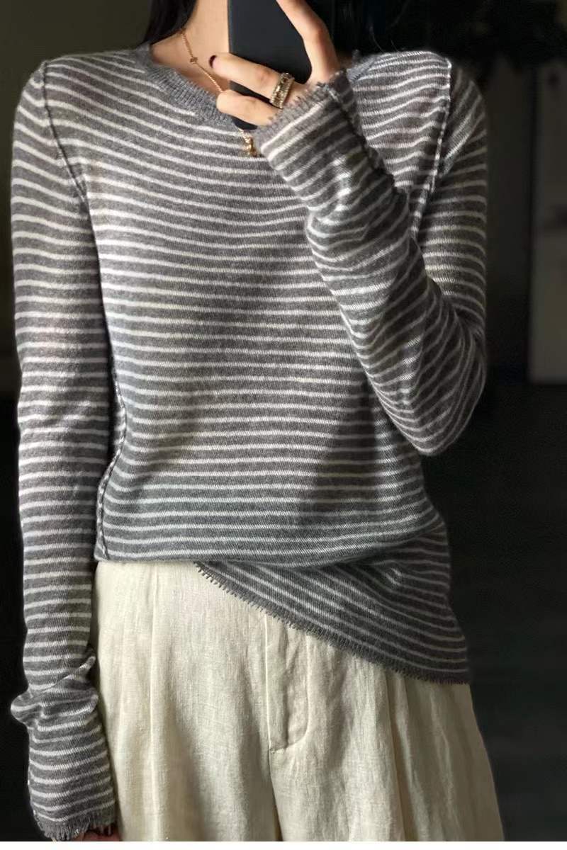 Merino Worsted 초미세베이스 셔츠 여성의 봄 흑백 줄무늬 스웨터 틈새 디자인 경량스토어 가기