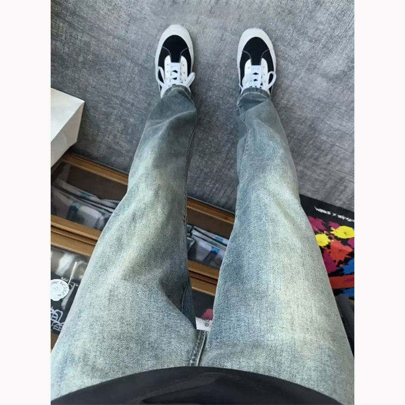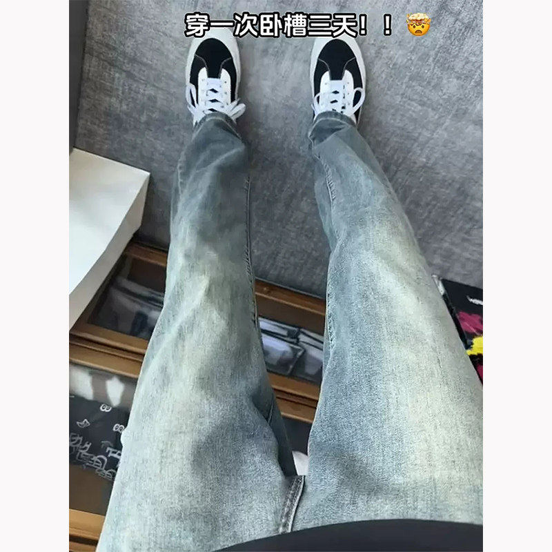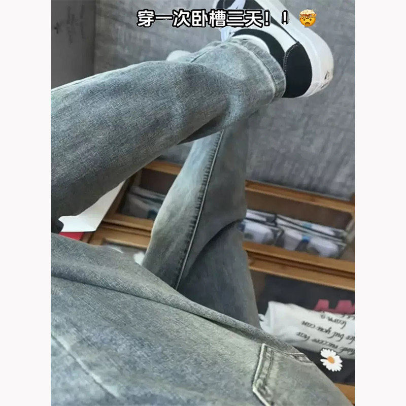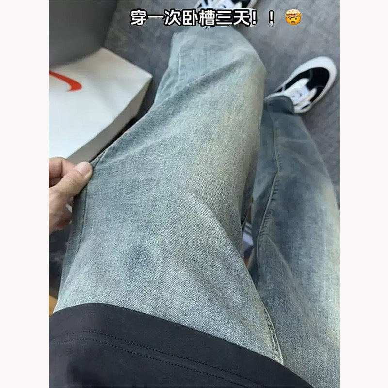세탁 된 빈티지 블루 좁은 청바지 남성 봄과 가을 미국 스타일 하이 스트리트 바이브 바지 슬림 핏 슬리밍 스트레이트 바지스토어 가기