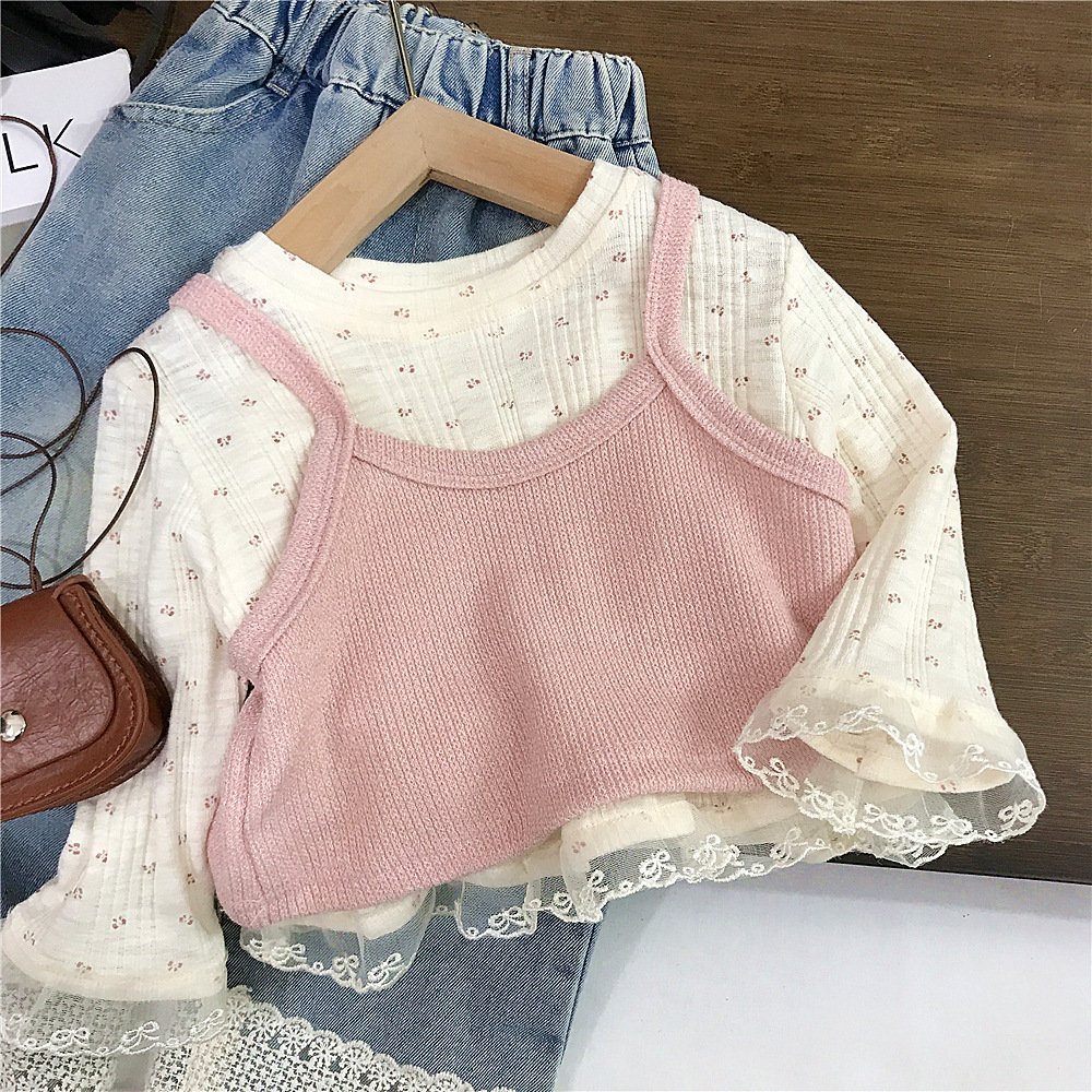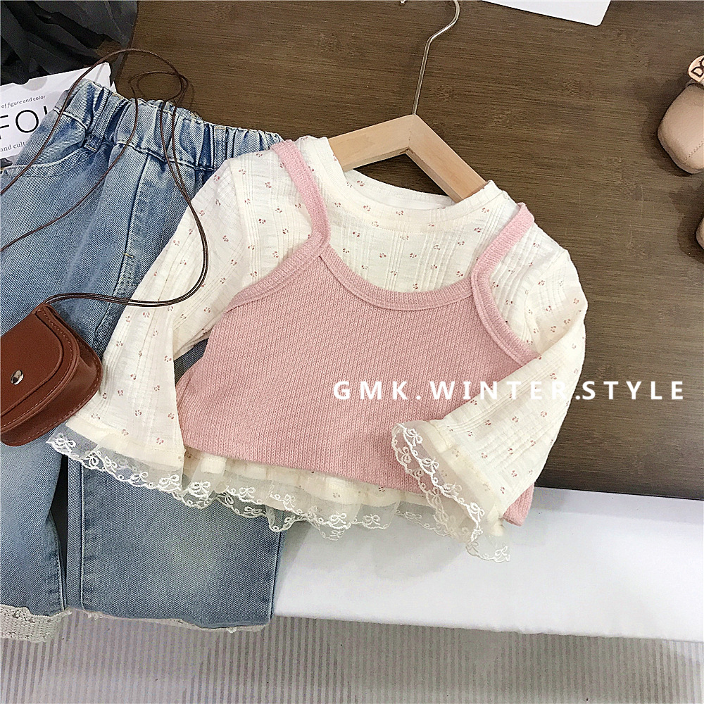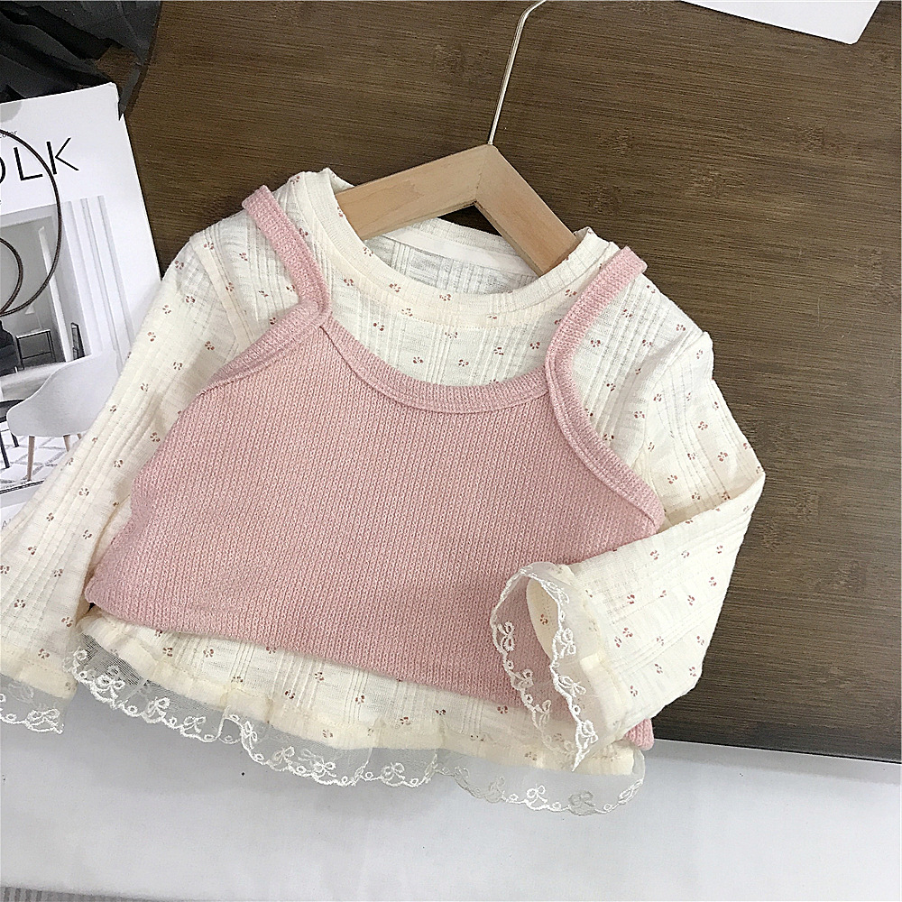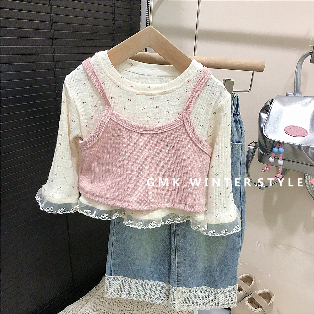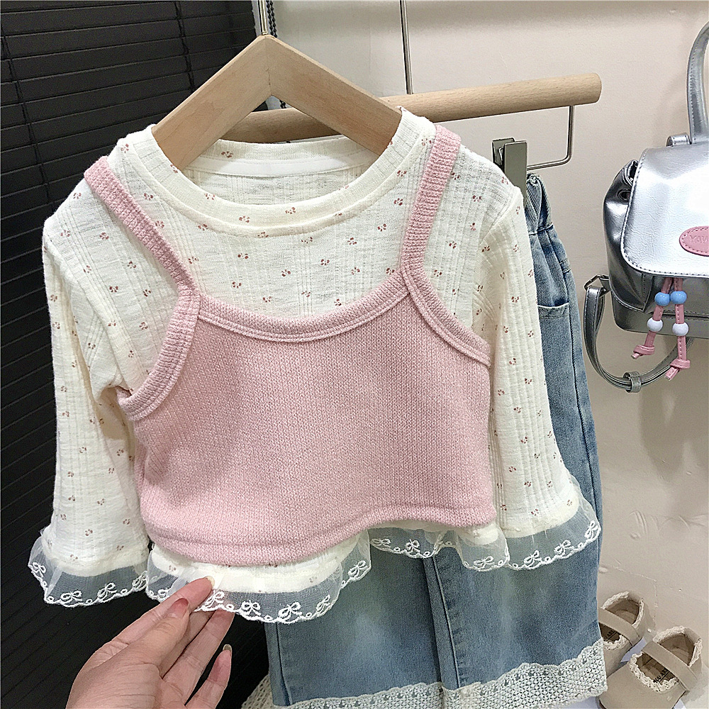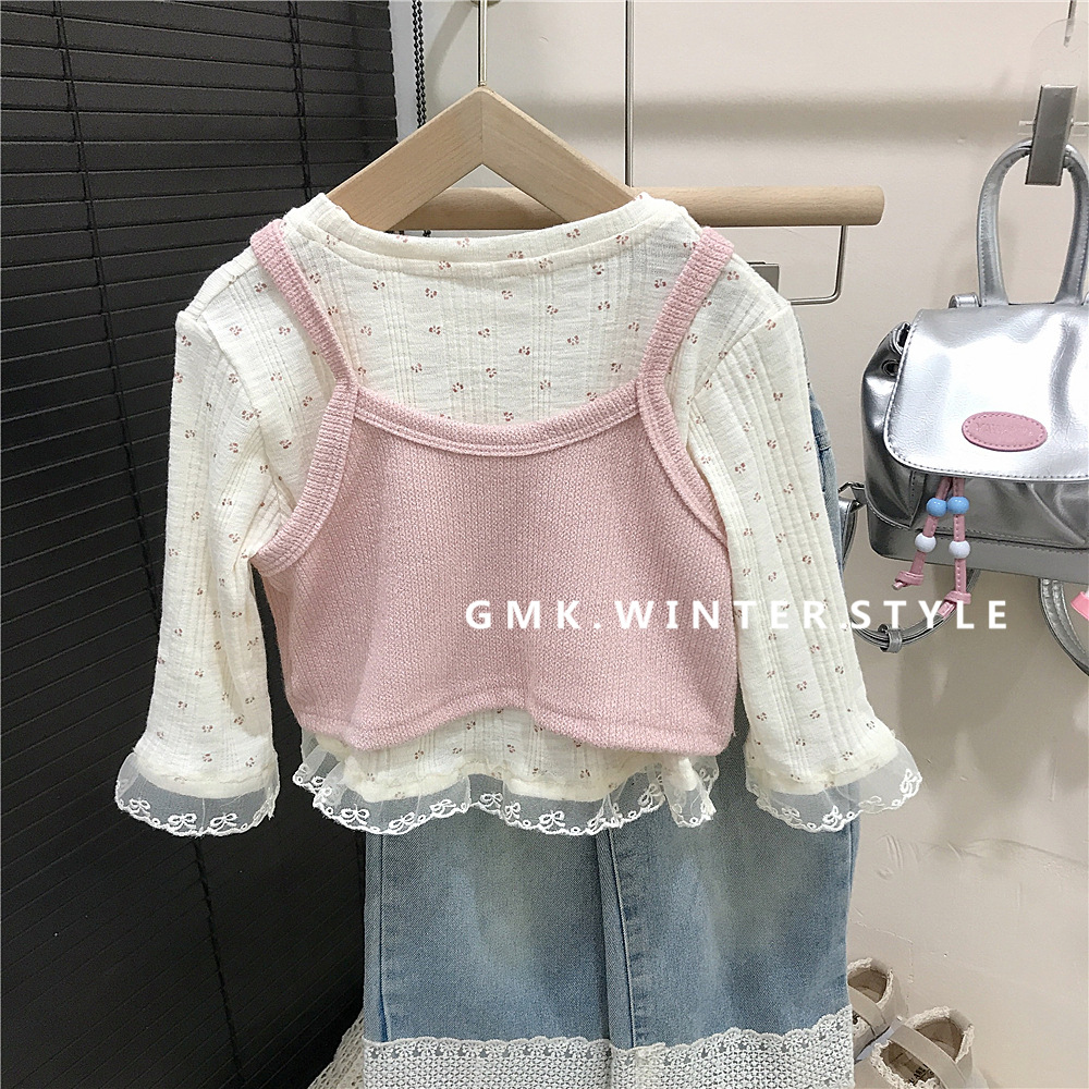 소녀의 봄 2025 새로운 세련된 꽃 셔츠 봄과 가을 패션 긴 소매 티셔츠 슬링 투피스 탑