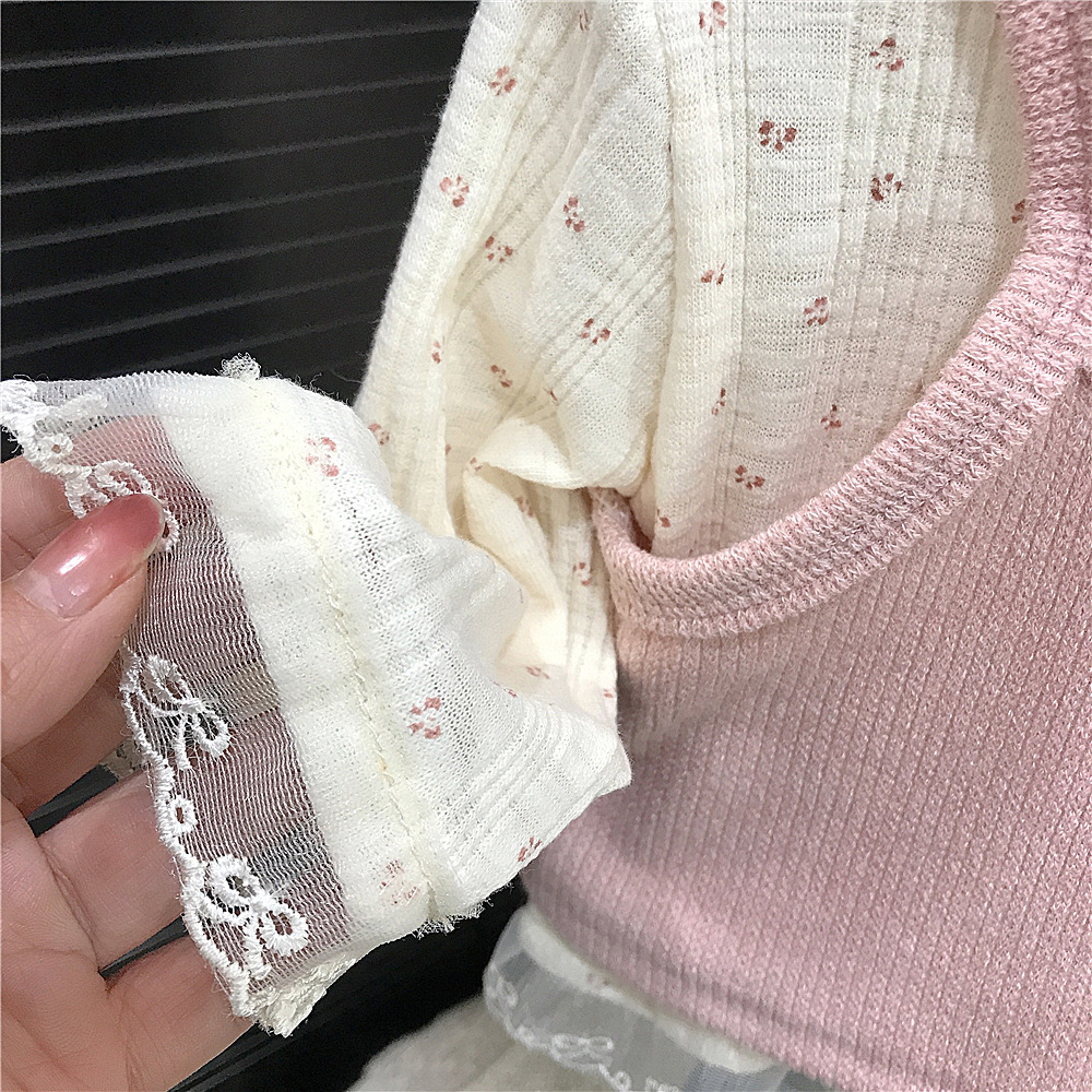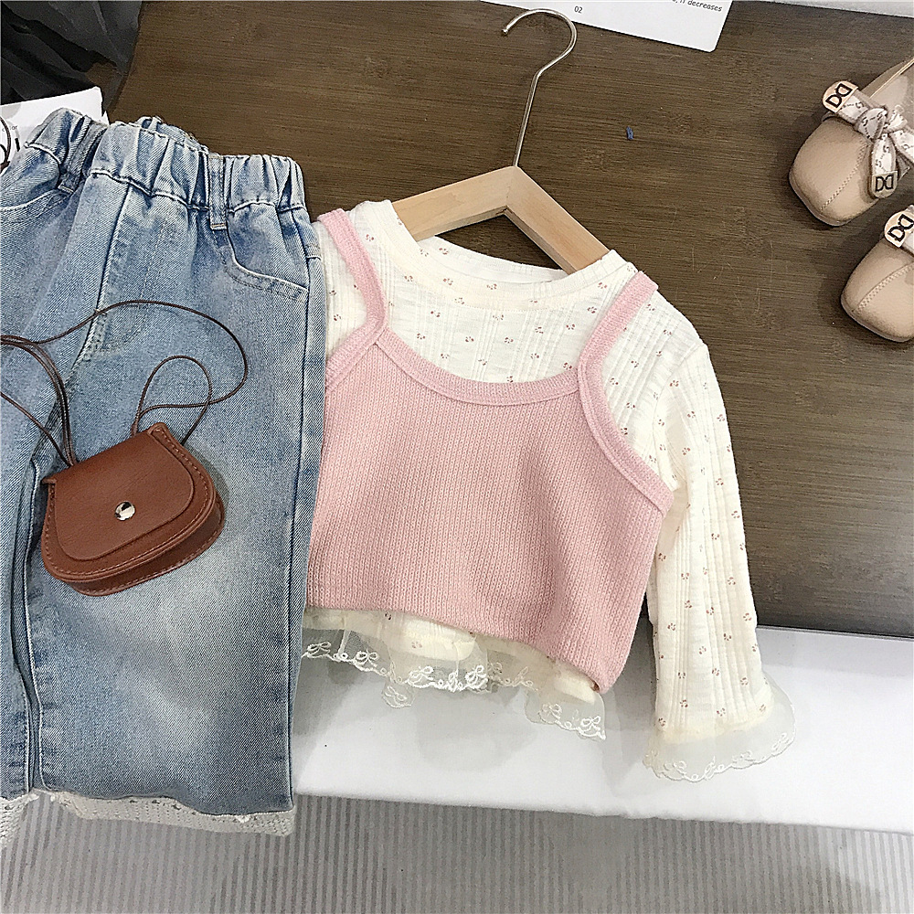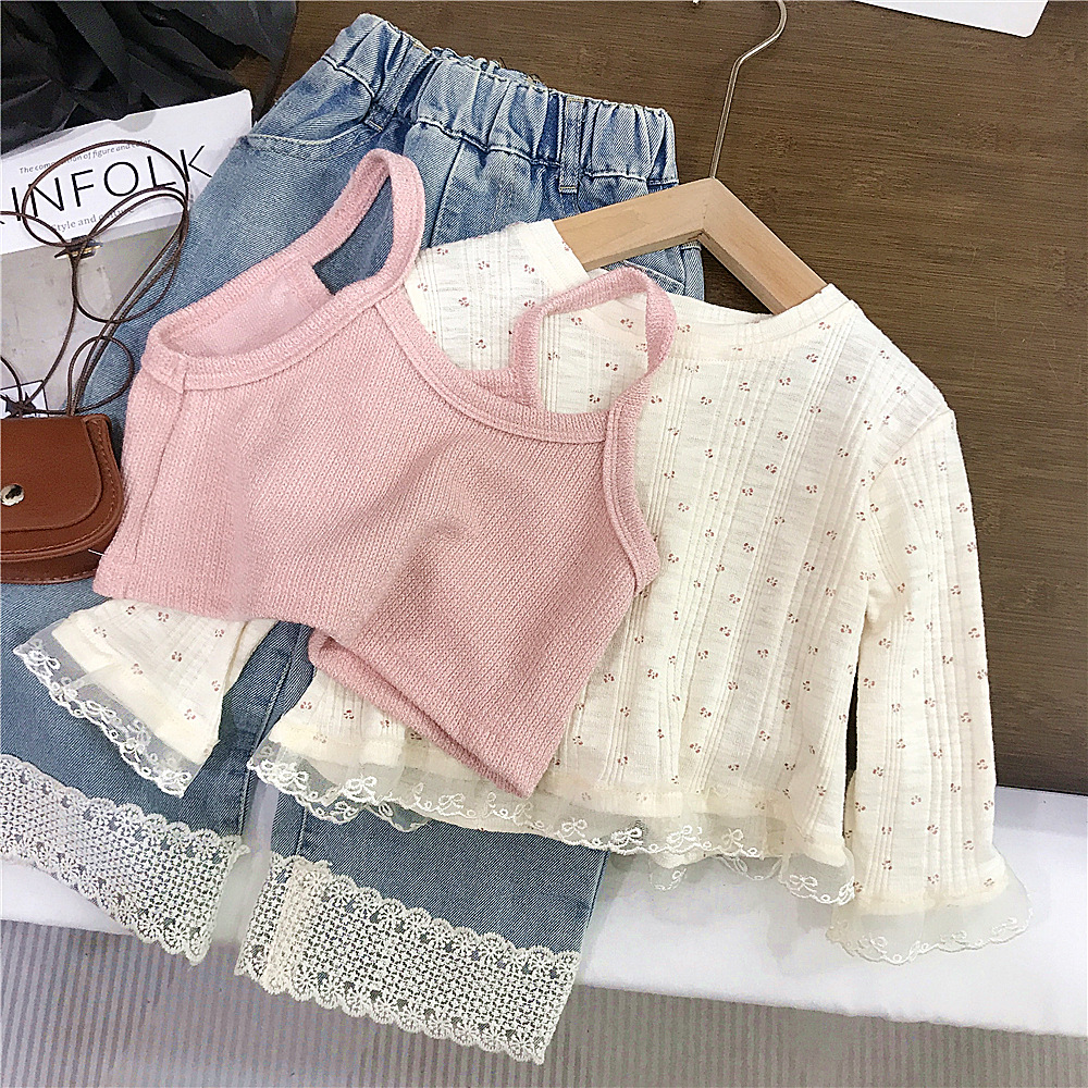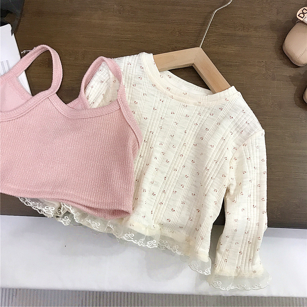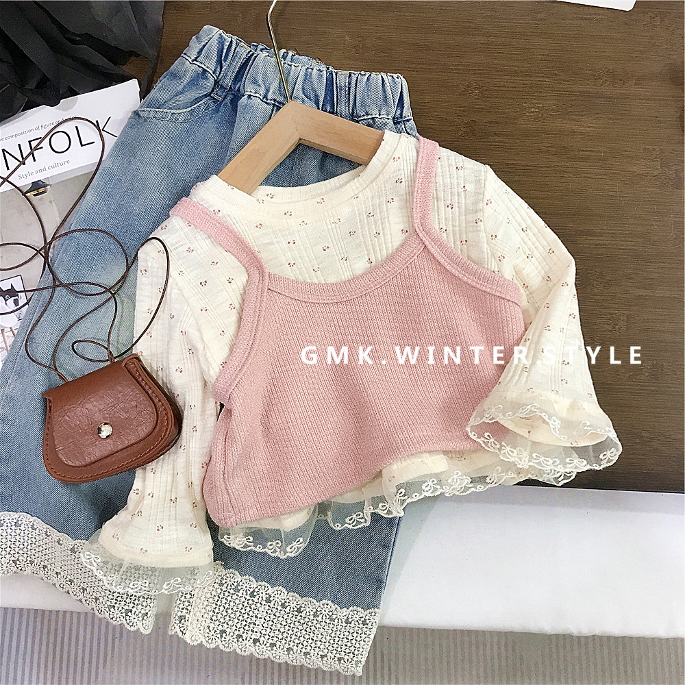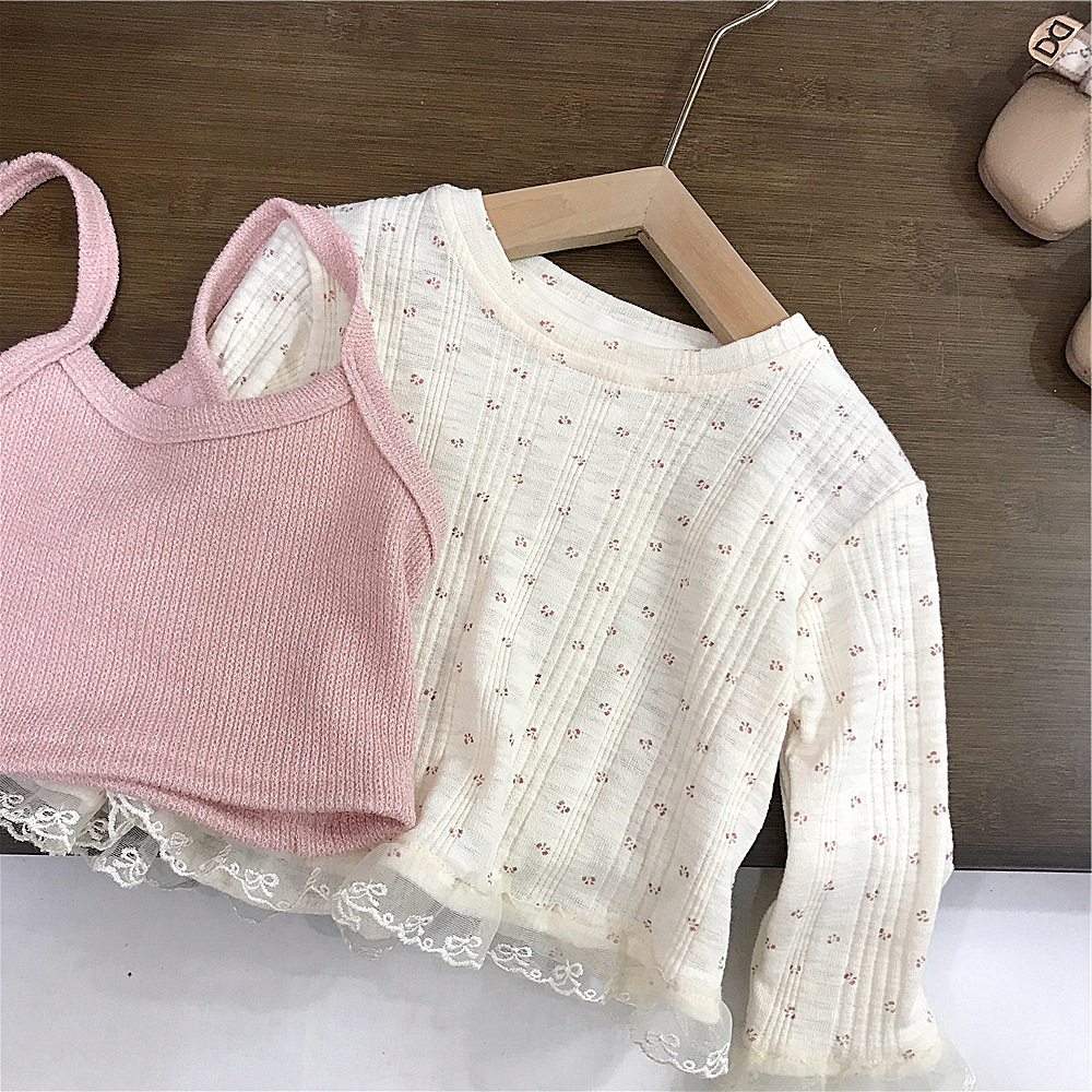 소녀의 봄 2025 새로운 세련된 꽃 셔츠 봄과 가을 패션 긴 소매 티셔츠 슬링 투피스 탑