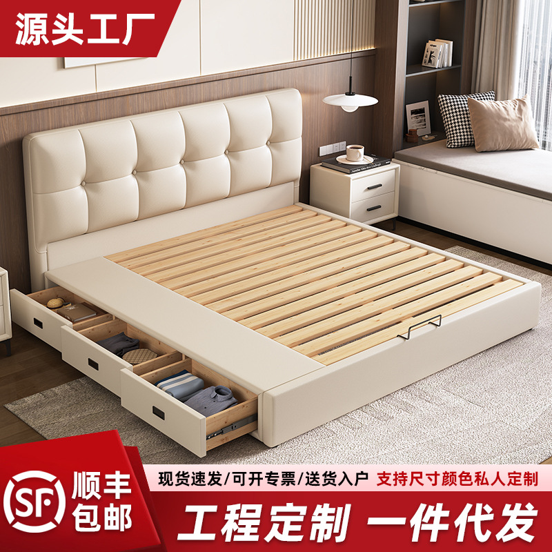 간단한 소프트 백 가죽 침대 공기 압력 저장 침대 다다가공 침대 작은 아파트 마스터 침실 큰 침대 단단한 나무 높은 상자 침대스토어 가기
