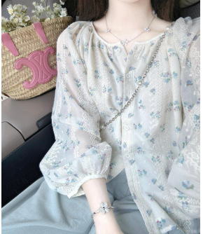 이른 봄 신선한 스타일 꽃 긴팔 셔츠 스몰 사이즈 느슨한 슬리밍 라운드 넥 달콤한 가리 스타일 올 매치 쉬폰 셔츠스토어 가기