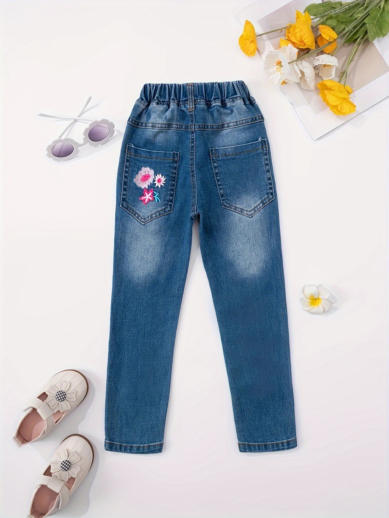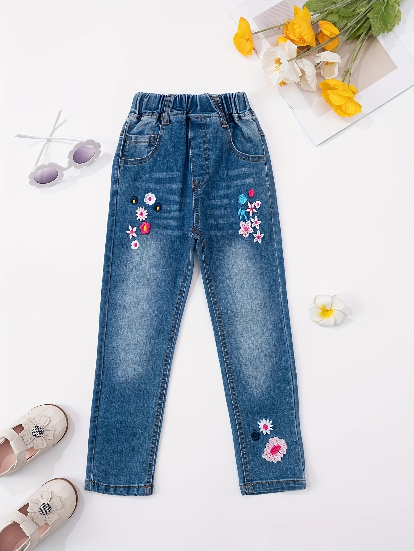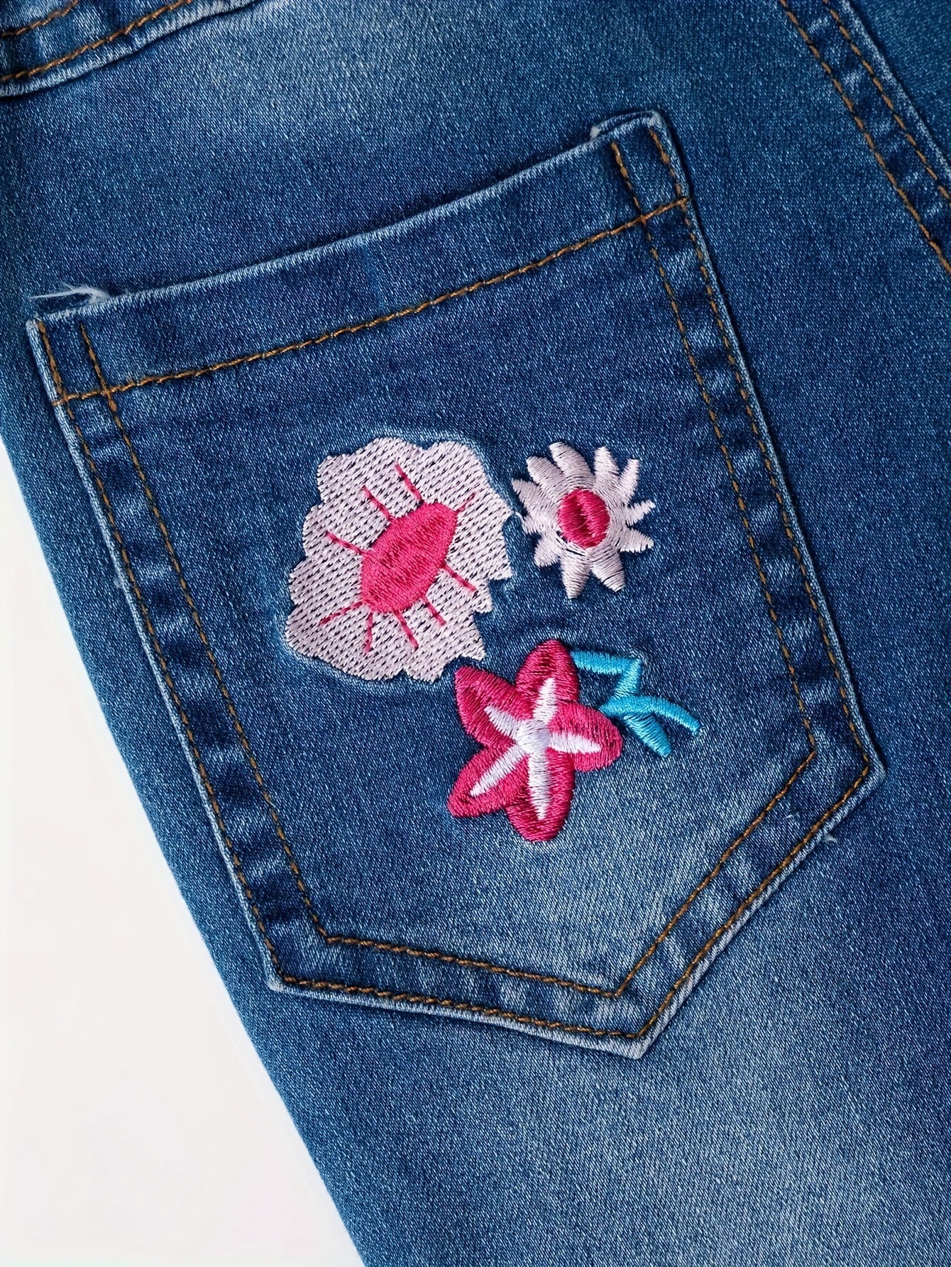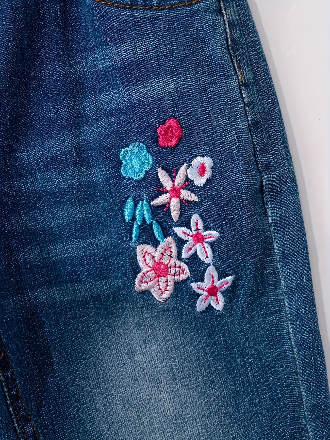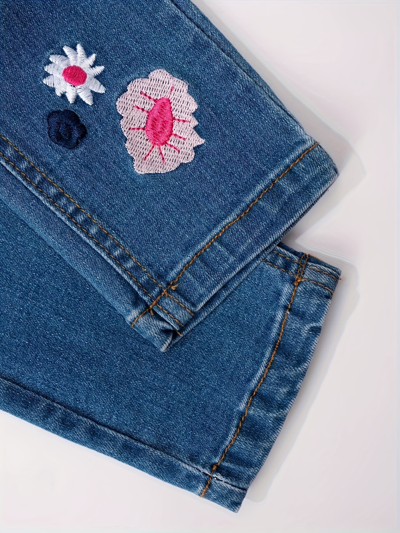 소녀의 새로운 올 매치 자수 핑크 꽃 바지 청바지스토어 가기