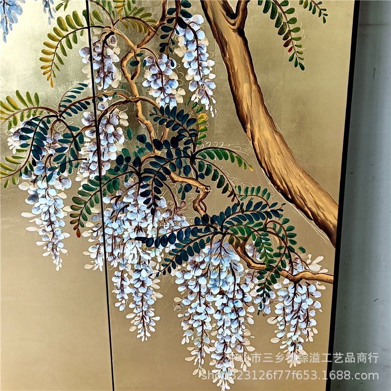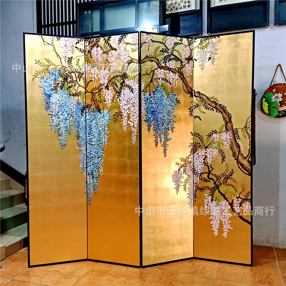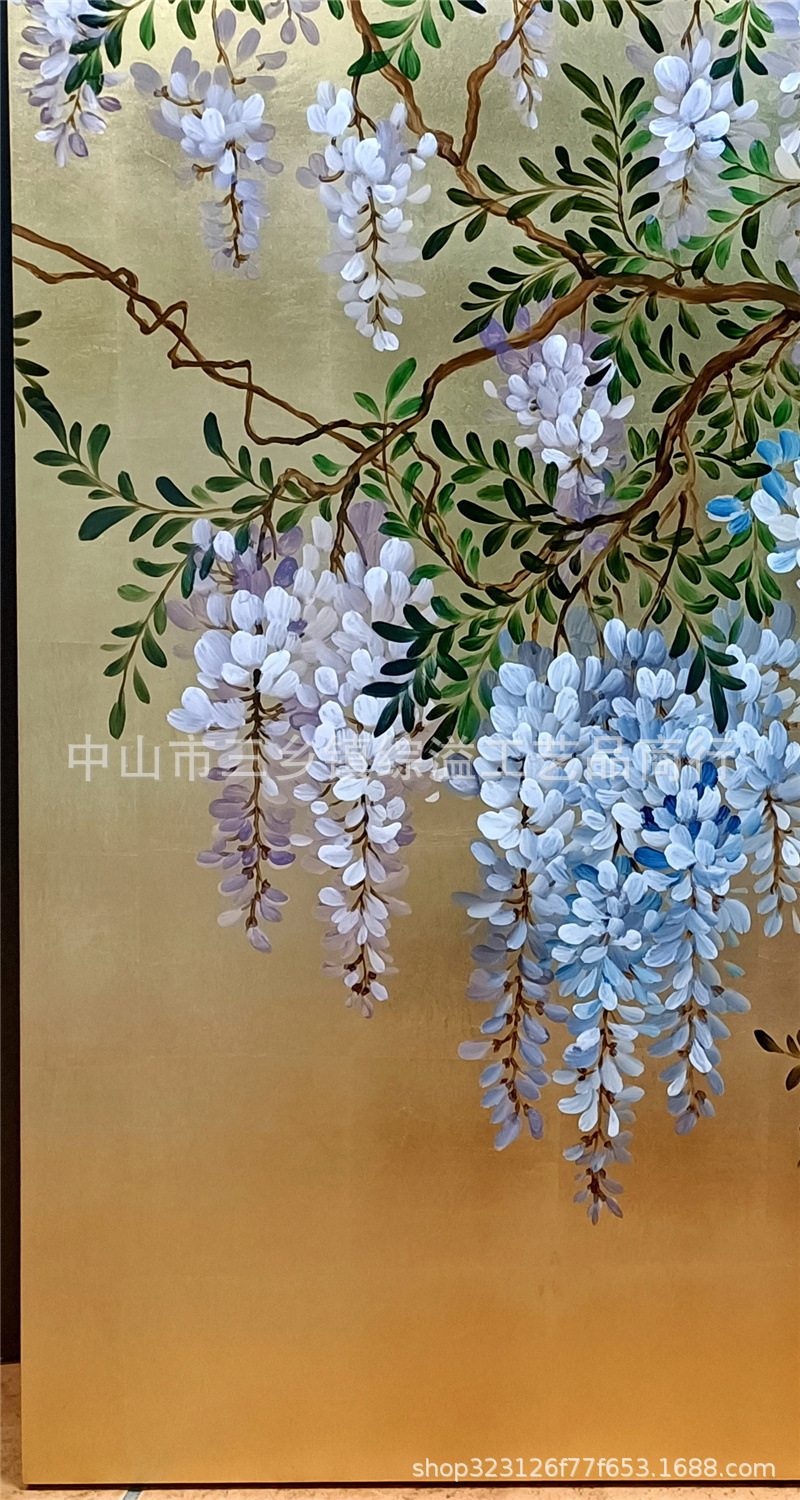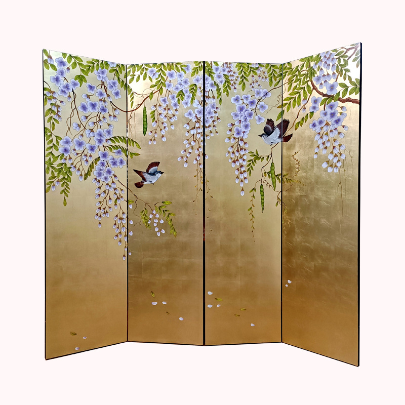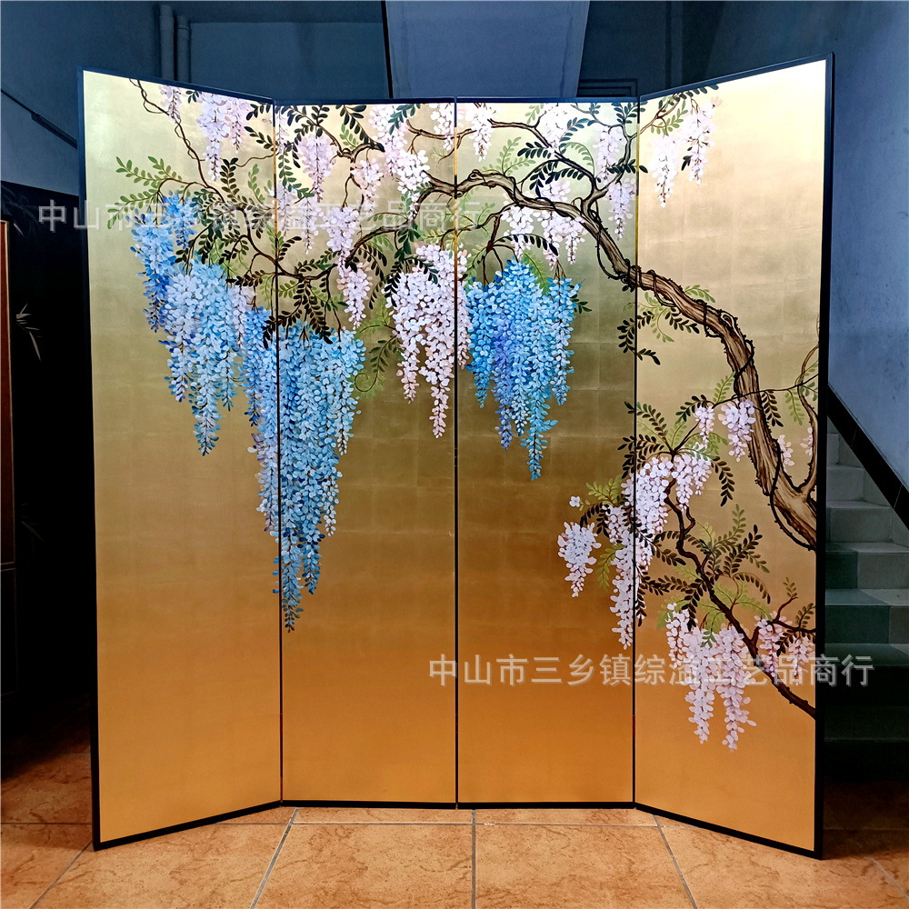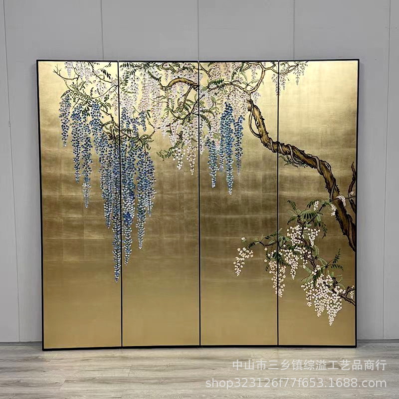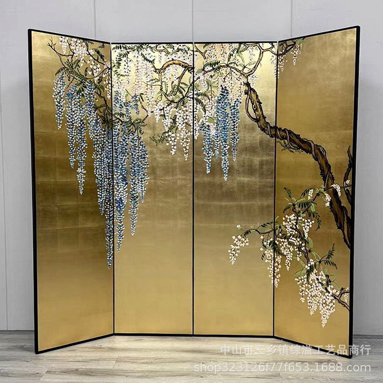 골드 호일 스크린 손으로 그린 등나무 꽃 거실 빌라 사무실 소파 배경 장식 접이식 화면 보라색 공기 동쪽