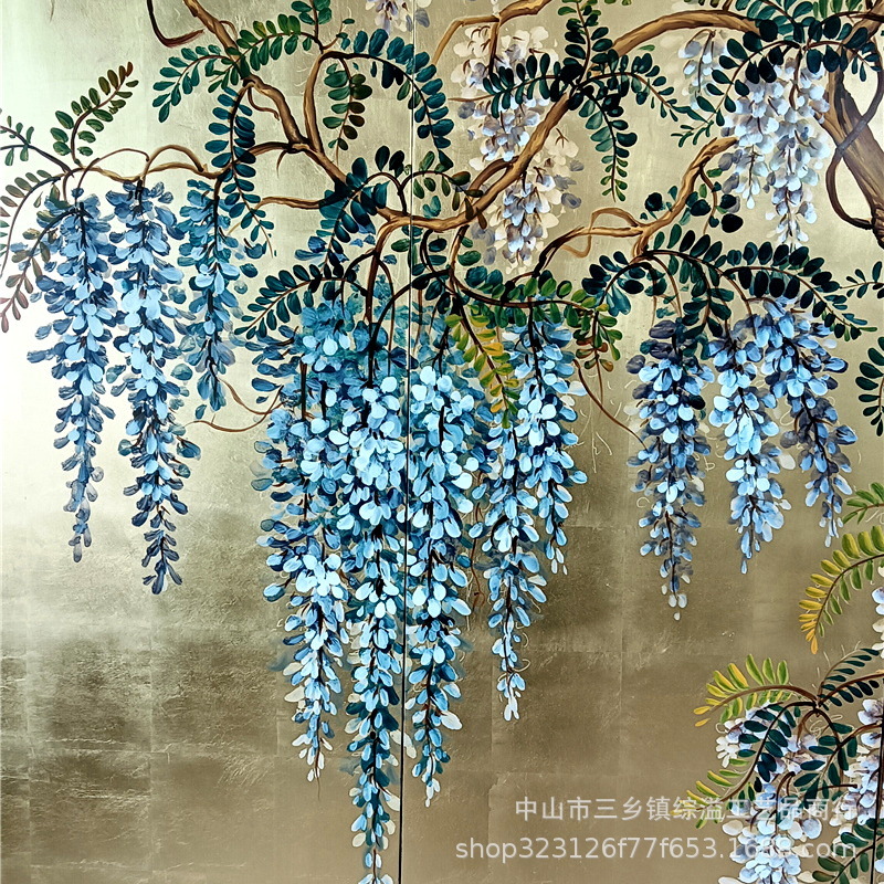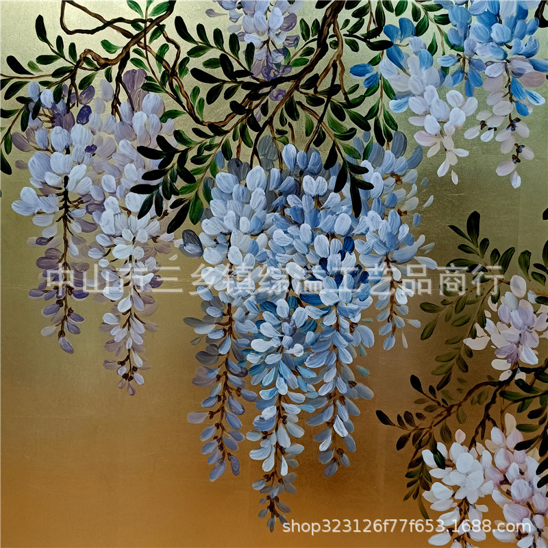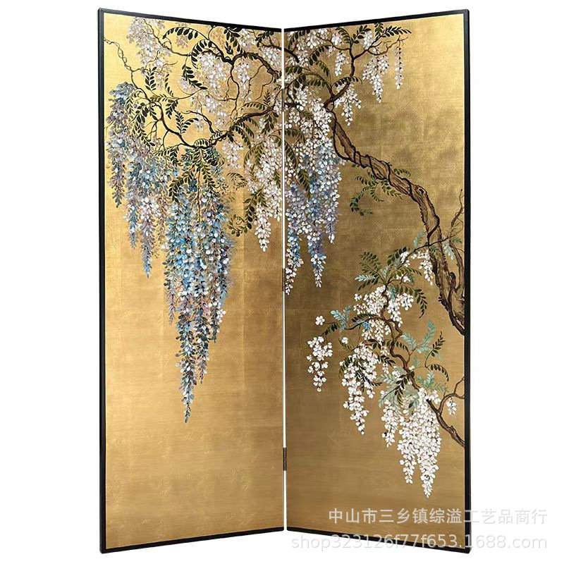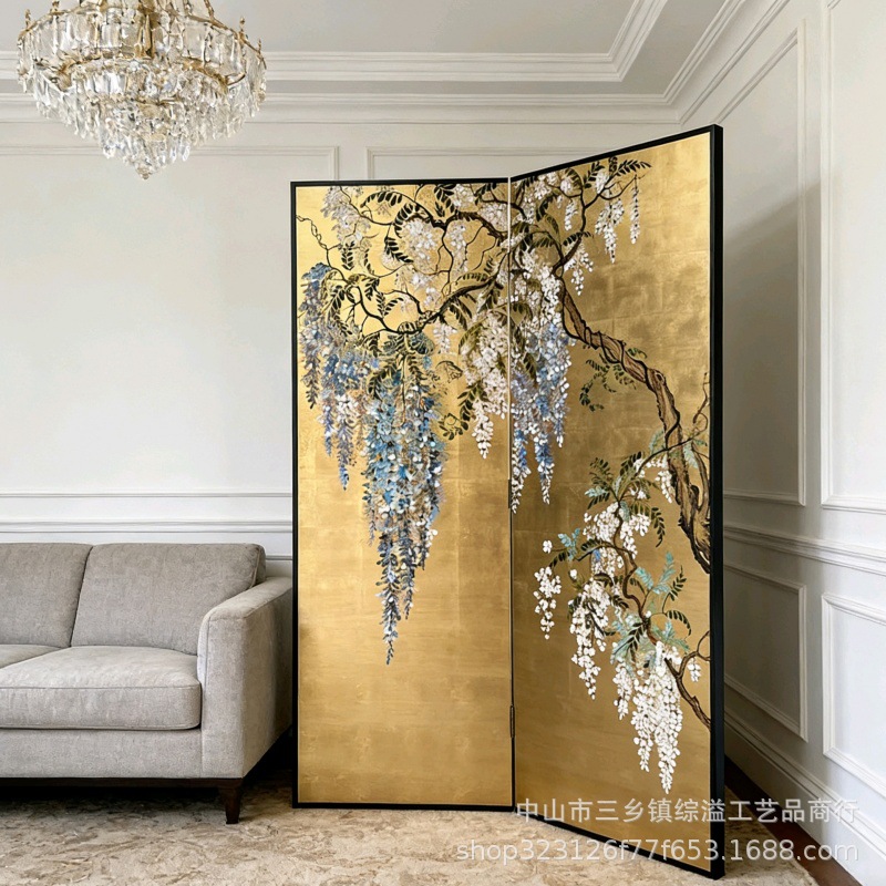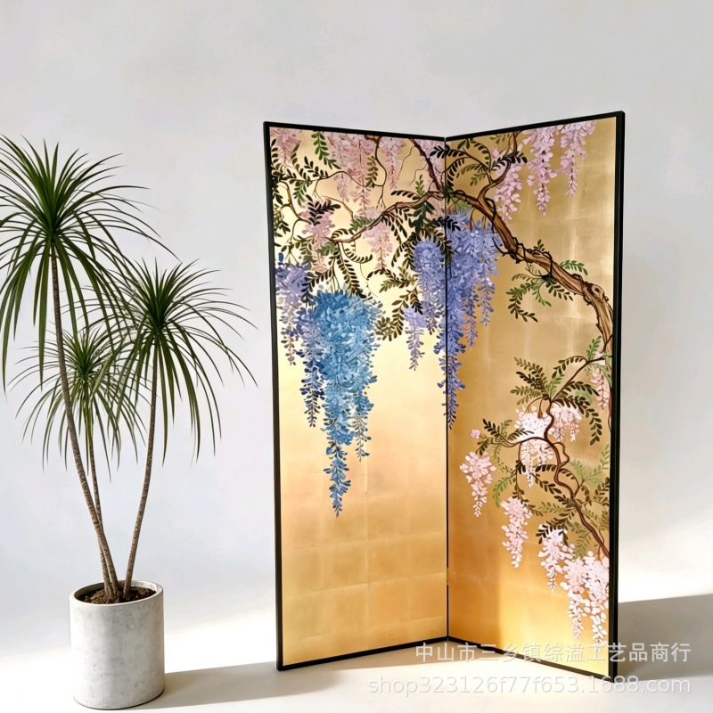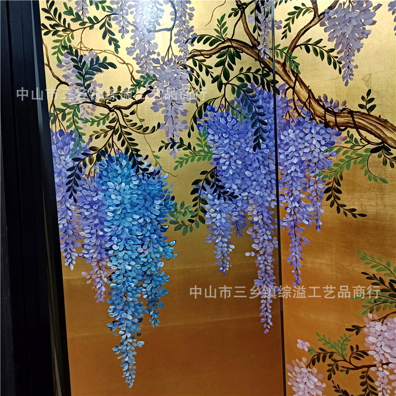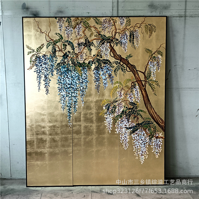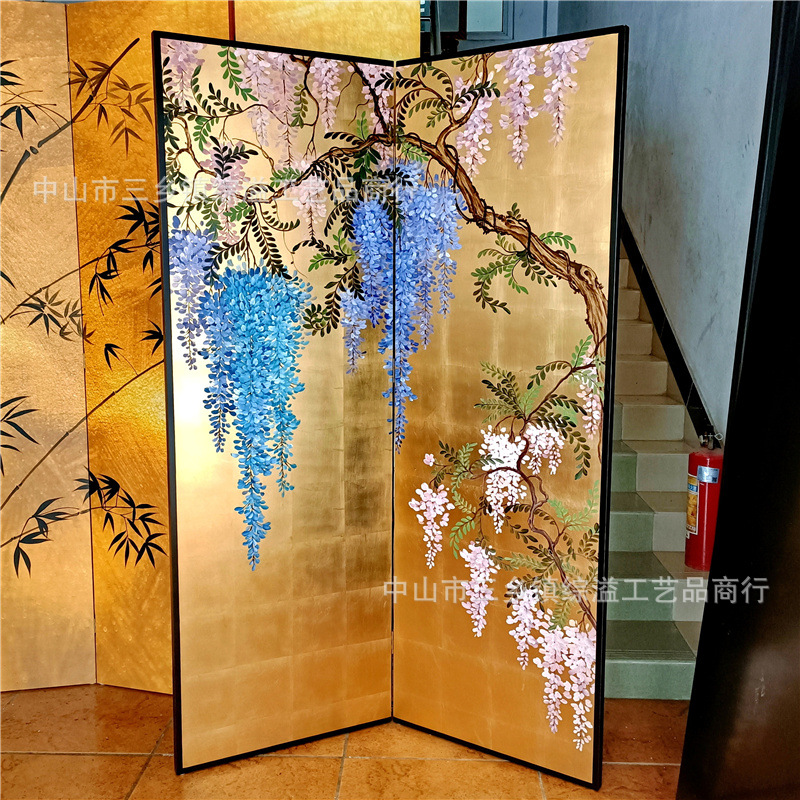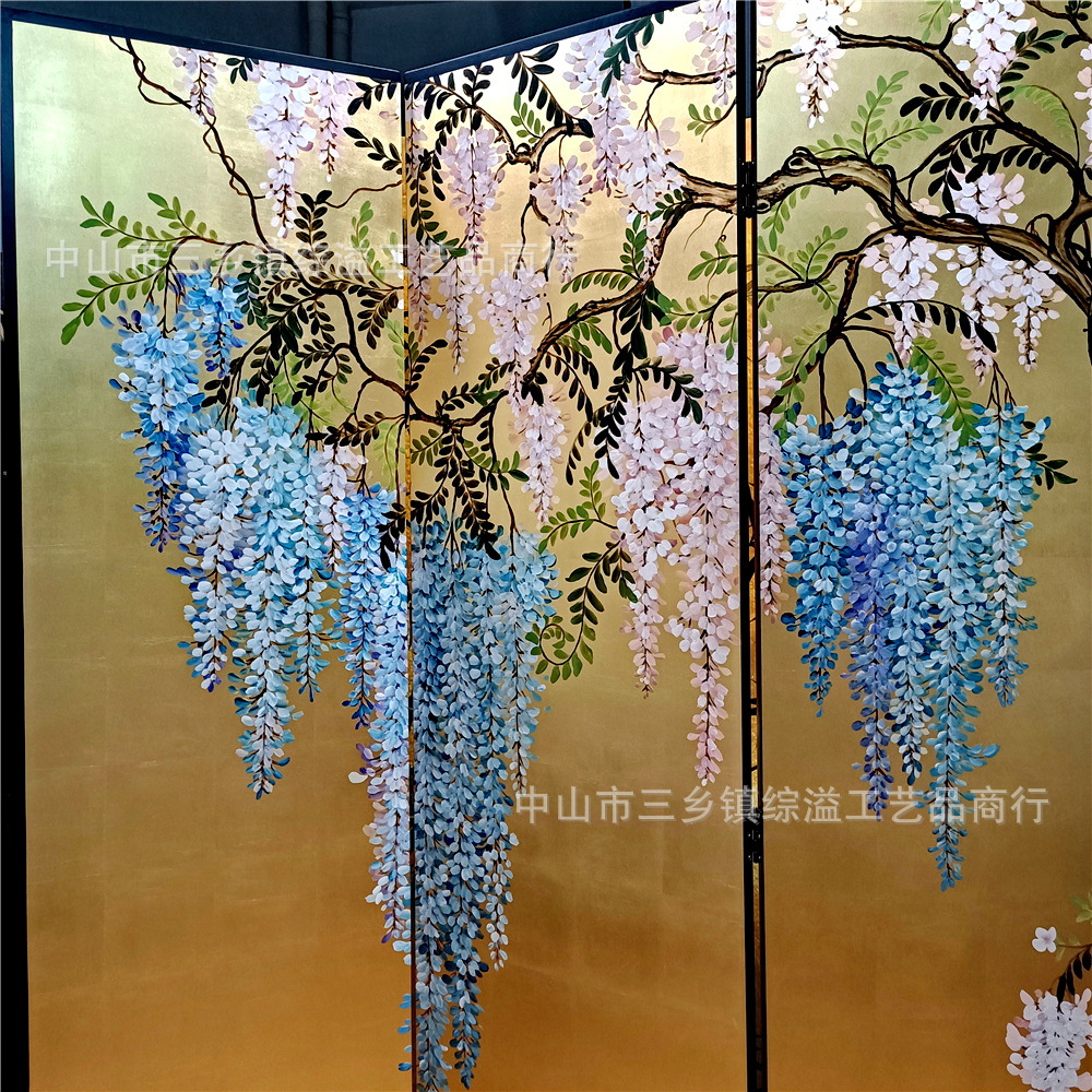 골드 호일 스크린 손으로 그린 등나무 꽃 거실 빌라 사무실 소파 배경 장식 접이식 화면 보라색 공기 동쪽