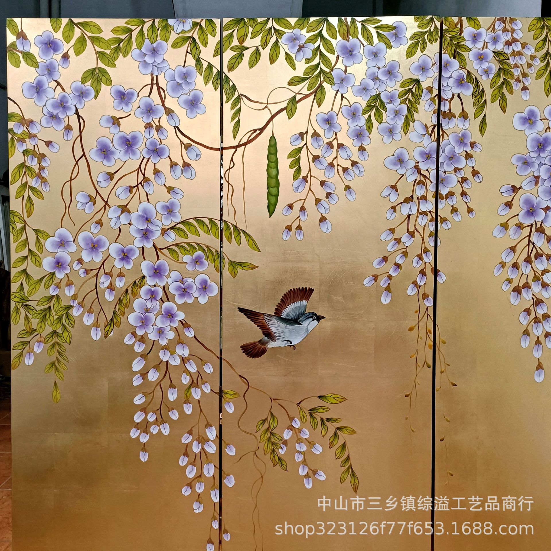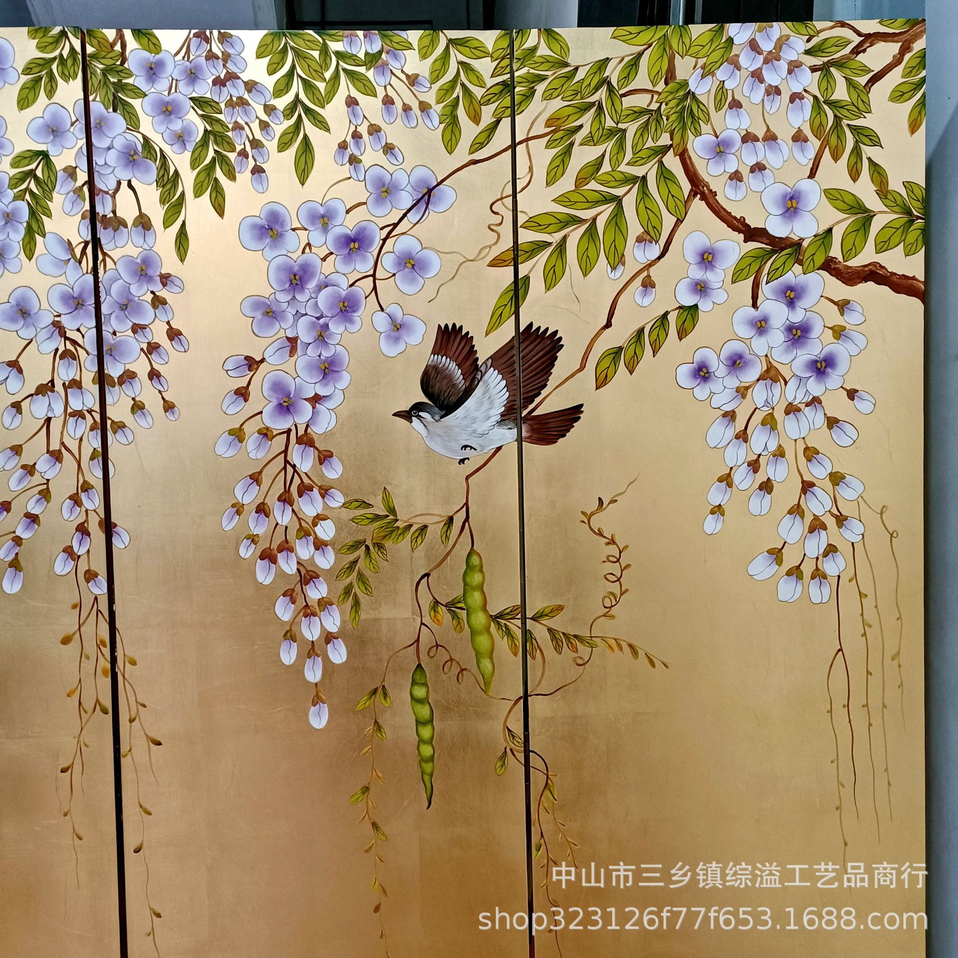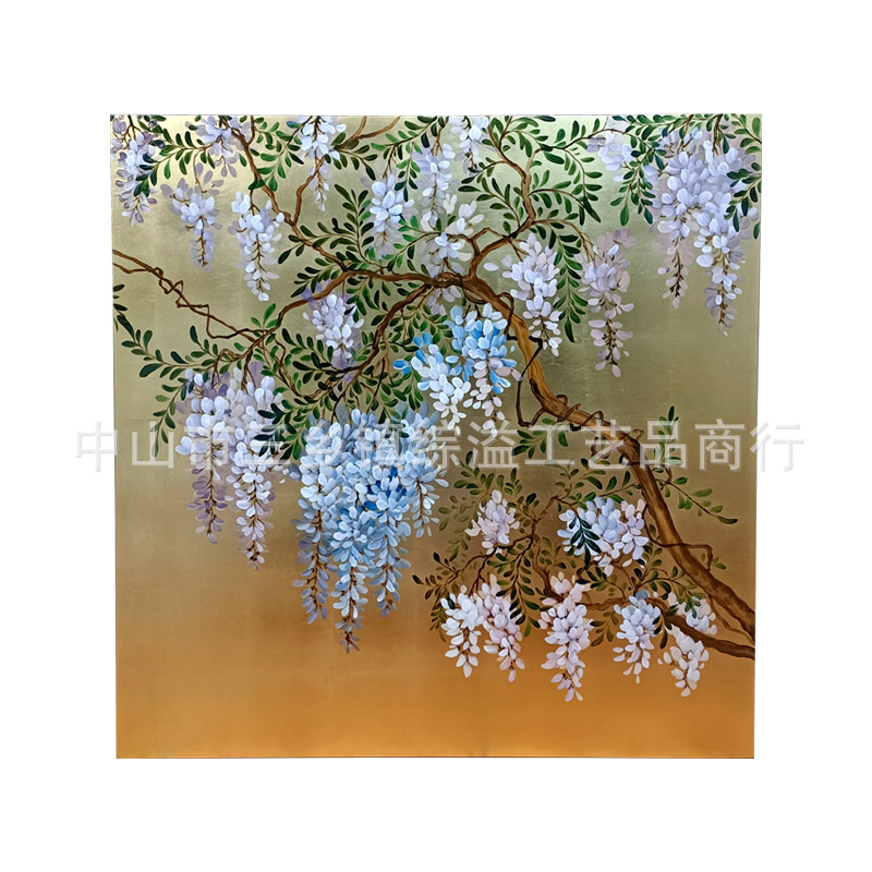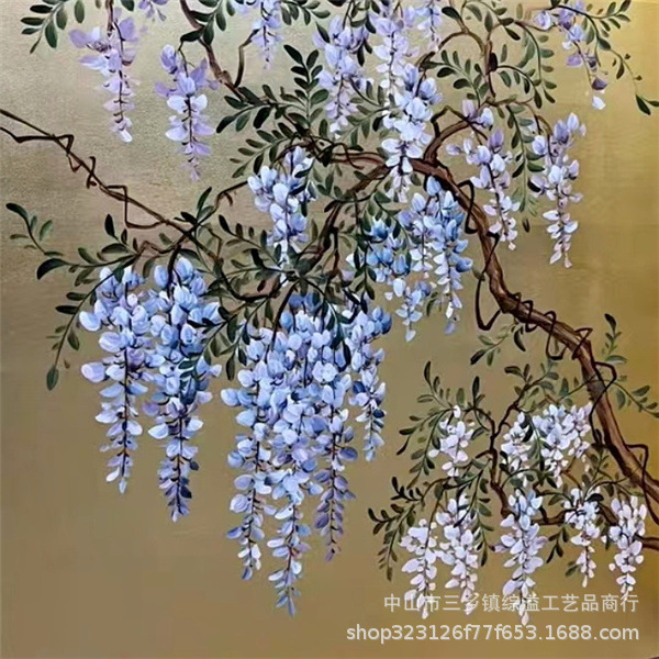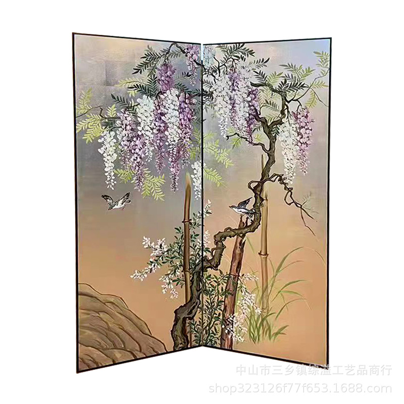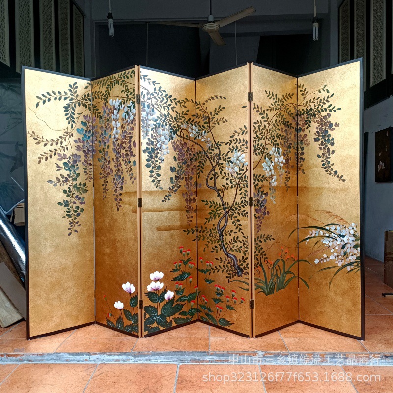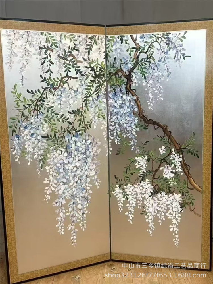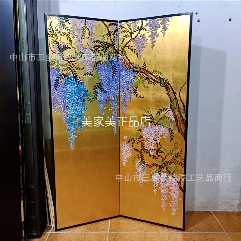 골드 호일 스크린 손으로 그린 등나무 꽃 거실 빌라 사무실 소파 배경 장식 접이식 화면 보라색 공기 동쪽