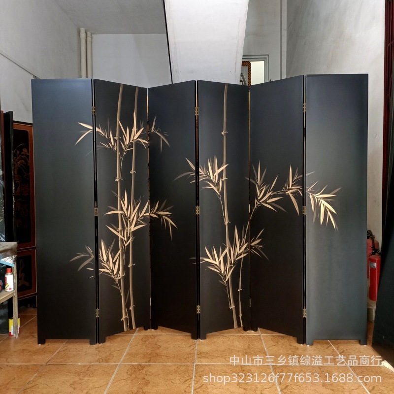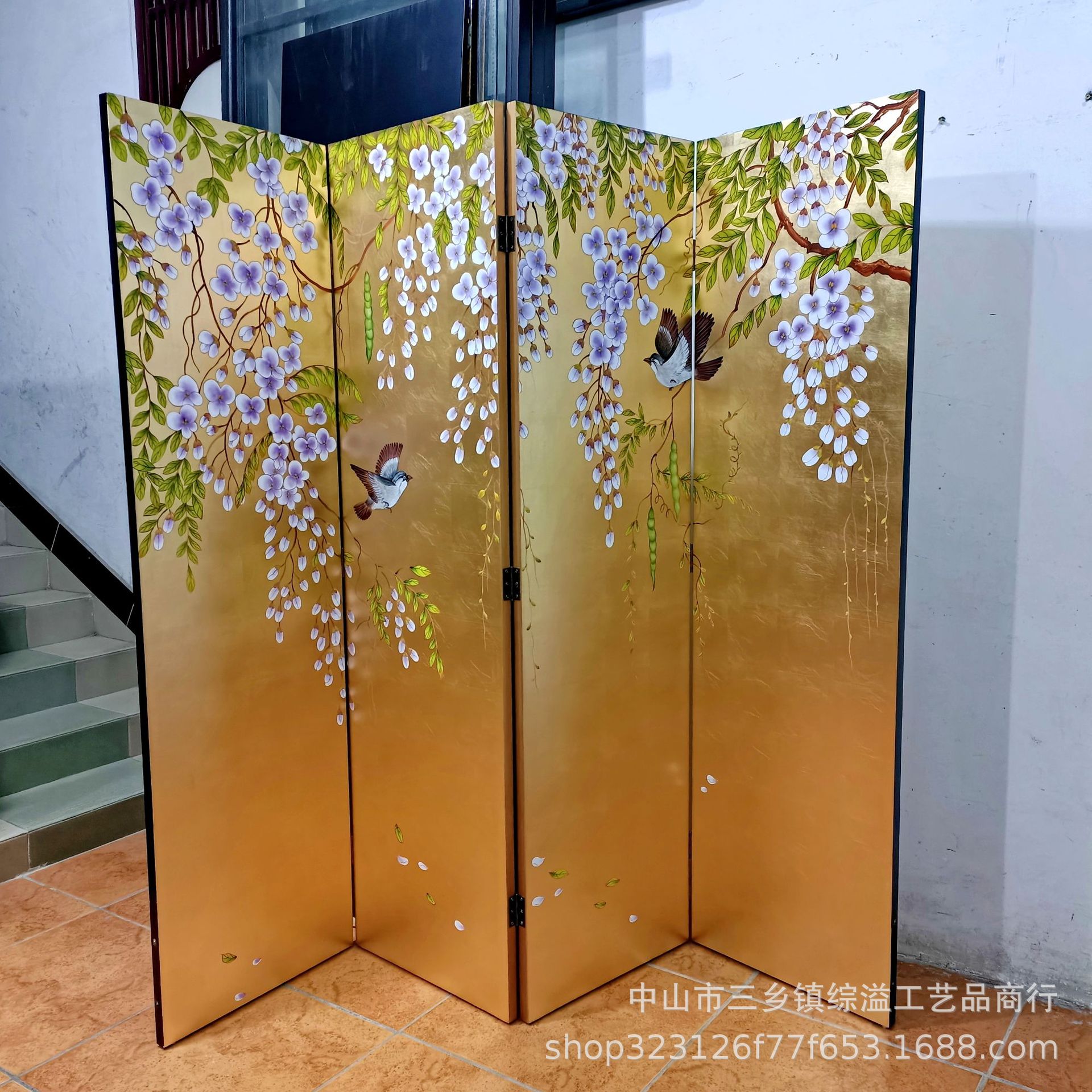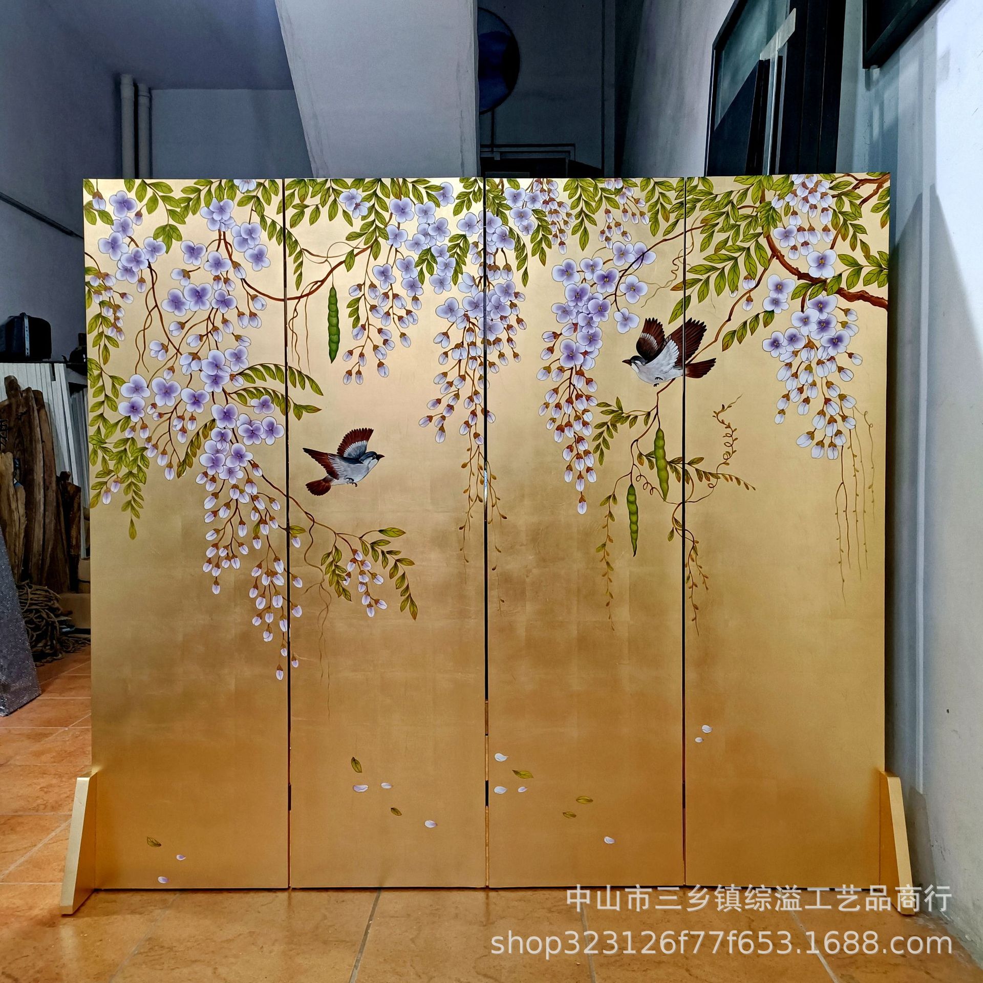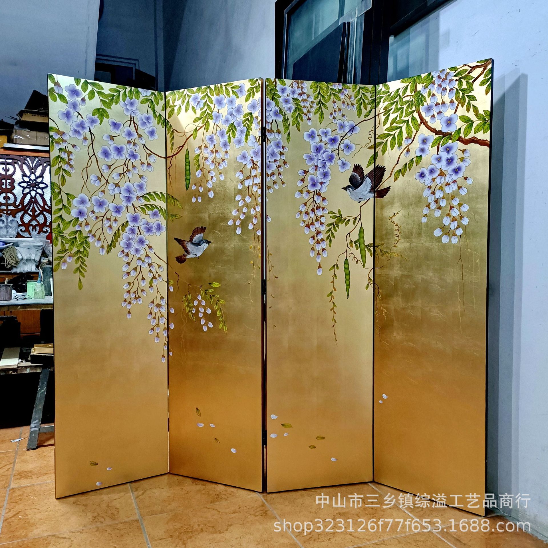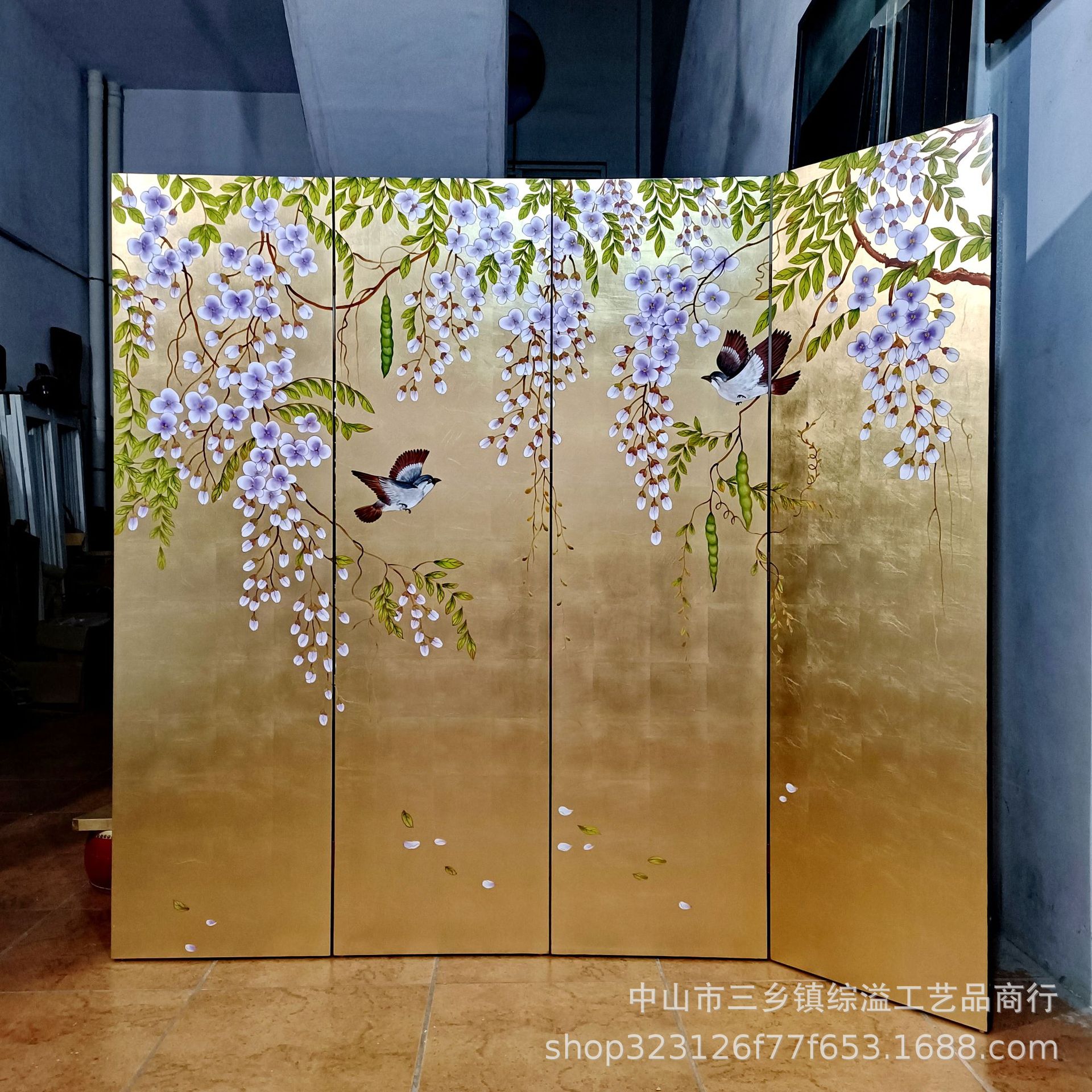 골드 호일 스크린 손으로 그린 등나무 꽃 거실 빌라 사무실 소파 배경 장식 접이식 화면 보라색 공기 동쪽