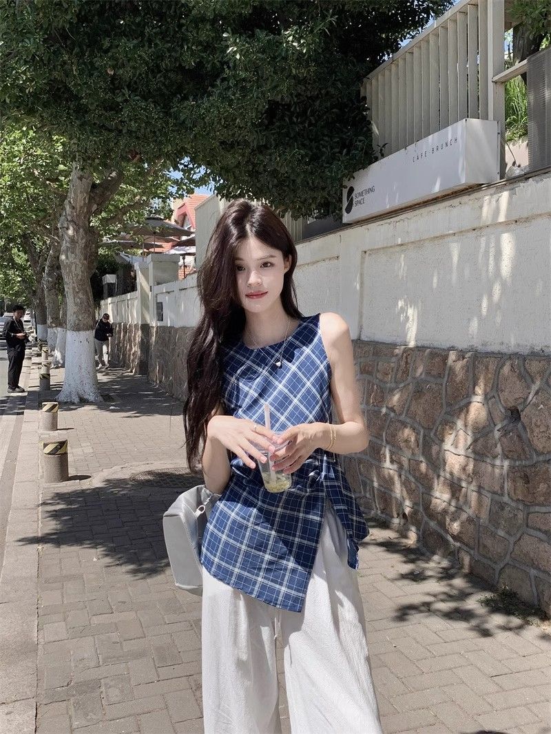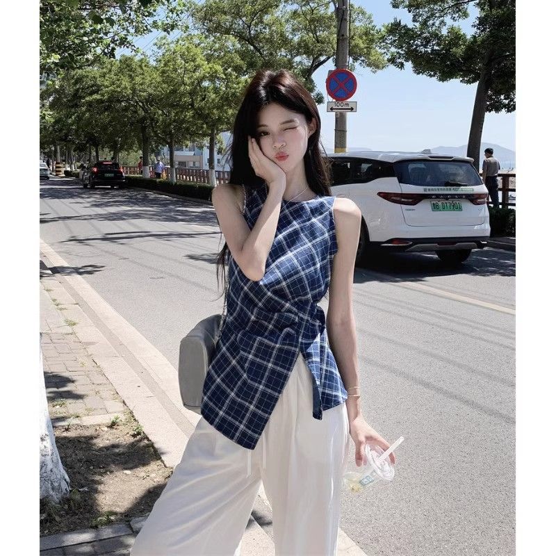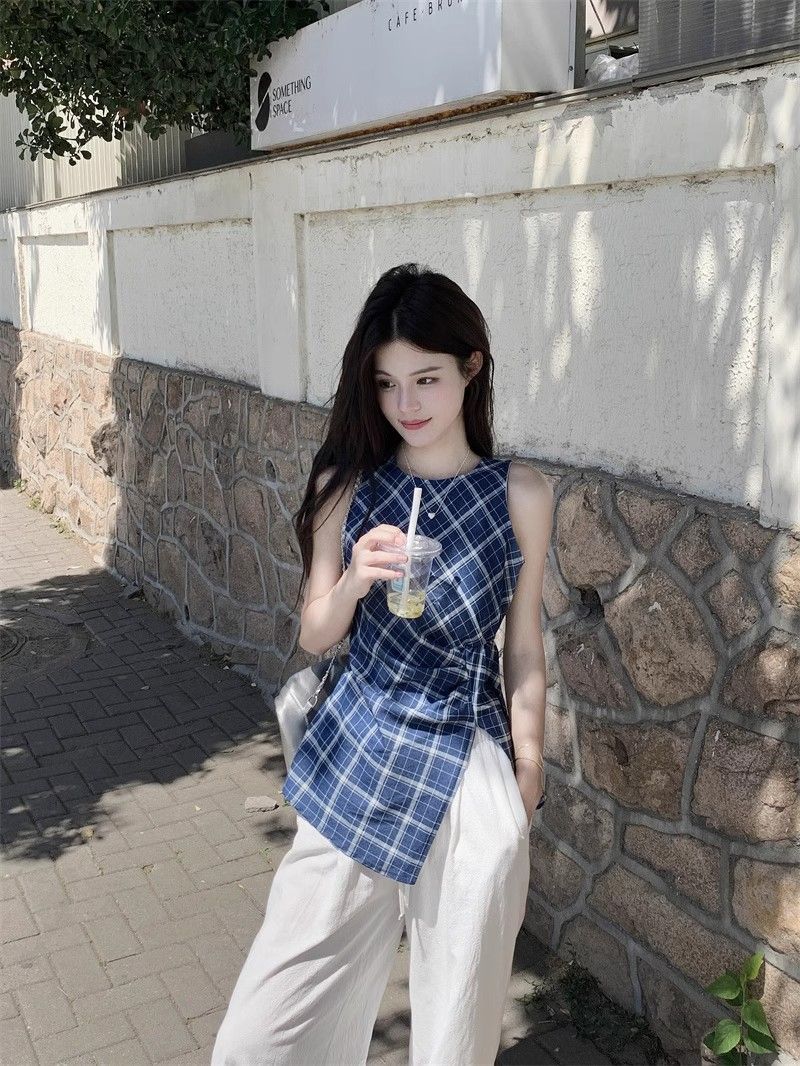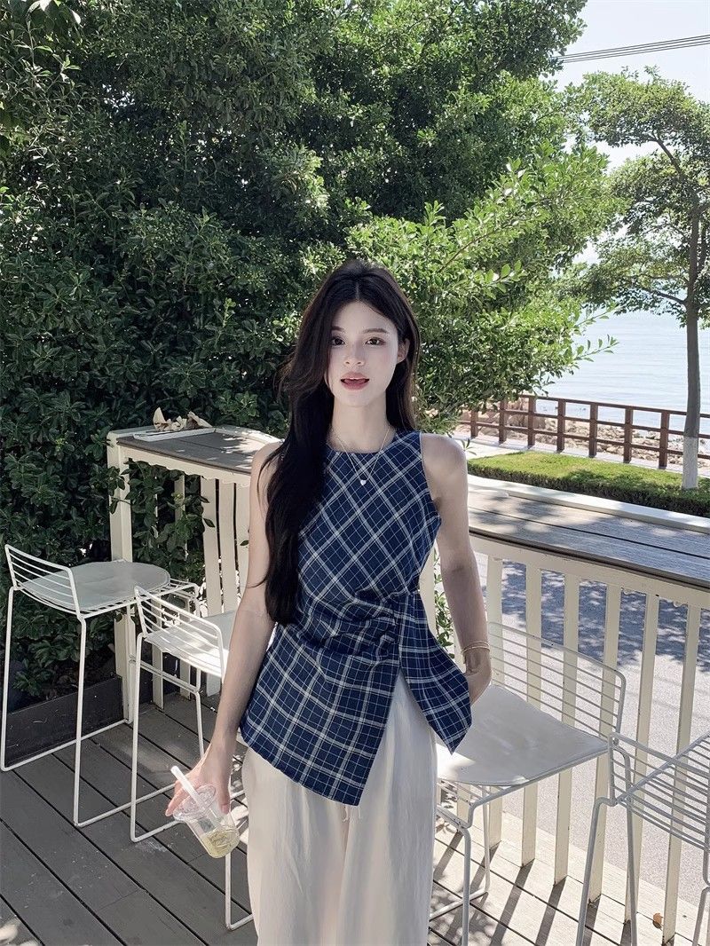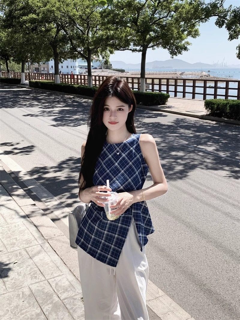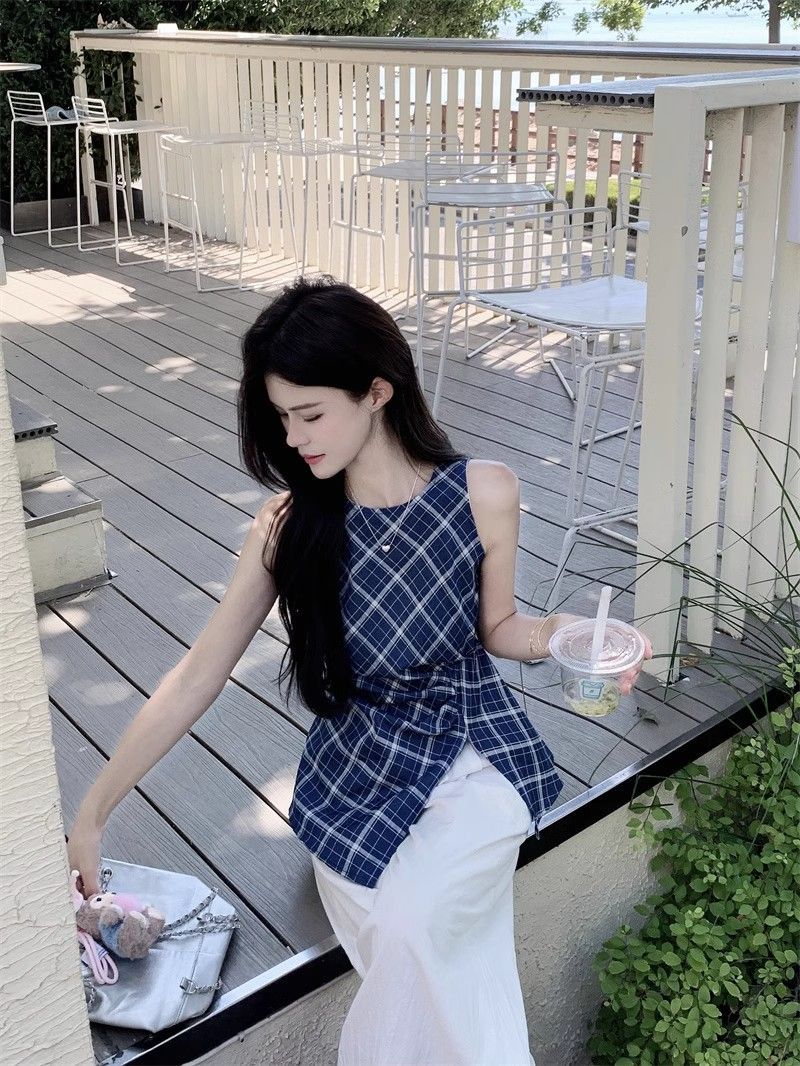 프렌치 레트로 블루 격자 무늬 라운드 넥 조끼 셔츠 여성 디자인 센스 틈새 우아한 슬림 핏 스플릿 민소매 탑스토어 가기