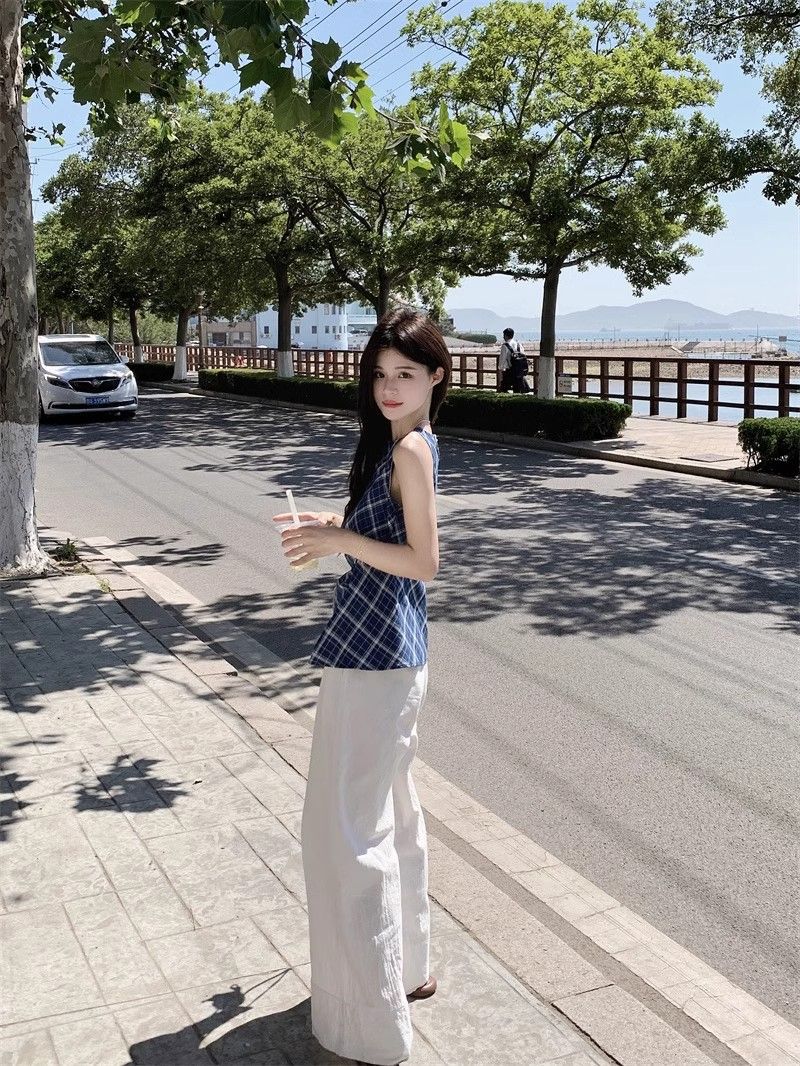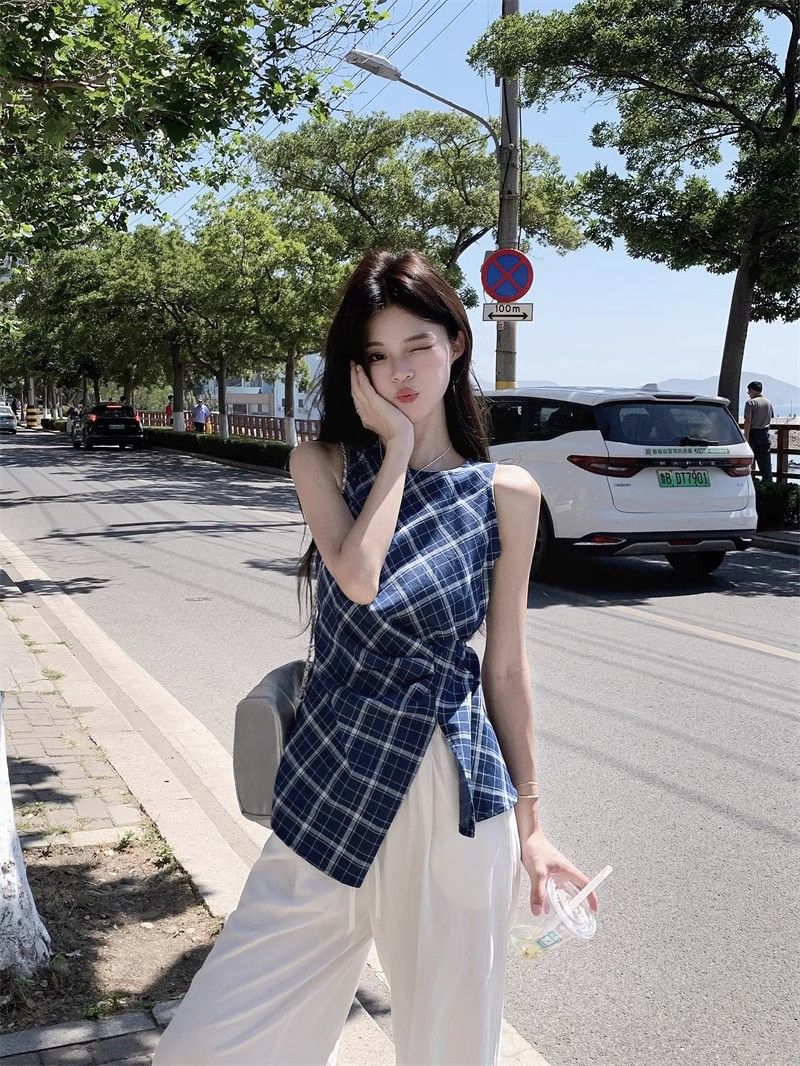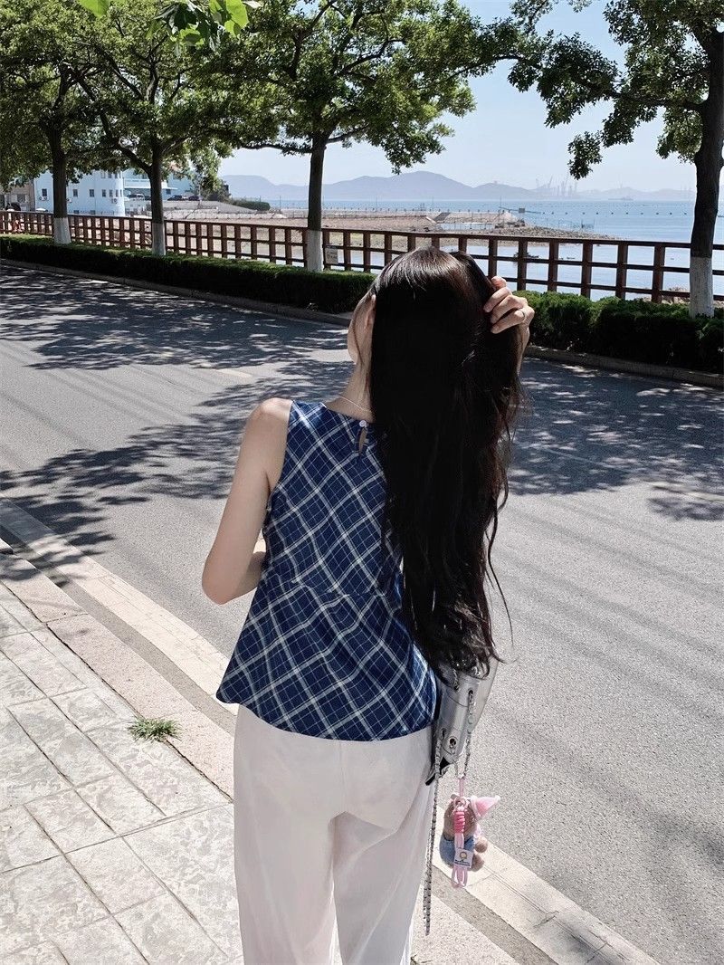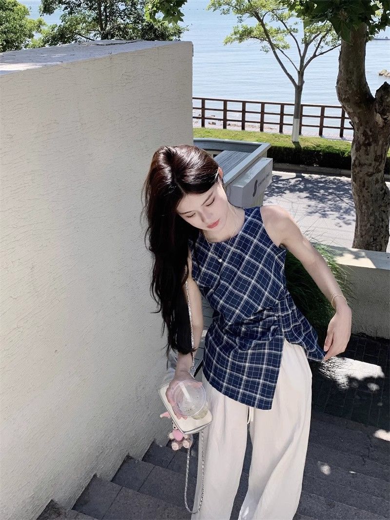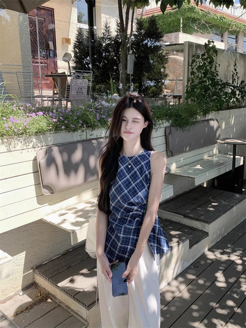 프렌치 레트로 블루 격자 무늬 라운드 넥 조끼 셔츠 여성 디자인 센스 틈새 우아한 슬림 핏 스플릿 민소매 탑스토어 가기