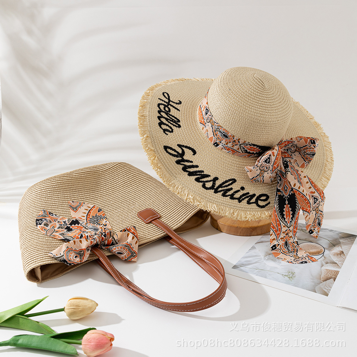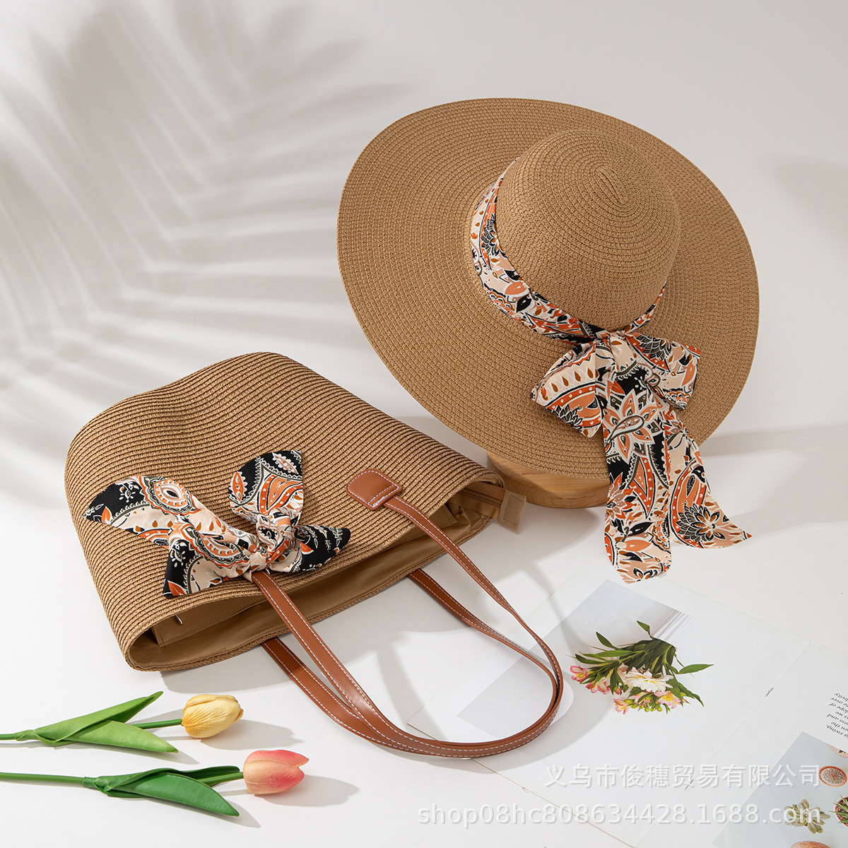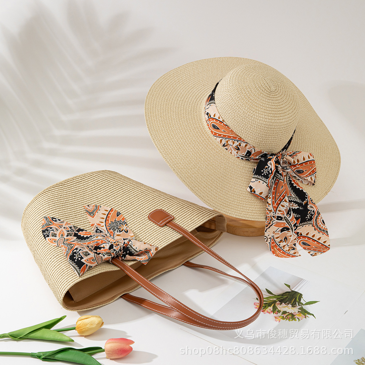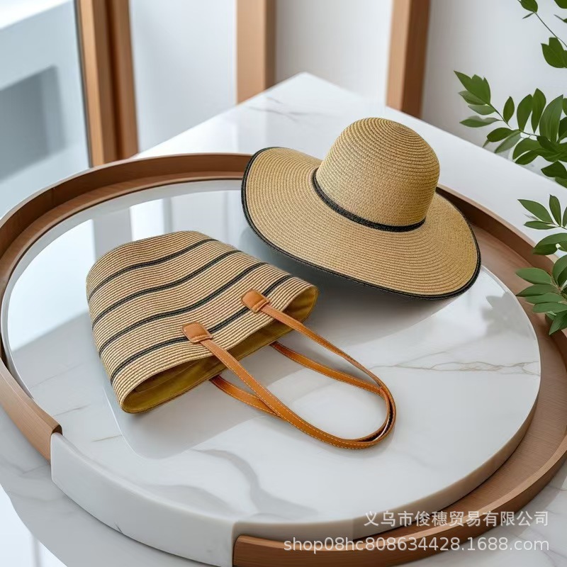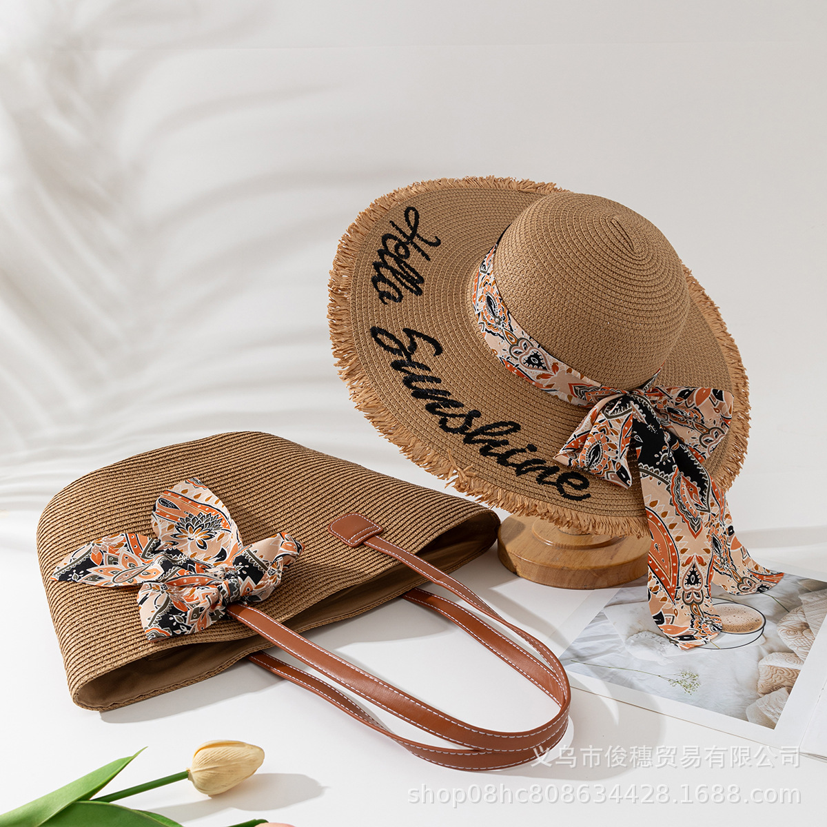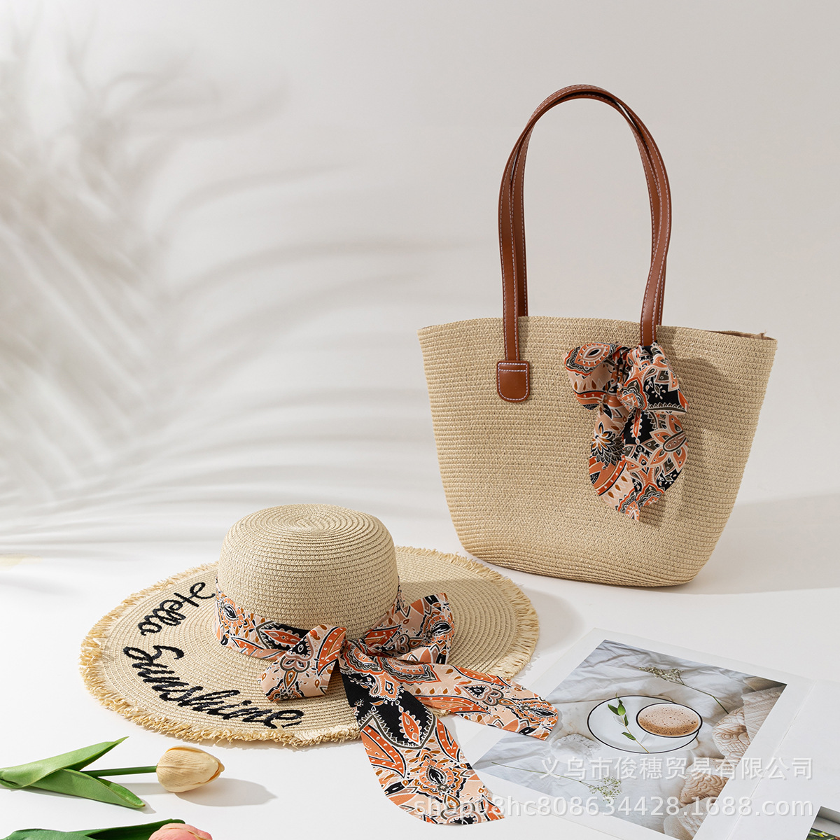 국경 간 밀짚 모자 가방 세트 해변 휴가 패션 올 매치 태양 보호 및 양산 여행 대용량 토트 백