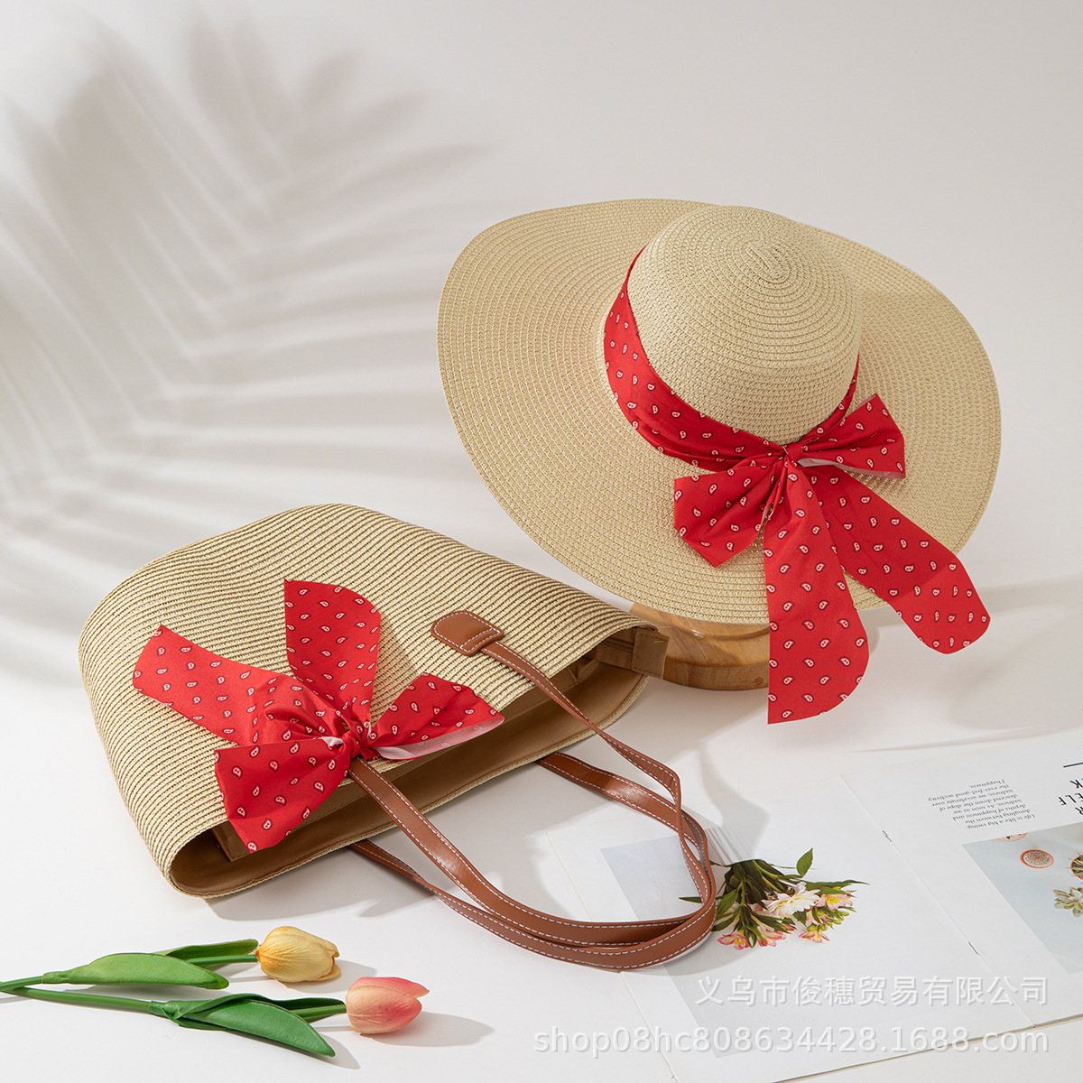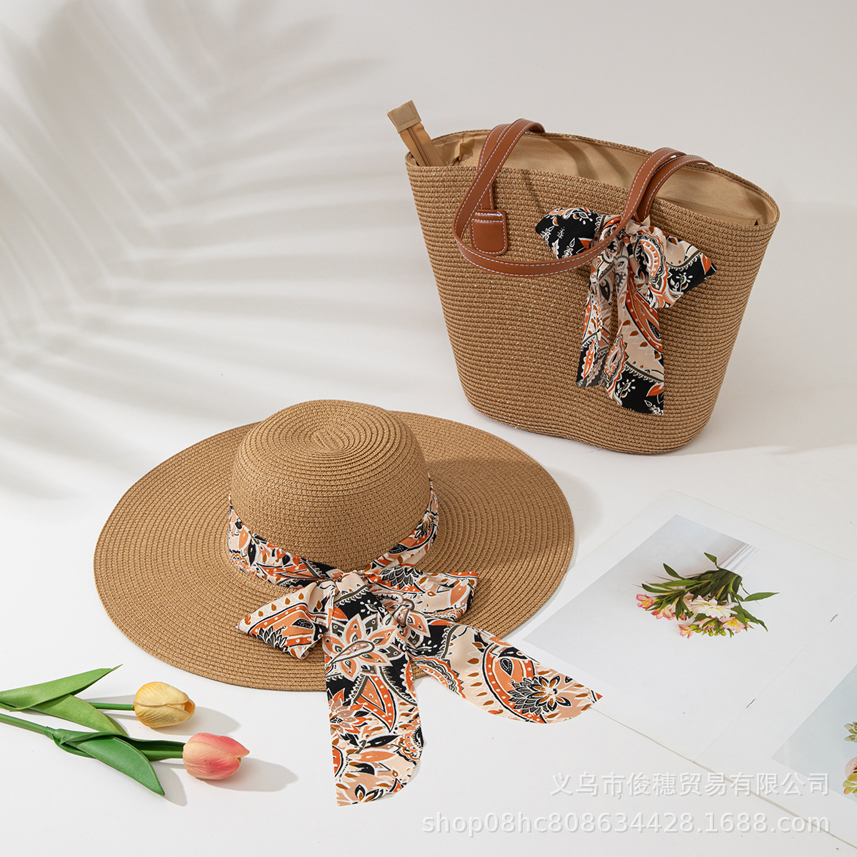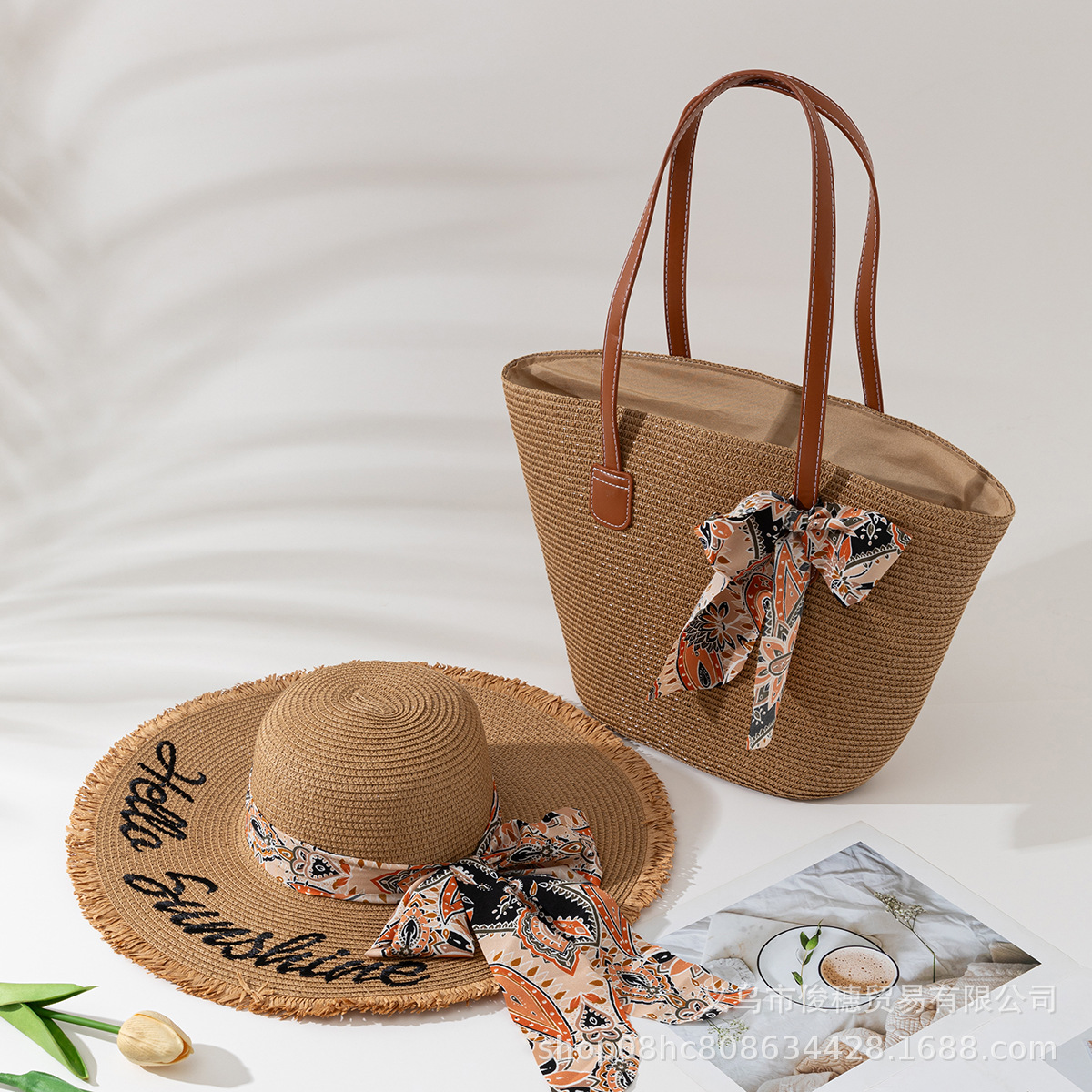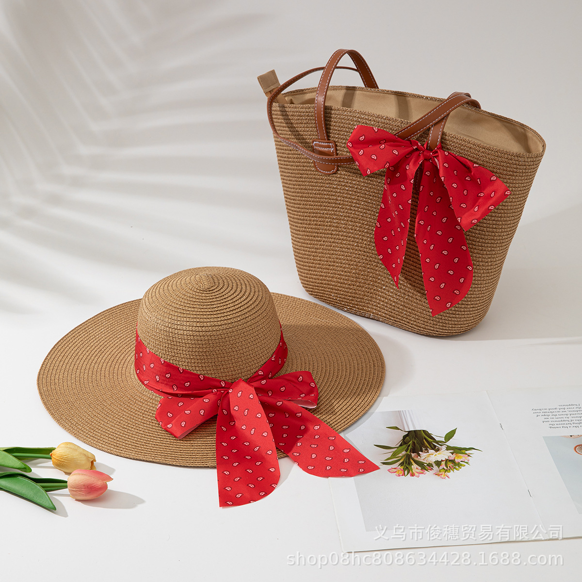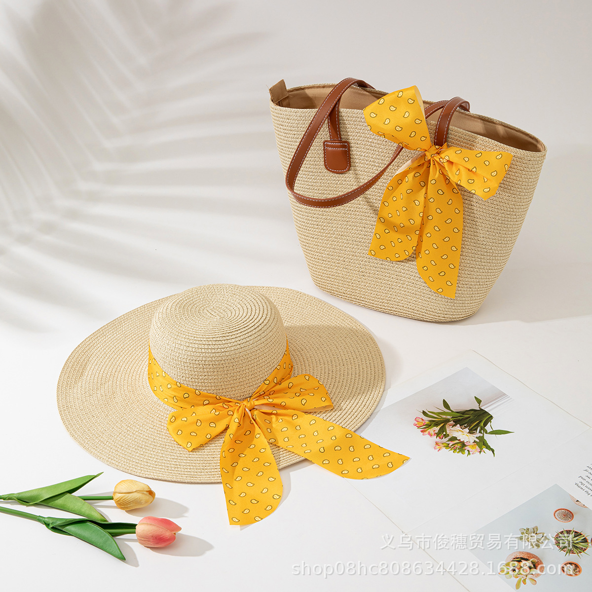 국경 간 밀짚 모자 가방 세트 해변 휴가 패션 올 매치 태양 보호 및 양산 여행 대용량 토트 백