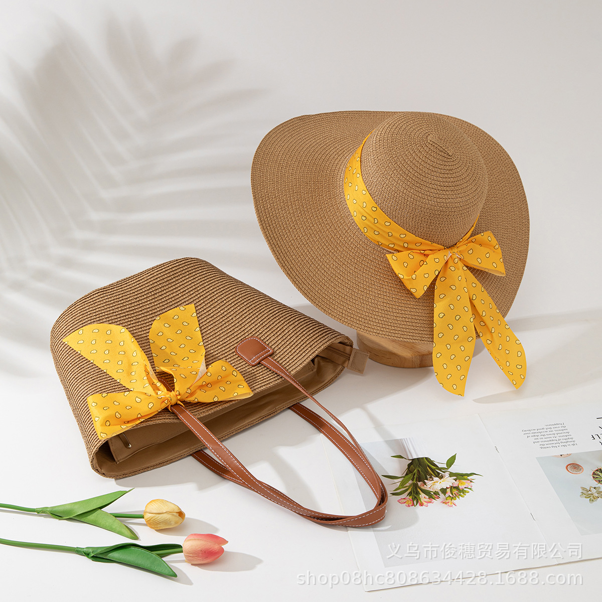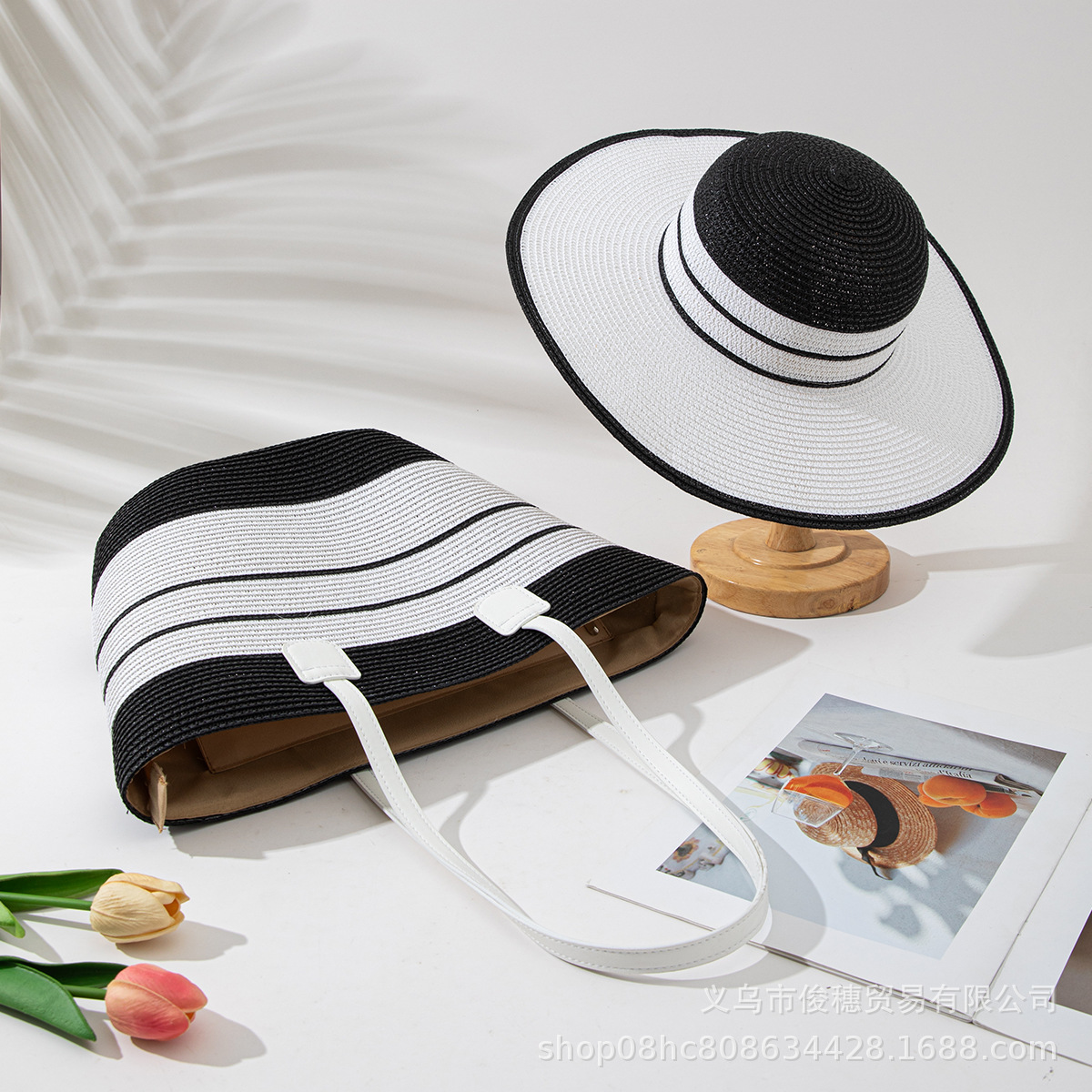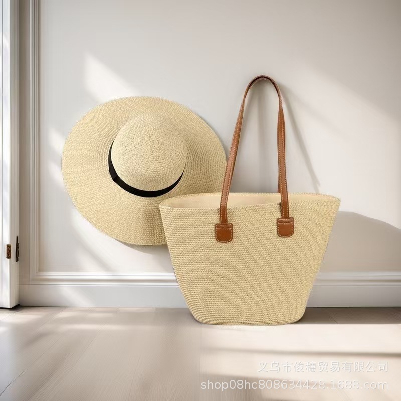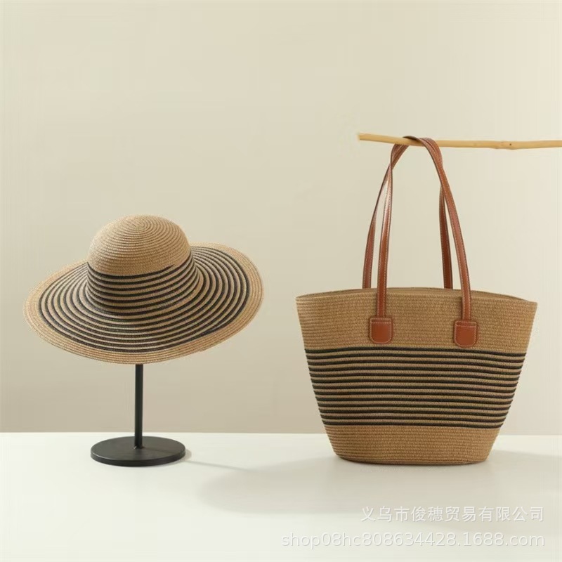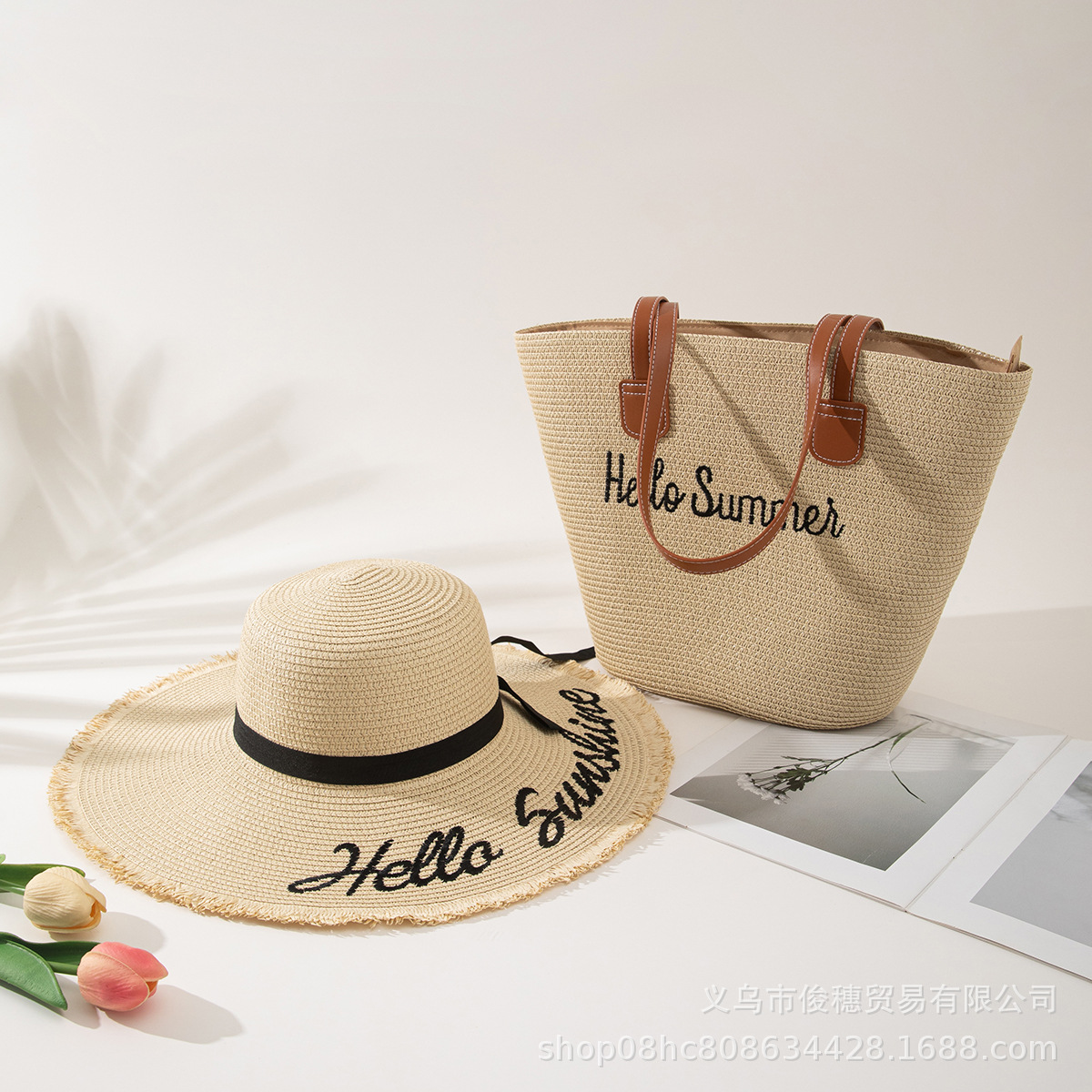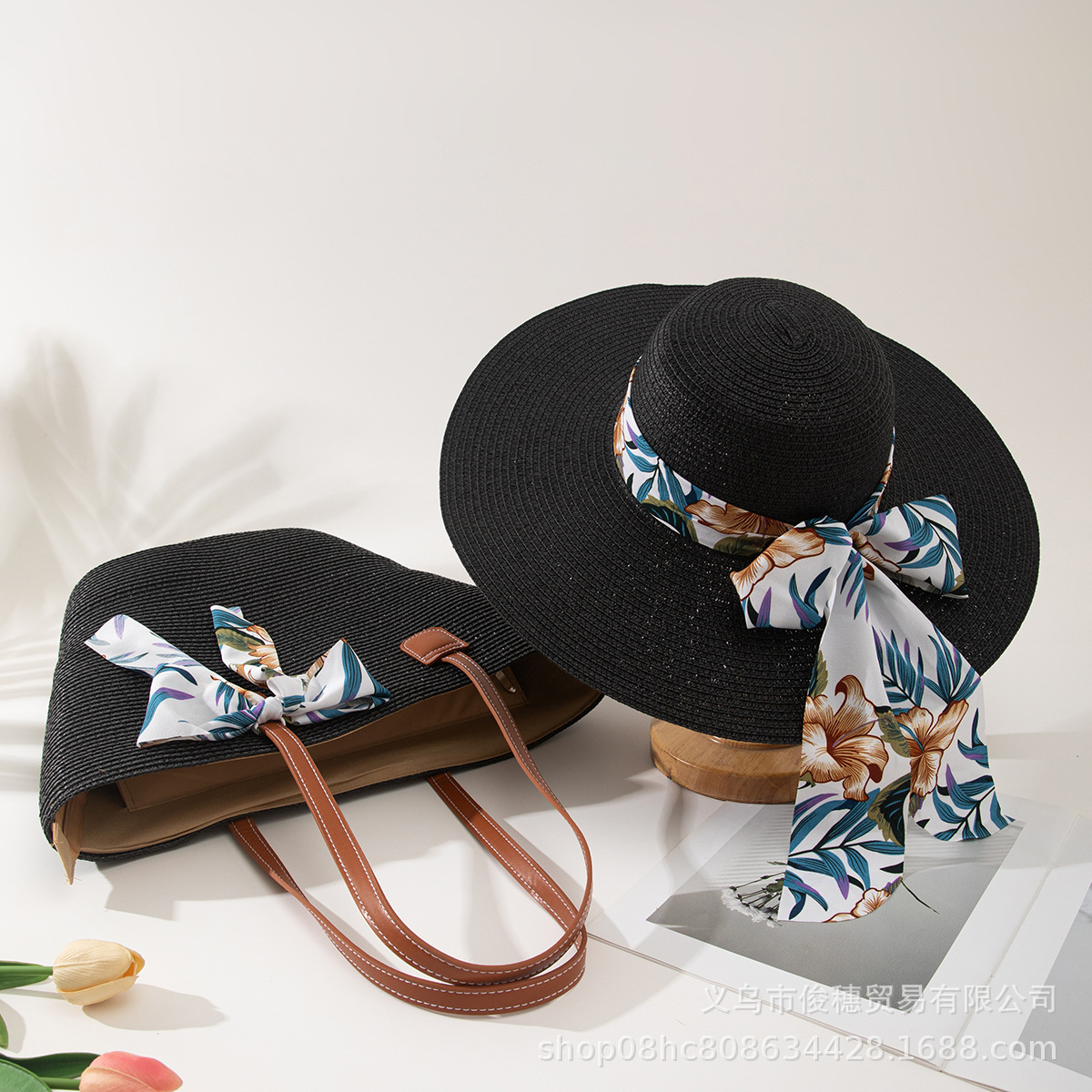 국경 간 밀짚 모자 가방 세트 해변 휴가 패션 올 매치 태양 보호 및 양산 여행 대용량 토트 백