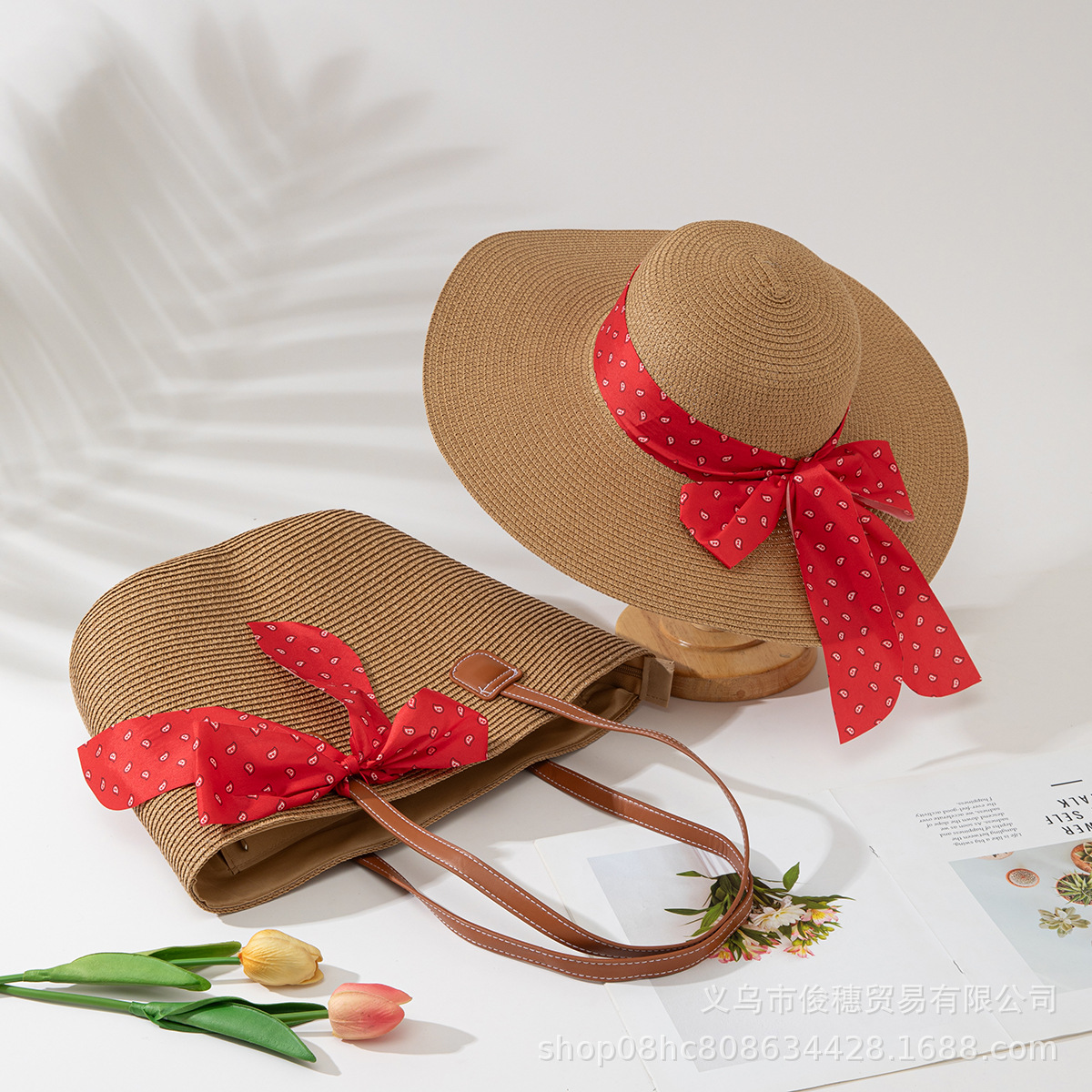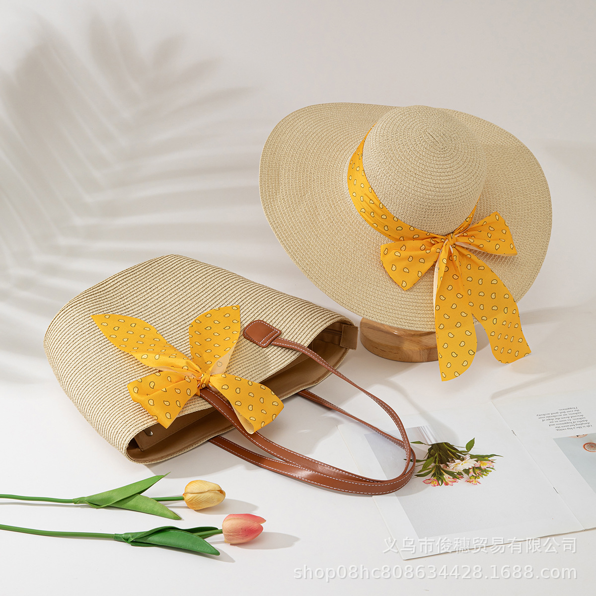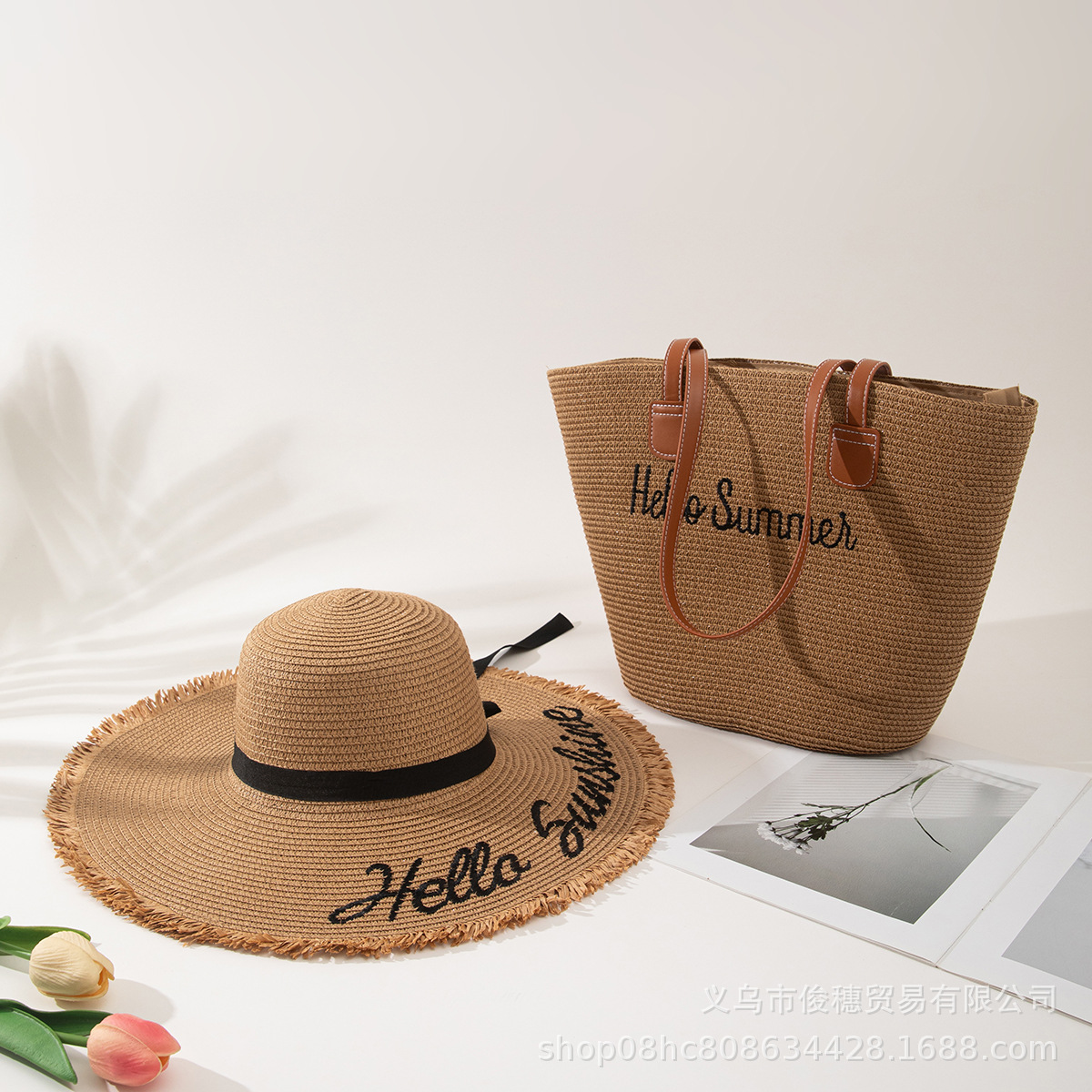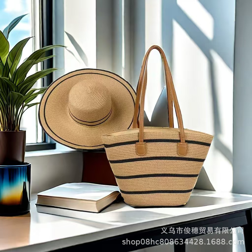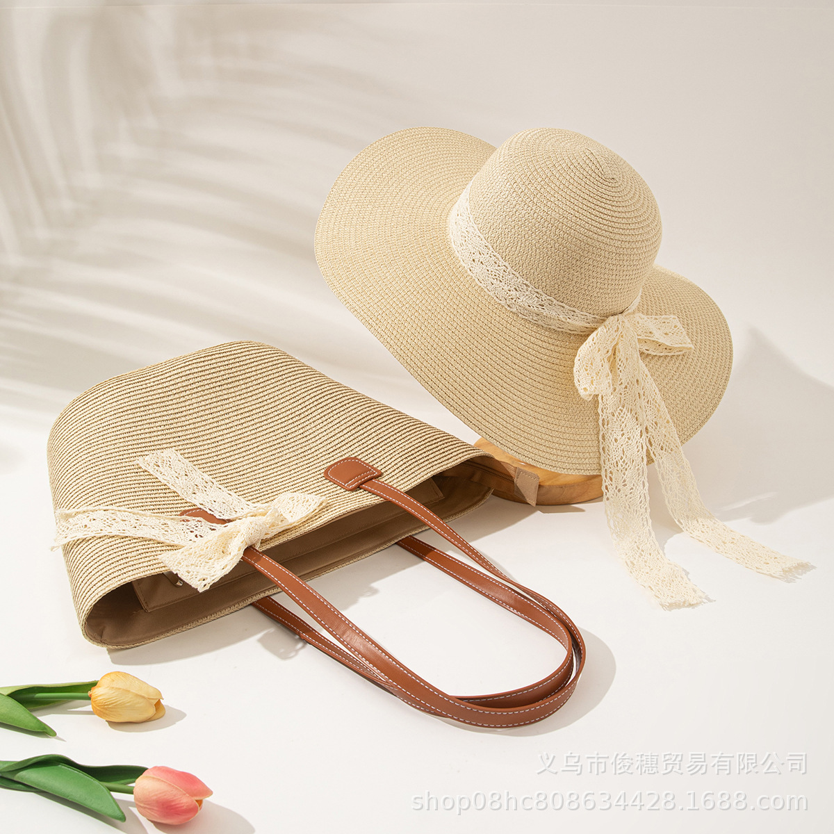 국경 간 밀짚 모자 가방 세트 해변 휴가 패션 올 매치 태양 보호 및 양산 여행 대용량 토트 백