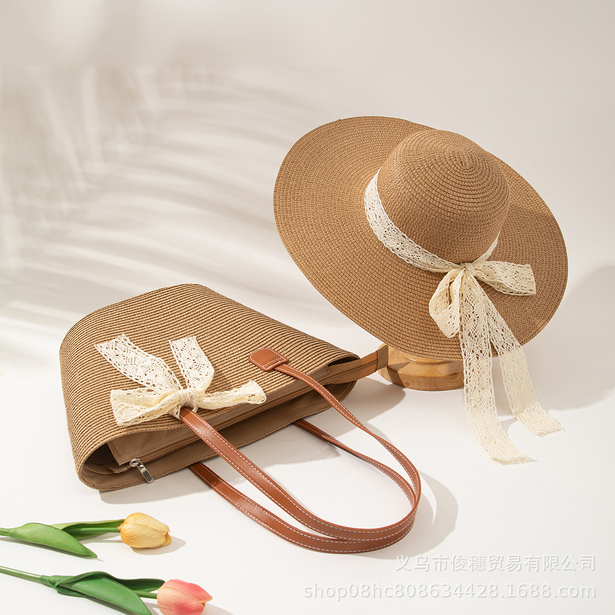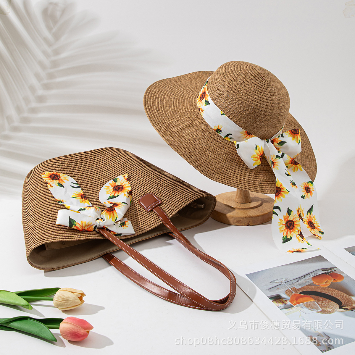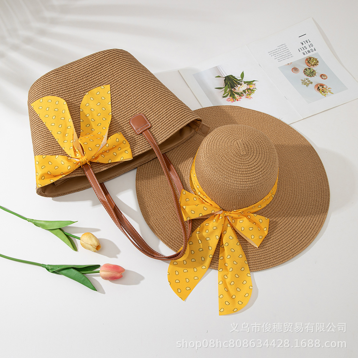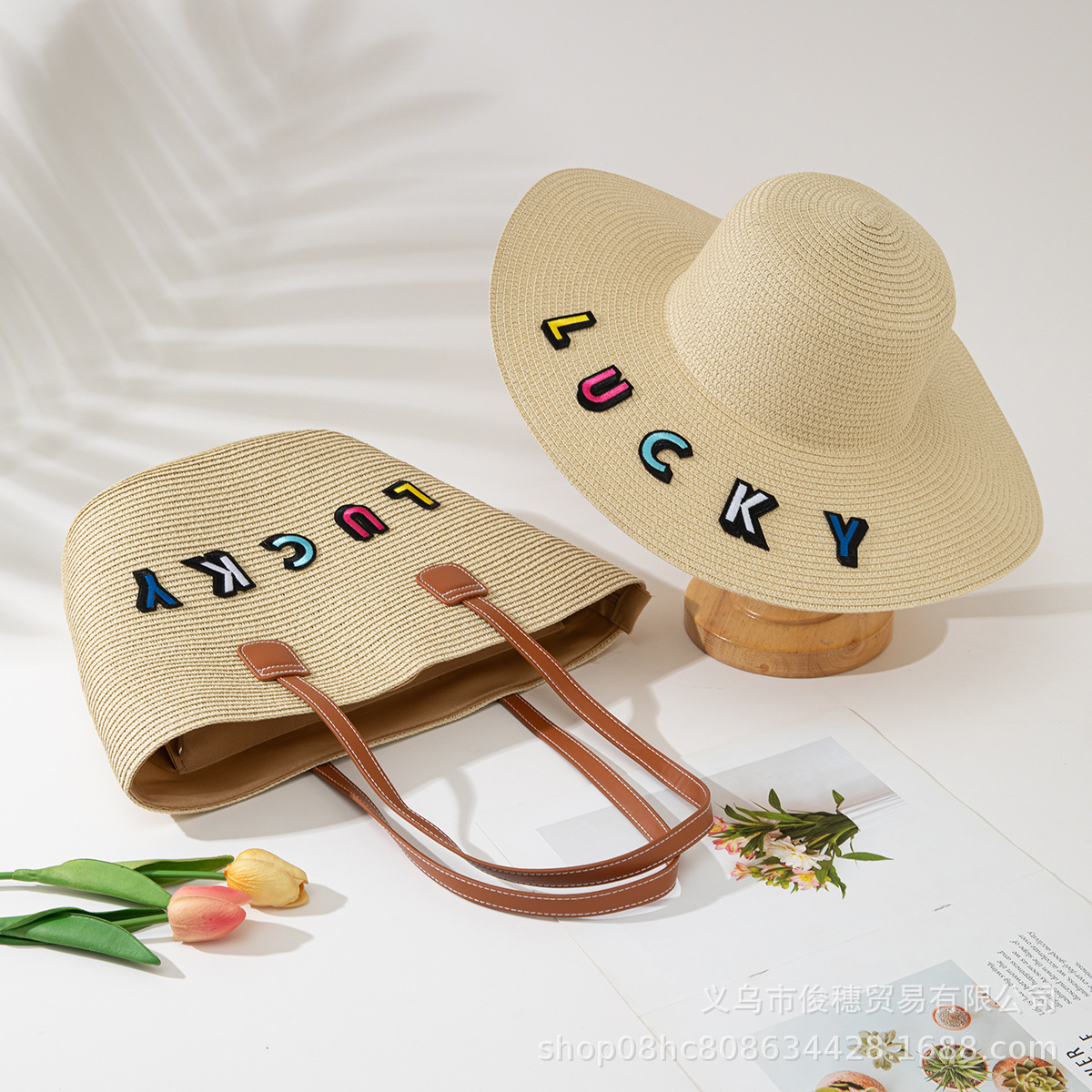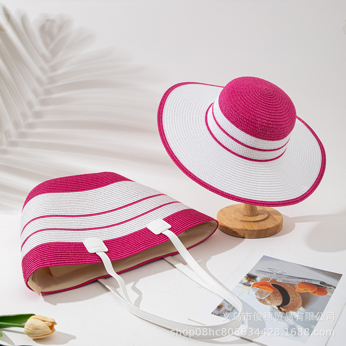 국경 간 밀짚 모자 가방 세트 해변 휴가 패션 올 매치 태양 보호 및 양산 여행 대용량 토트 백