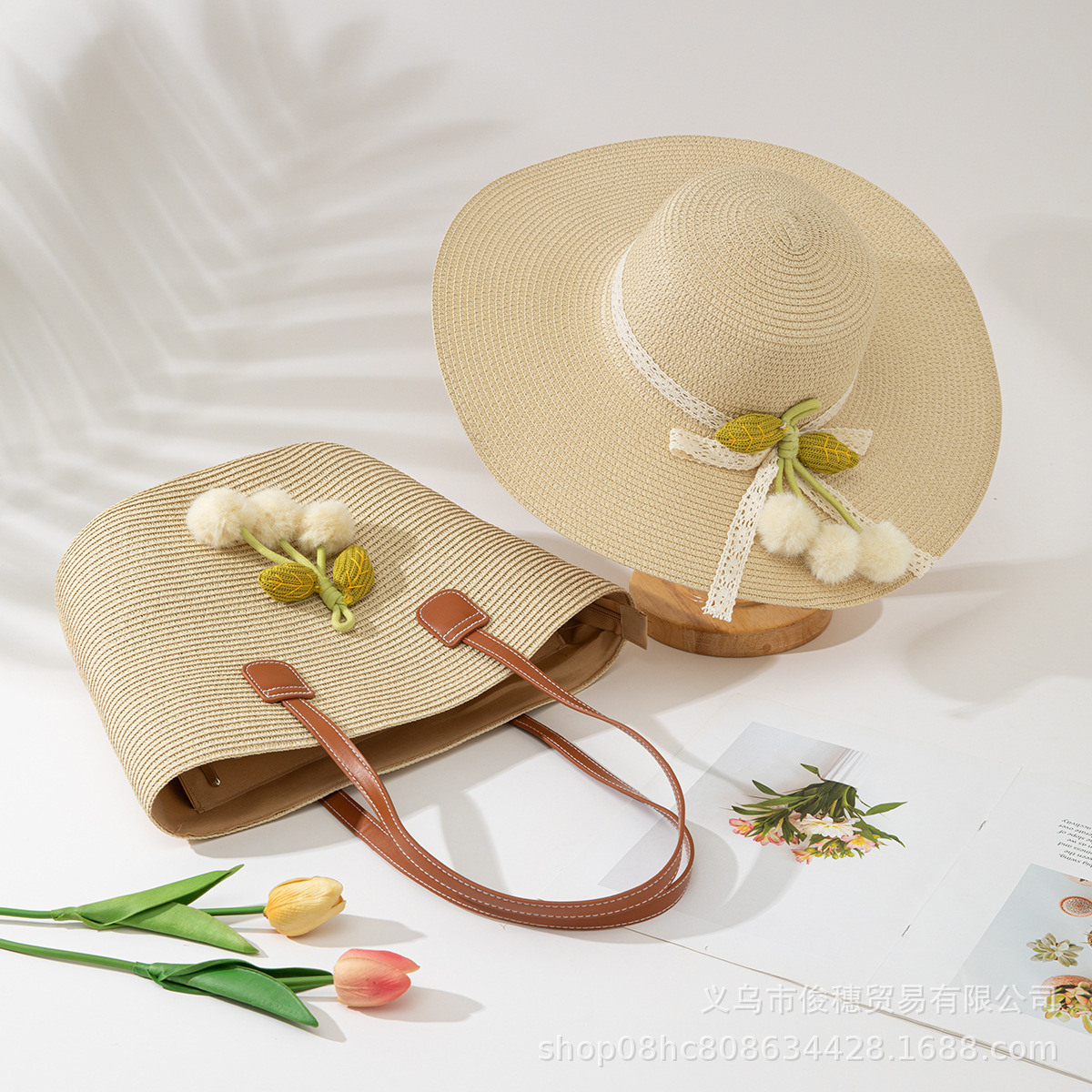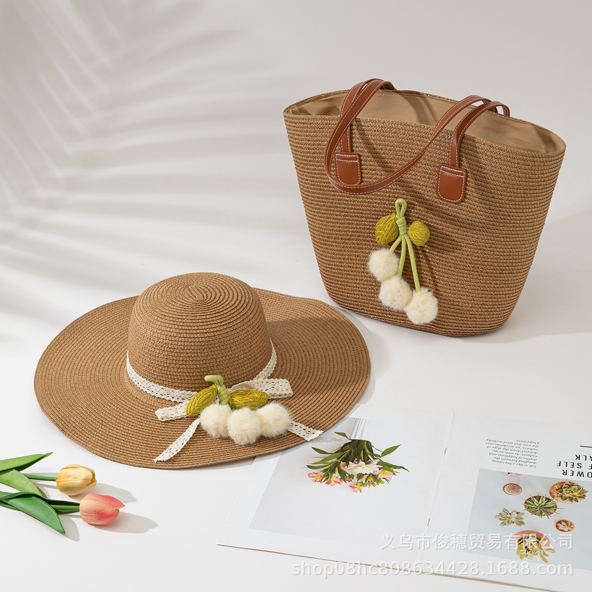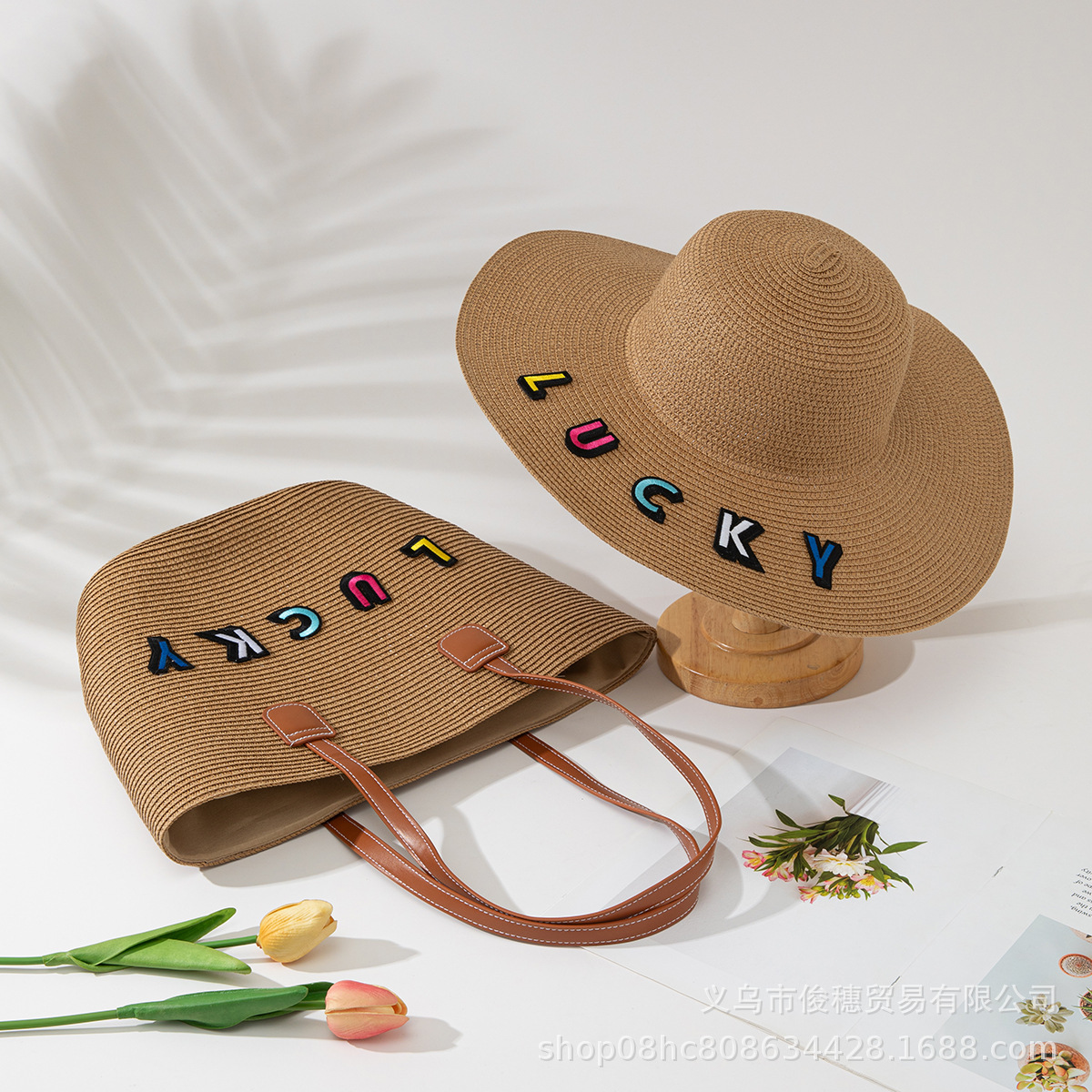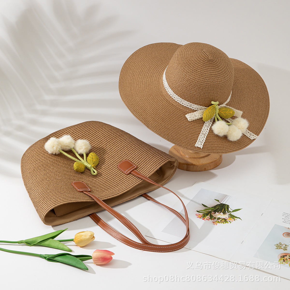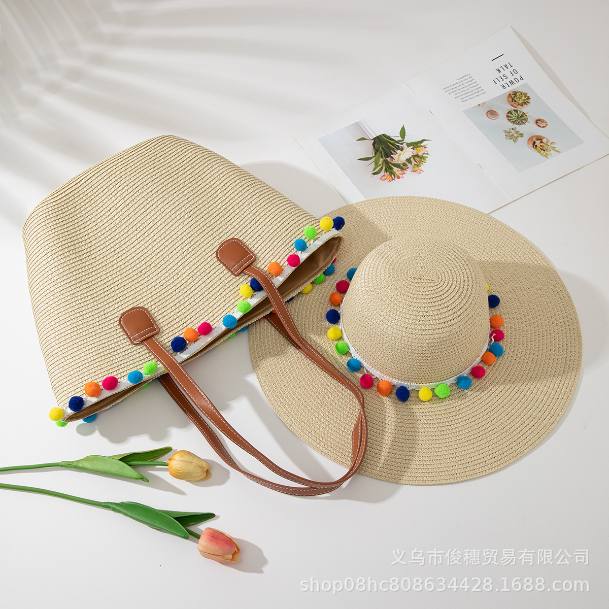 국경 간 밀짚 모자 가방 세트 해변 휴가 패션 올 매치 태양 보호 및 양산 여행 대용량 토트 백