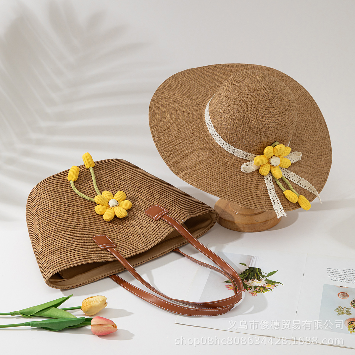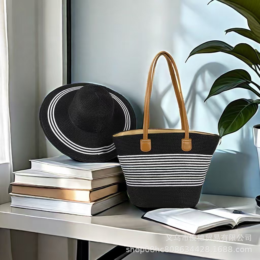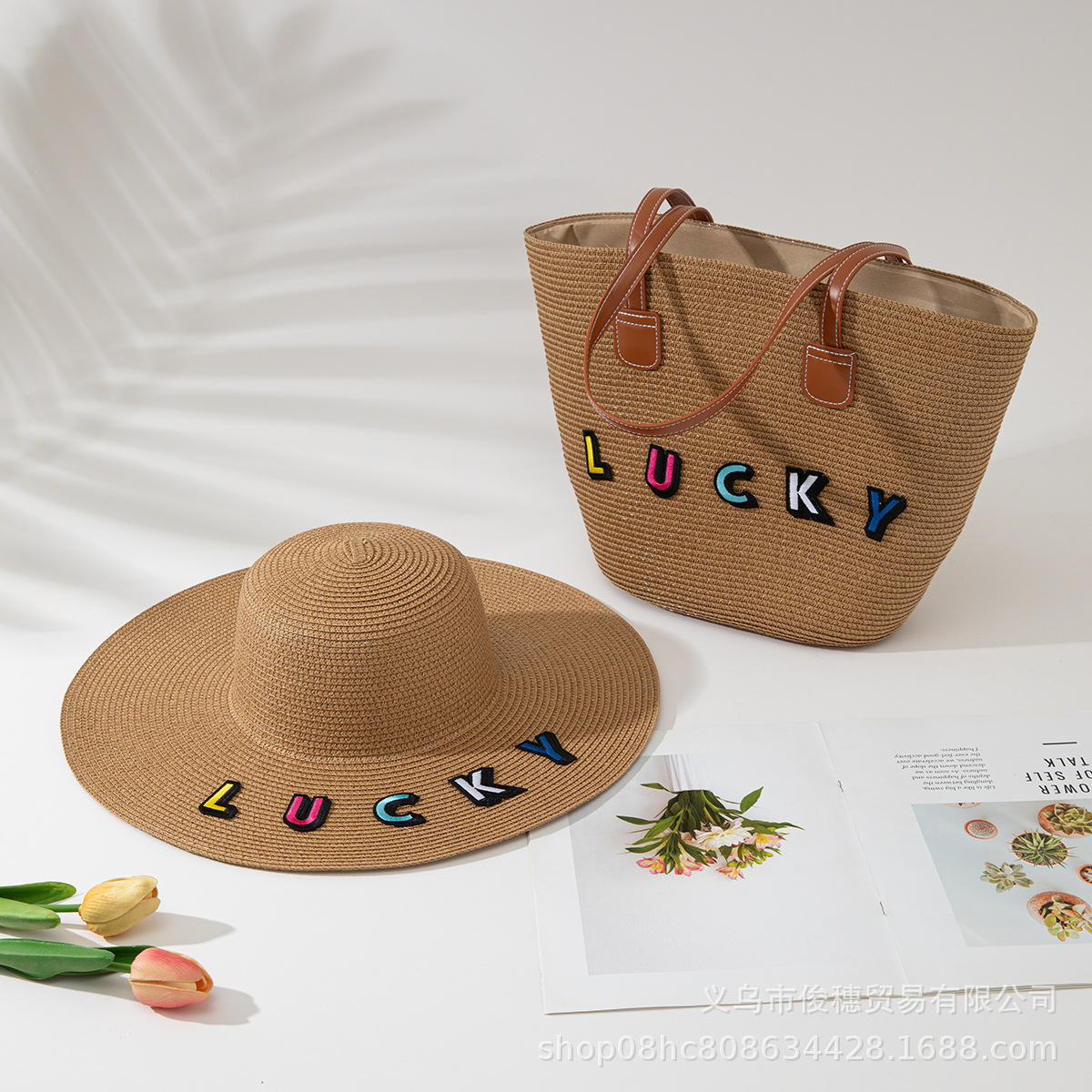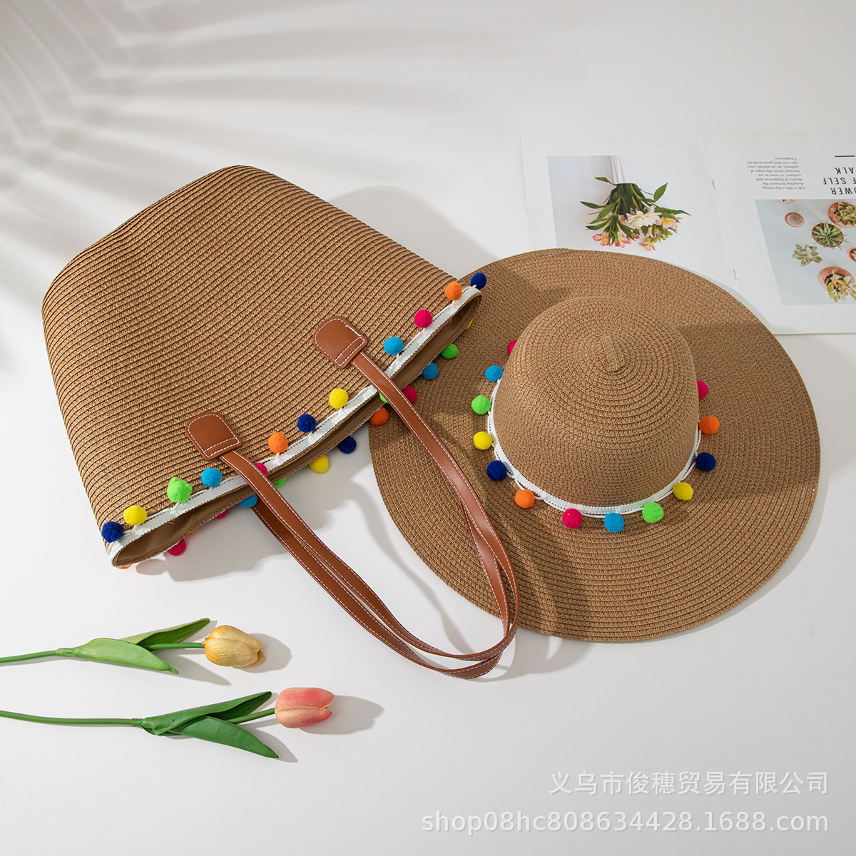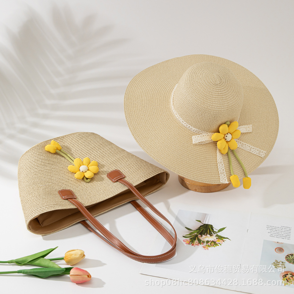 국경 간 밀짚 모자 가방 세트 해변 휴가 패션 올 매치 태양 보호 및 양산 여행 대용량 토트 백
