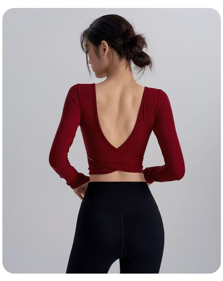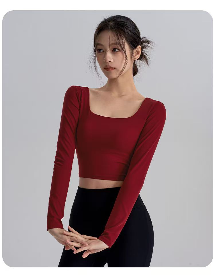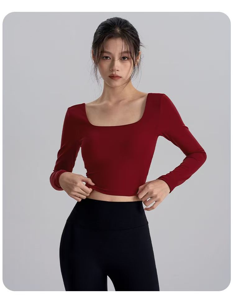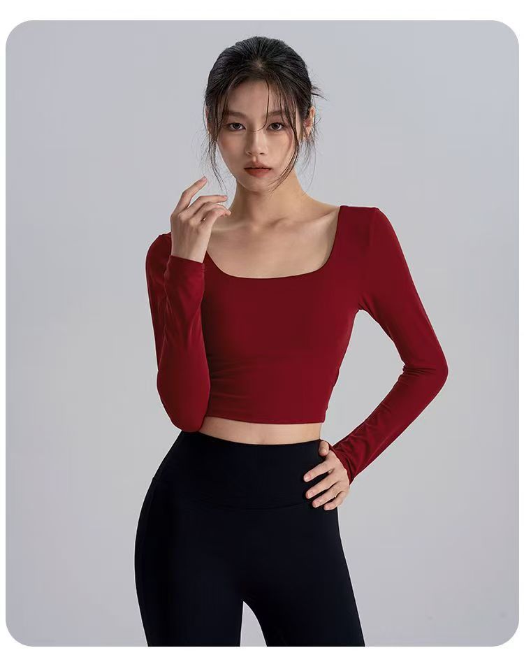 2025 새로운 스타일의 뷰티 백 요가 옷 가슴 패드 새해 붉은 광장 칼라 슬림 룩 탑 필라테스 긴 소매 실행