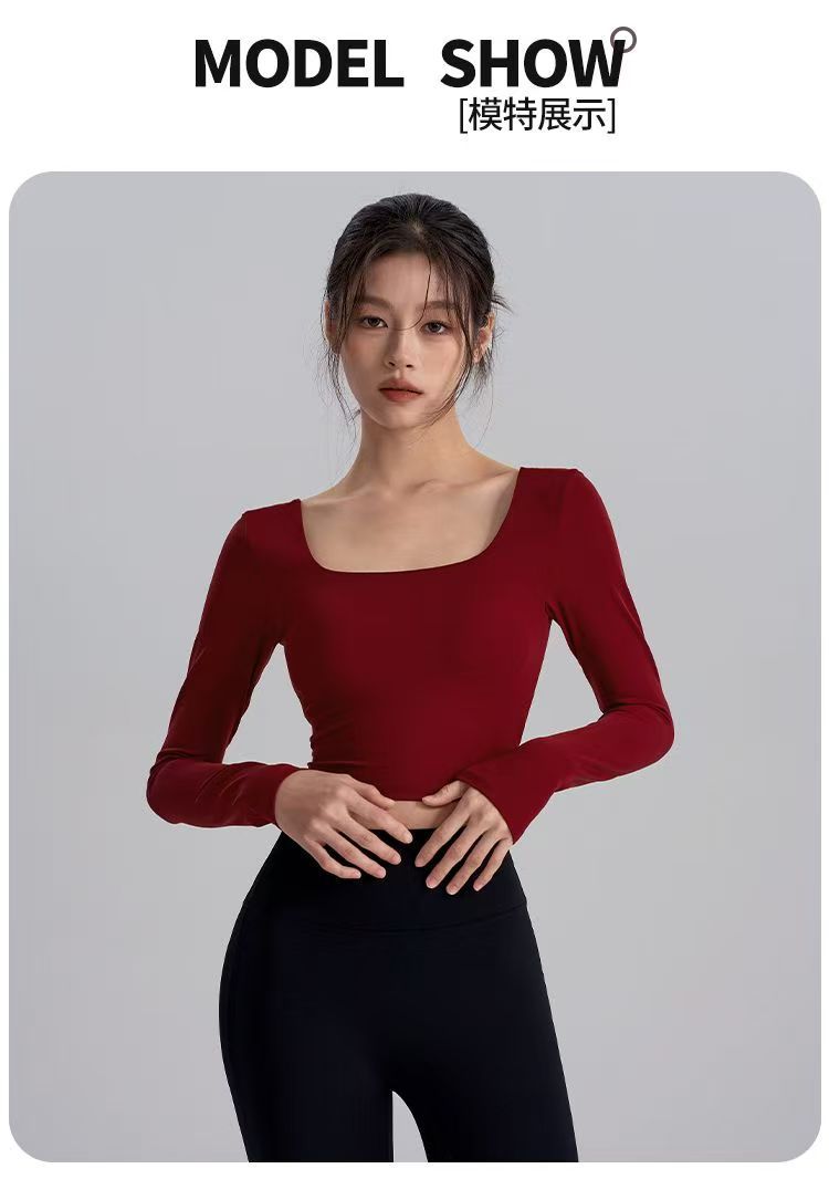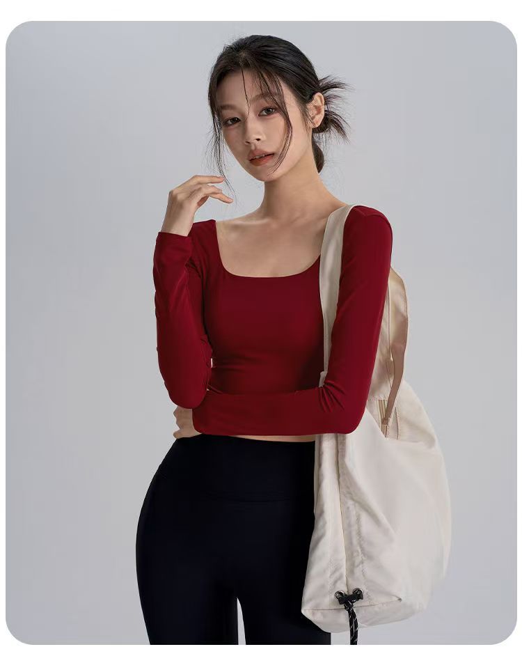2025 새로운 스타일의 뷰티 백 요가 옷 가슴 패드 새해 붉은 광장 칼라 슬림 룩 탑 필라테스 긴 소매 실행스토어 가기
